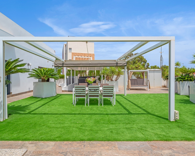 En Villamartín, Orihuela Costa, se encuentra esta moderna villa independiente construida en 2018. Con una superficie construida de 113 m² sobre una generosa parcela de 464 m², la vivienda ofrece un diseño contemporáneo y una distribución funcional pensada para disfrutar al máximo del estilo de vida mediterráneo. La orientación sur garantiza luz natural durante todo el día, aportando calidez y confort a todos los espacios. La villa cuenta con tres amplios dormitorios, todos ellos con armarios empotrados, y dos baños completos, uno de ellos en suite dentro del dormitorio principal. La cocina, de estilo abierto, se integra perfectamente con el comedor y el salón, creando una zona de día luminosa y acogedora, con acceso directo a la terraza y la piscina. También dispone de un práctico cuarto de lavandería independiente. El exterior de la vivienda destaca por su piscina privada rodeada de zonas ajardinadas de fácil mantenimiento, una terraza cubierta ideal para comidas al aire libre, un comedor exterior con pérgola y césped artificial, así como un amplio solárium en la azotea. Además, la propiedad ofrece aparcamiento dentro de la parcela, incluyendo un carport cubierto. Entre sus extras se incluyen aire acondicionado por conductos, paneles solares, una distribución bien pensada y materiales de alta calidad. La vivienda está situada en una zona residencial tranquila pero muy bien conectada, a pocos minutos de campos de golf, centros comerciales como Zenia Boulevard y las mejores playas de Orihuela Costa. Esta villa representa una excelente opción tanto como residencia permanente como para quienes buscan una inversión segura en una de las zonas más demandadas de la Costa Blanca.