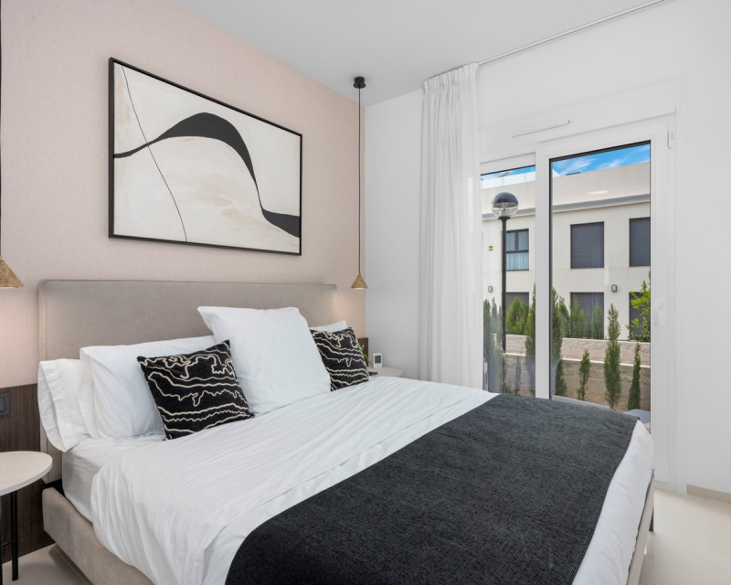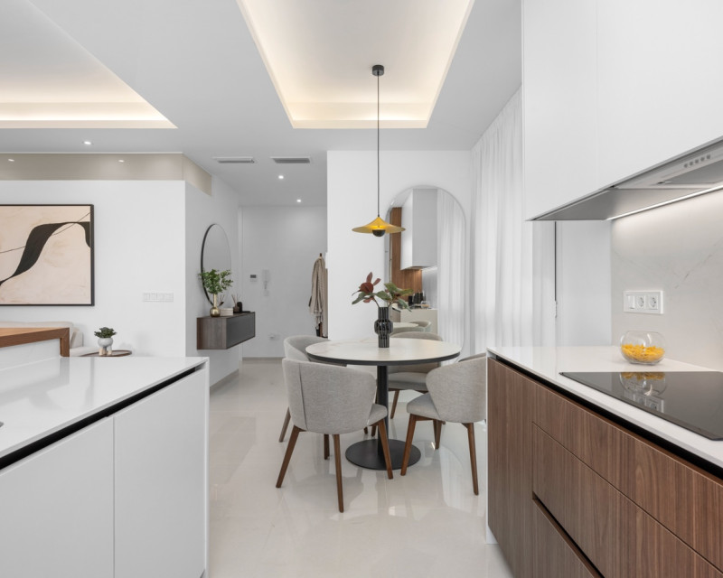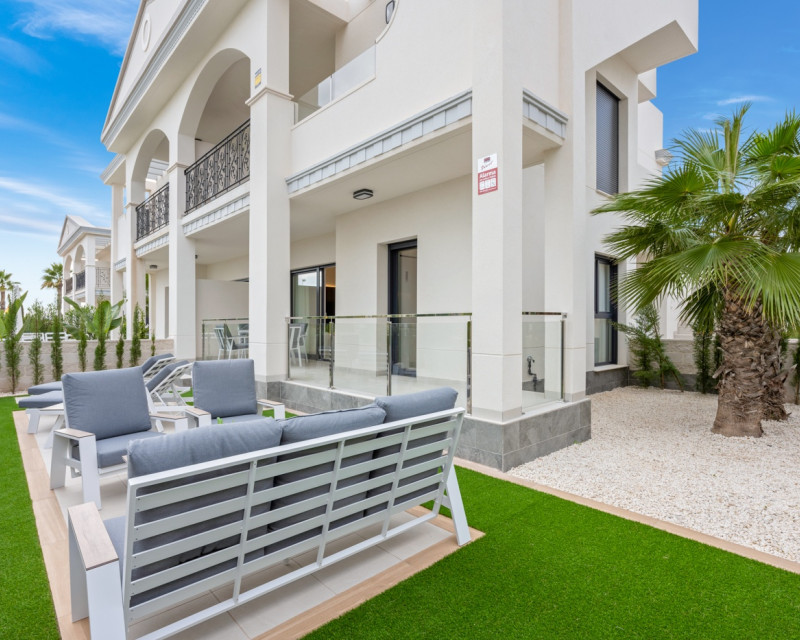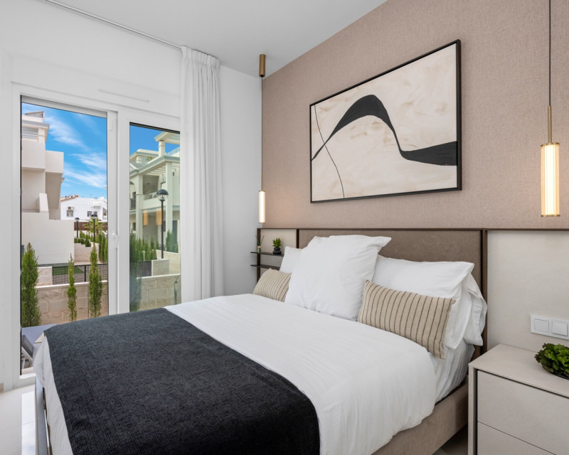 Exclusivo apartamento de obra nueva (2024) ubicado en el prestigioso residencial Adhara, en Ciudad Quesada. La vivienda ofrece un diseño moderno y funcional, con dos amplios dormitorios dobles, uno de ellos con baño en suite para mayor comodidad. El salón destaca por su ambiente acogedor y contemporáneo, integrado en un espacio abierto junto a la cocina, completamente equipada con electrodomésticos de alta calidad. Gracias a su distribución, el salón y la cocina se conectan directamente con la terraza principal, proporcionando abundante luz natural y una perfecta transición hacia el exterior. Además, cuenta con una segunda terraza en la parte trasera, creando diferentes zonas para disfrutar del aire libre. Junto a esta terraza, y separada por árboles frutales que aportan privacidad, se encuentra la plaza de aparcamiento privado dentro de la propia parcela. Entre sus prestaciones de confort, el apartamento dispone de aire acondicionado centralizado frío/calor y suelo radiante en los baños. Se entrega completamente amueblado y listo para entrar a vivir. La comunidad ofrece excelentes zonas comunes, con dos piscinas: una situada al frente de la vivienda y otra en la parte posterior, rodeadas de amplios espacios para tomar el sol y relajarse. Su ubicación es ideal: a solo 5 minutos en coche del centro de Ciudad Quesada y a menos de 10 minutos de las hermosas playas más cercanas.