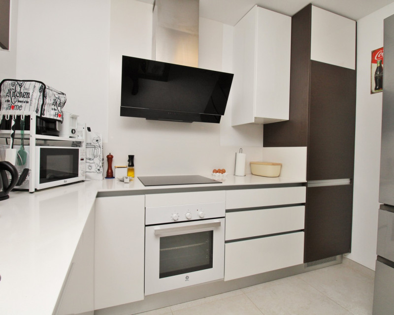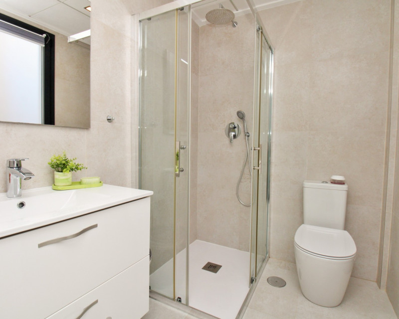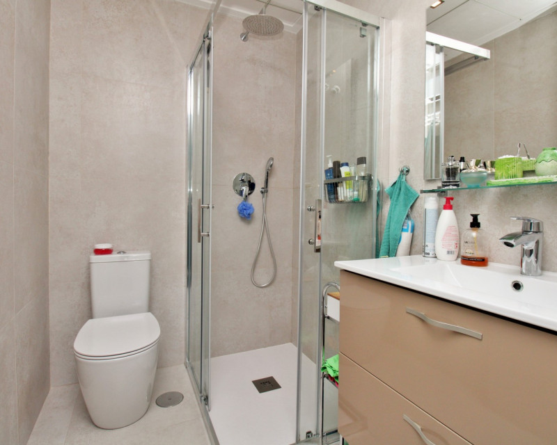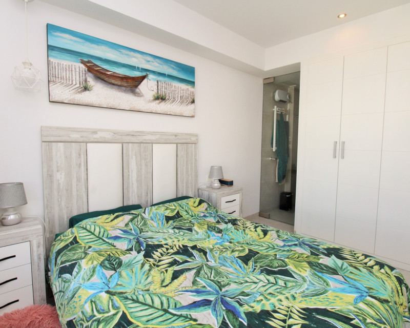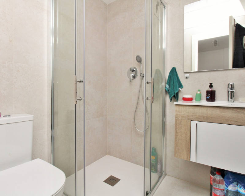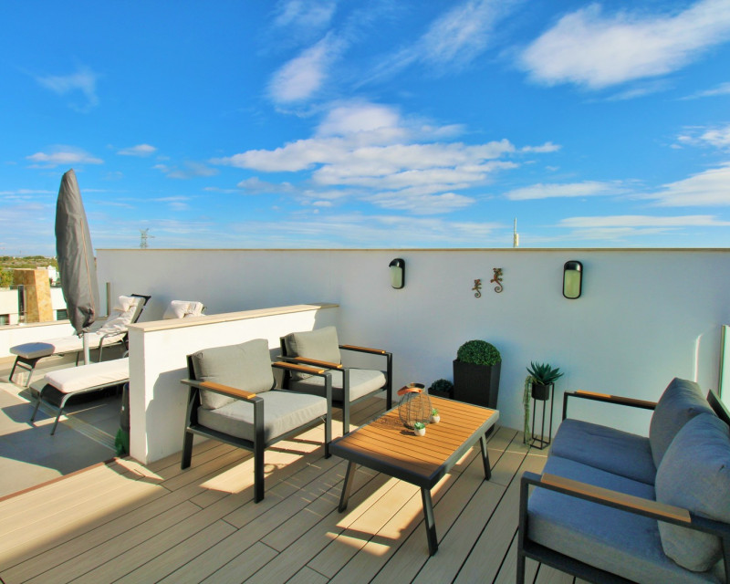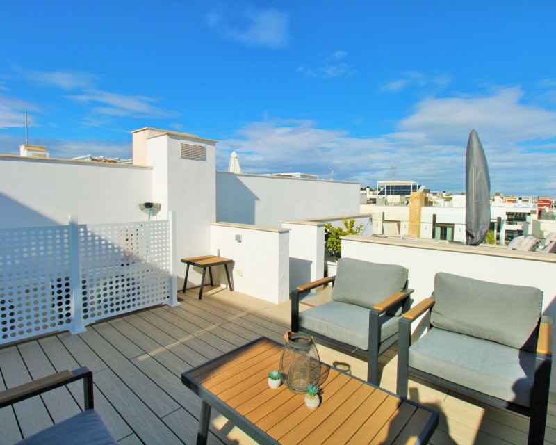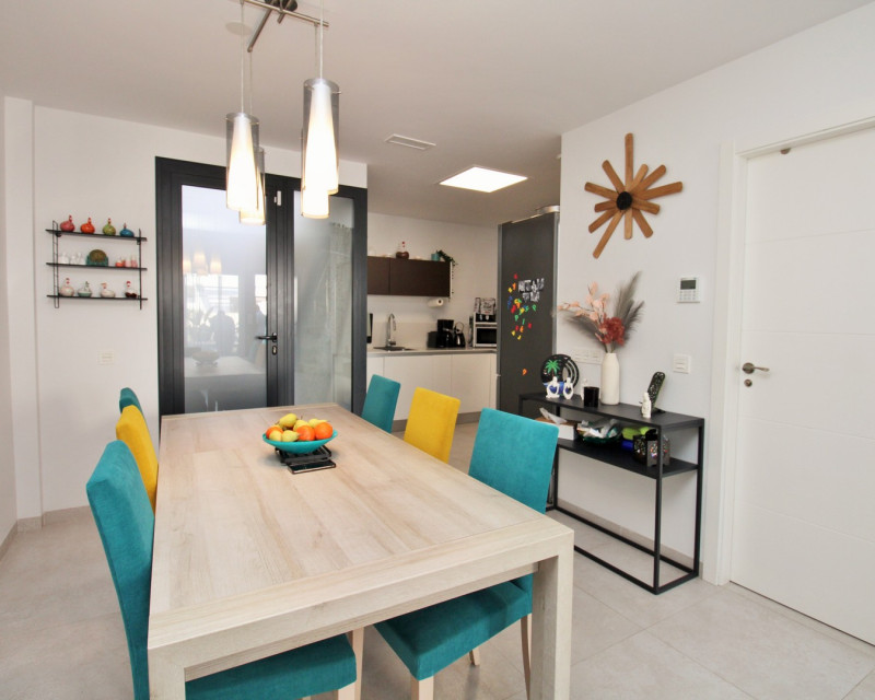 Este moderno adosado de 2 dormitorios y 3 baños se encuentra en la cotizada zona de Pau 26 en Villamartin, ofreciendo un estilo de vida contemporáneo cerca de todos los servicios. Construido en 2019, la propiedad se presenta en excelente estado y es ideal como residencia habitual, vivienda vacacional o inversión. La vivienda dispone de una terraza delantera privada con piscina, perfecta para disfrutar del exterior. En la planta baja encontramos un amplio salón-comedor de concepto abierto con cocina totalmente equipada en la parte trasera, además de un lavadero independiente. También hay un baño en planta baja con ducha tipo walk-in. En la planta superior se sitúan dos dormitorios dobles, ambos con armarios empotrados y baños en suite. Uno de los dormitorios cuenta además con una terraza privada. Mediante escaleras exteriores se accede a un solárium privado en la azotea, con espacio suficiente para zona de estar y tumbonas. La propiedad forma parte de una comunidad bien cuidada con acceso a piscina comunitaria. Ubicada cerca de Villamartin Plaza, campos de golf, supermercados, bares y restaurantes, y a poca distancia en coche de Zenia Boulevard y las playas de Orihuela Costa.