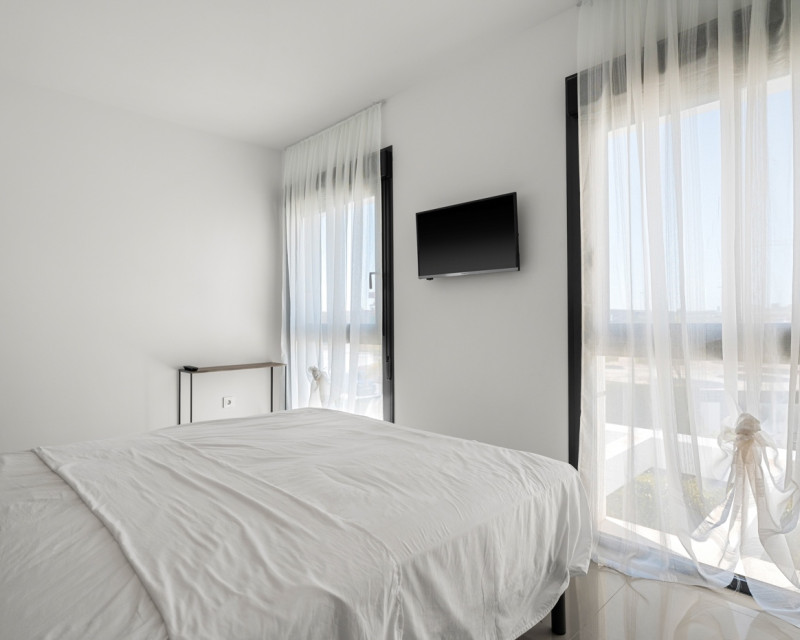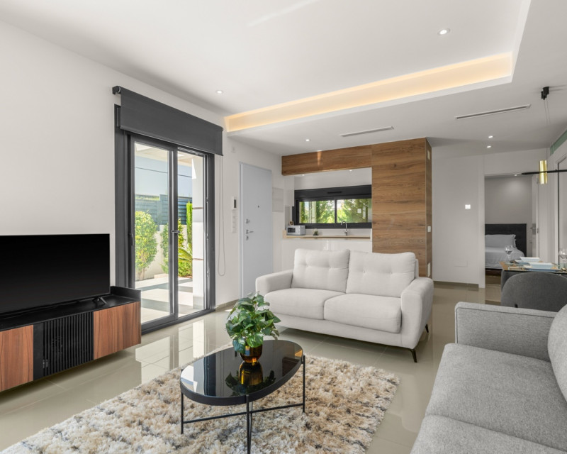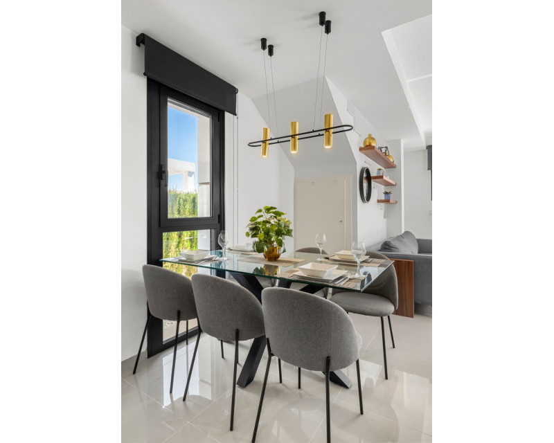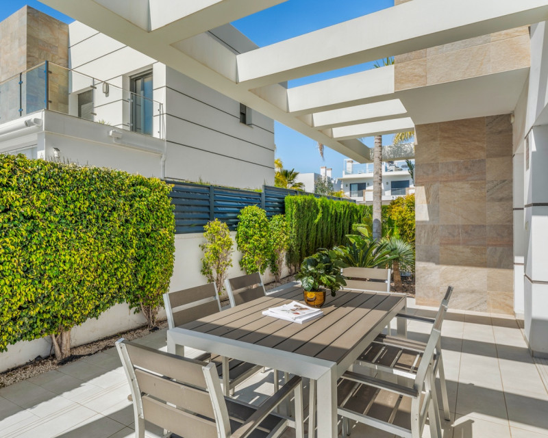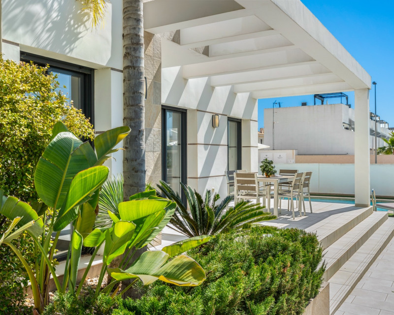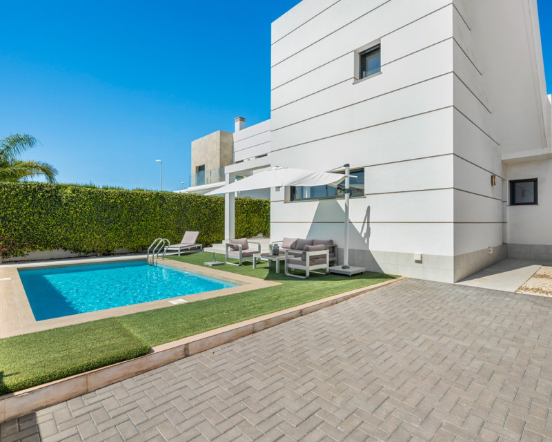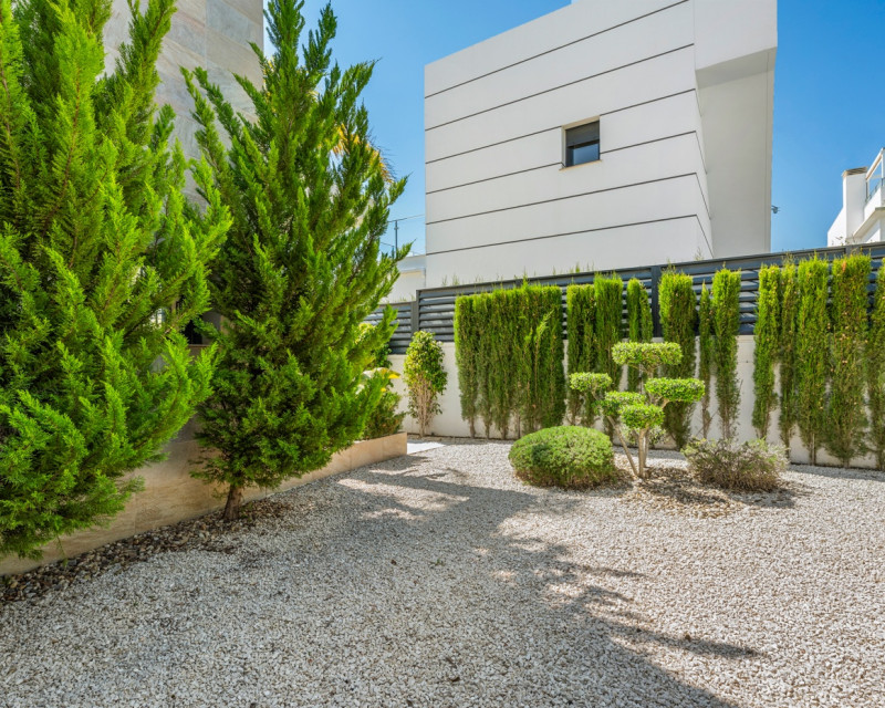 Descubre esta elegante villa contemporánea distribuida de dos plantas, diseñada para ofrecer comodidad, estilo y funcionalidad. La Vivienda cuenta con 3 amplios dormitorios dobles y 3 baños. En la planta principal encontrarás un luminoso salón-comedor con acceso directo al exterior, una cocina parcialmente abierta totalmente equipada, un dormitorio y un baño completo. Además, dispone de un práctico espacio de almacenamiento. La planta superior consta con dos dormitorios, ambos con baño en suite. El dormitorio principal destaca por su vestidor, mientras que los otros dormitorios cuentan con armarios empotrados. Desde esta planta se accede a una amplia terraza que conecta con un espectacular solárium. La vivienda está equipada con aire acondicionado centralizado (frío/calor), suelo radiante en todos los baños, ventanas de doble acristalamiento y puerta de entrada de seguridad. También cuenta con elegante iluminación LED integrada en el salón y en dos de los dormitorios. Zona exteriorLa villa se sitúa en una parcela orientada al sur, ideal para disfrutar del sol durante todo el día. Dispone de piscina privada, zona de aparcamiento dentro de la parcela y un acogedor espacio de comedor exterior junto a la entrada. Además, el jardín incluye un cuarto de lavandería/trastero. En la planta superior se encuentra una terraza adicional, y la propiedad cuenta también con un solárium de aproximadamente 50 m² con bonitas vistas abiertas a los alrededores. UbicaciónLa vivienda se encuentra a poca distancia a pie de supermercados, restaurantes, cafeterías y todos los servicios necesarios, lo que la convierte en una opción ideal tanto como residencia habitual como para inversión.