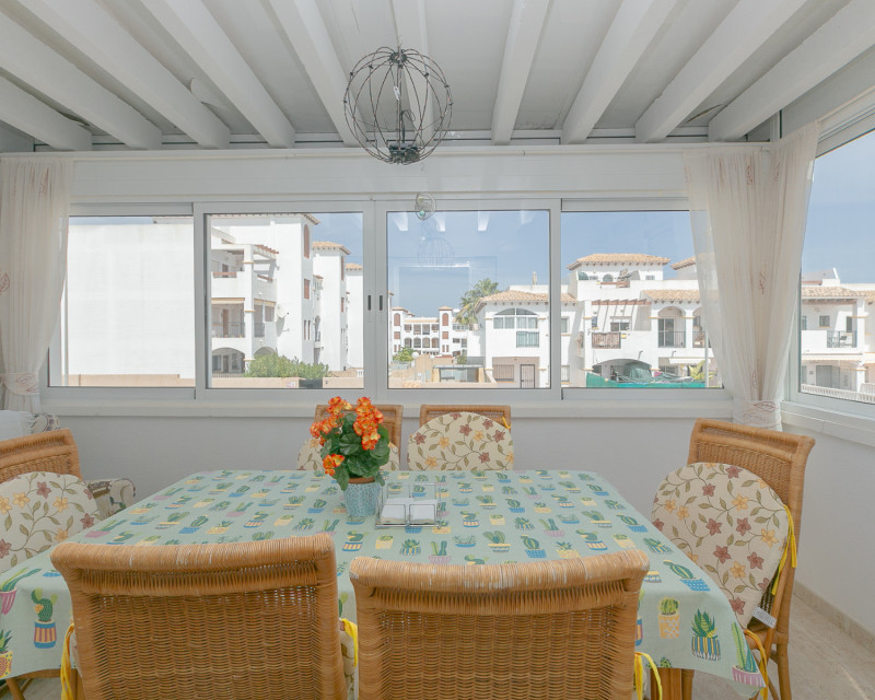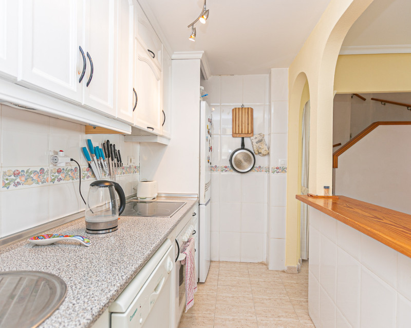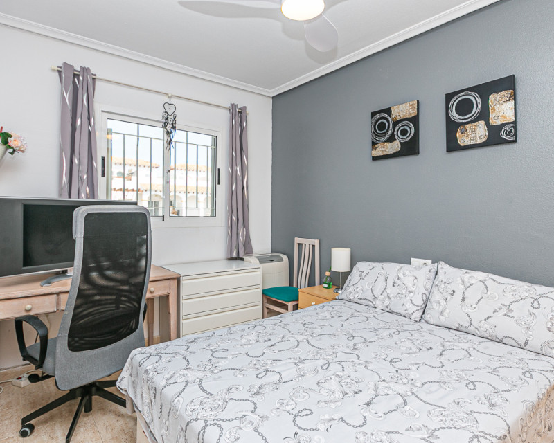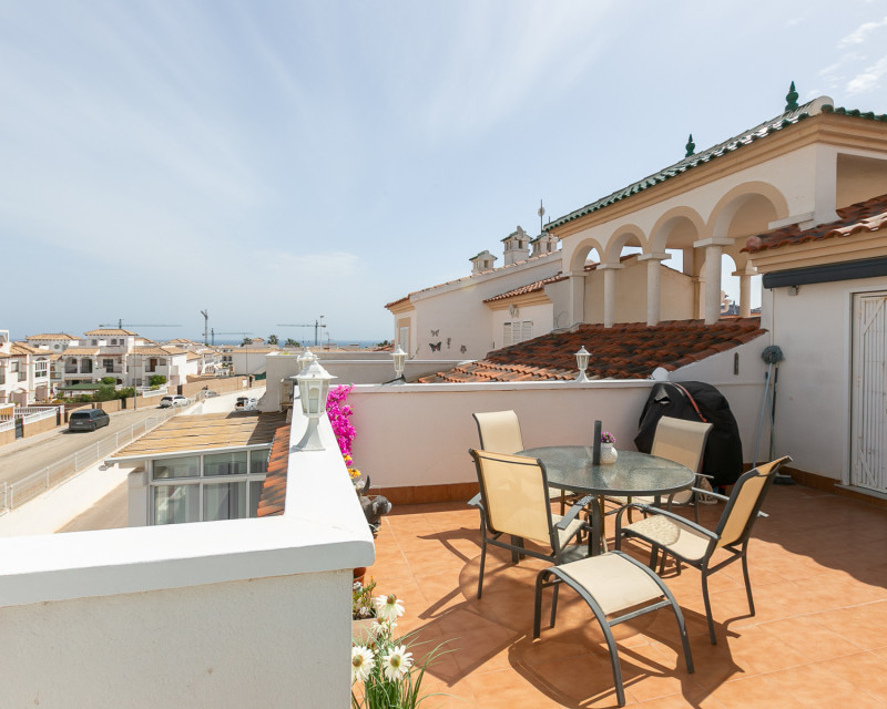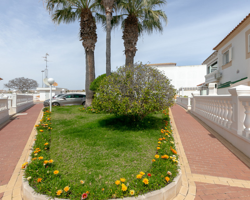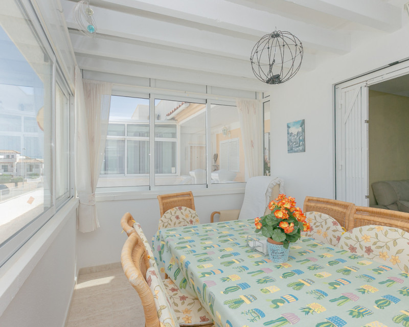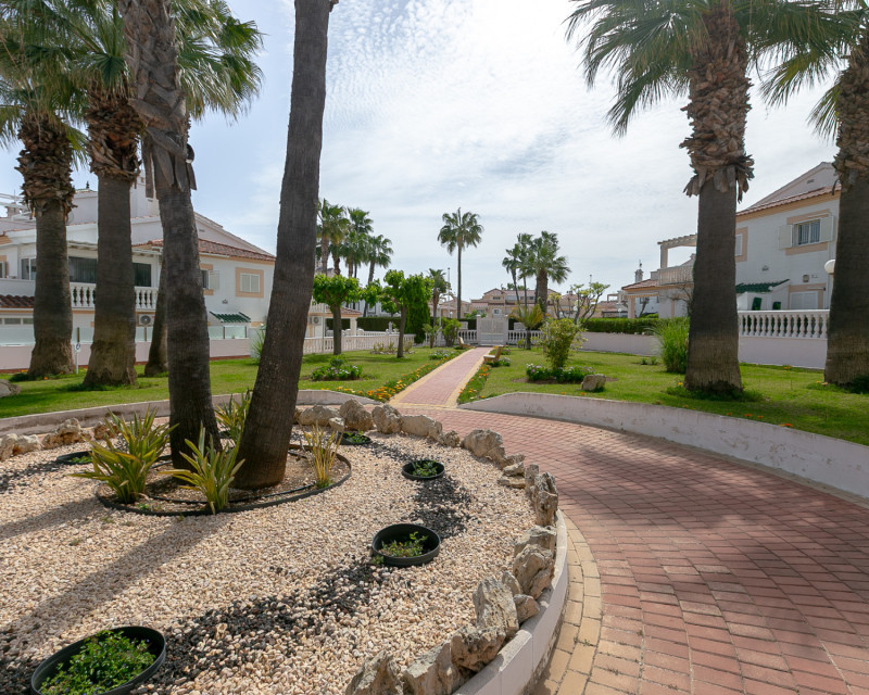 Te presentamos este fantástico bungalow en planta alta situado en el exclusivo residencial cerrado Zeniamar III, una de las urbanizaciones más demandadas de la zona por su tranquilidad, seguridad y excelentes zonas comunes. La vivienda cuenta con acceso mediante escaleras que dan servicio únicamente a dos propiedades, lo que aporta privacidad y comodidad. Al entrar, nos recibe un amplio y luminoso salón, con acceso directo a una terraza acristalada, actualmente utilizada como comedor, ideal para disfrutarla durante todo el año. En esta misma planta encontramos dos dormitorios, una cocina independiente con zona de lavadero, un baño completo y un práctico trastero. A pesar de su orientación norte, la vivienda disfruta de excelente luminosidad y sol en la terraza superior, lo que aporta un valor añadido muy importante. En la planta superior se ubica un tercer dormitorio con baño en suite (ducha y lavabo). Desde esta estancia se accede a una amplia terraza soleada con impresionantes vistas al mar, un espacio perfecto para relajarse, tomar el sol o disfrutar de veladas al aire libre. La propiedad se vende parcialmente amueblada, incluyendo electrodomésticos (excepto frigorífico en la planta superior y objetos personales). Dispone además de dos unidades de aire acondicionado y ventiladores de techo, lo que garantiza confort durante todo el año. El residencial ofrece una espectacular piscina comunitaria rodeada de zonas verdes muy cuidadas, ideal para el disfrute familiar y el descanso. Además, la vivienda incluye plaza de aparcamiento exterior dentro del complejo. Su ubicación es inmejorable: a poca distancia de la zona comercial donde se encuentra Abbey Tavern, con bares, restaurantes y supermercado. A tan solo 3 km de la playa de Punta Prima, a 2,5 km del conocido centro comercial La Zenia Boulevard, y a 2 km de Punta Prima con su amplia oferta de ocio y restauración. Una vivienda ideal tanto para residencia habitual durante todo el año como para disfrutar de vacaciones, combinando espacio, confort, ubicación y vistas al mar. ¡No deje pasar esta oportunidad y contáctenos hoy mismo para concertar una visita!