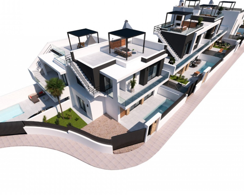 ¡Bienvenido al retiro de tus sueños en Los Montesinos, Alicante! Estas nuevas villas adosadas ofrecen el epítome de la vida de lujo en el corazón de la Costa Blanca. Al entrar en estas impresionantes villas, será recibido por un diseño espacioso diseñado para brindar comodidad y elegancia. El elegante exterior marca la pauta para los exquisitos interiores adornados con hermosos materiales, creando una combinación armoniosa de sofisticación y encanto. Cada villa cuenta con tres dormitorios y tres baños, lo que proporciona un amplio espacio para la relajación y la privacidad. La suite principal es un santuario de indulgencia, con baño privado y vistas serenas del paisaje circundante. El entretenimiento y la relajación le esperan al aire libre, donde su propia piscina privada le invita a darse un refrescante chapuzón en los cálidos días de verano. Para aquellos que buscan vistas panorámicas, el solárium opcional ofrece impresionantes vistas de los tranquilos lagos y el verde campo, proporcionando el telón de fondo perfecto para reuniones inolvidables con amigos y familiares. La comodidad es clave con estacionamiento privado que garantiza un acceso sin complicaciones a su oasis de tranquilidad. Manténgase fresco y cómodo durante todo el año con el aire acondicionado preinstalado, lo que garantiza el clima perfecto sin importar la temporada. Situadas muy cerca de los campos de golf y de la vibrante vida urbana, estas villas ofrecen lo mejor de ambos mundos. Ya sea que esté jugando en calles de clase mundial o explorando las bulliciosas calles de las ciudades cercanas, un sinfín de oportunidades de ocio y aventura le esperan a sólo unos minutos de su puerta. Experimente el pináculo de la vida mediterránea en estas lujosas villas en Los Montesinos, donde cada día se siente como unas vacaciones en el paraíso. Parcelas de 148-195 m2.