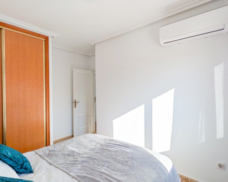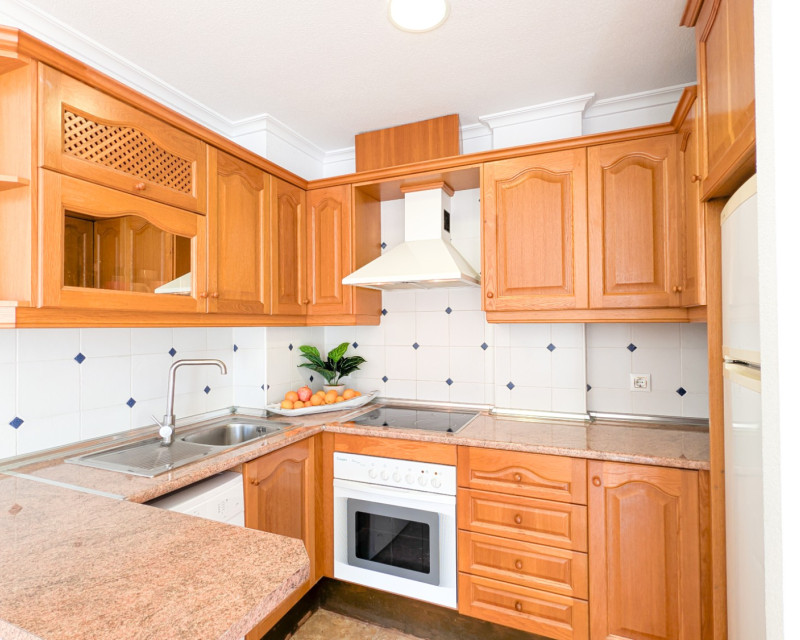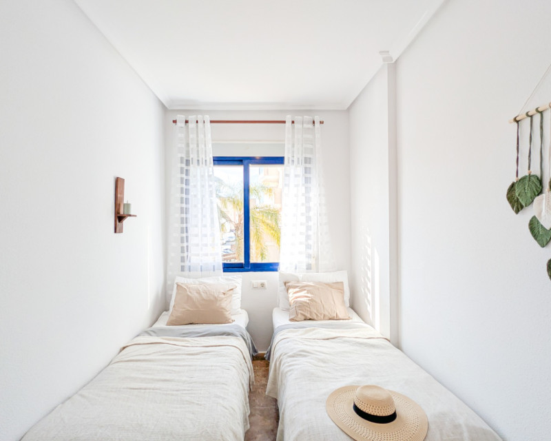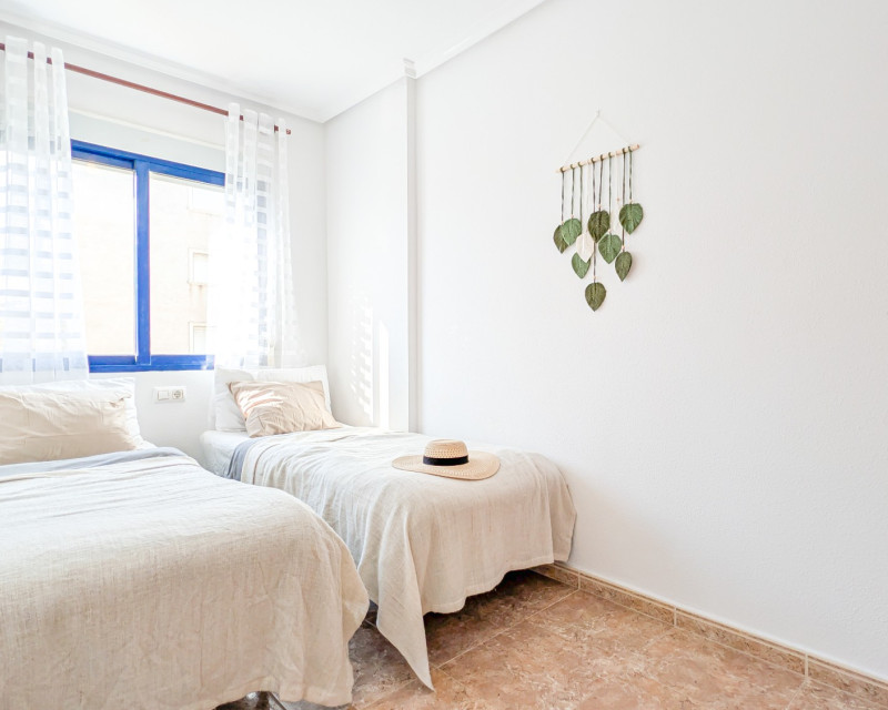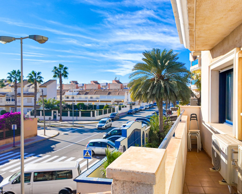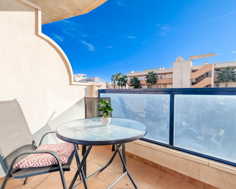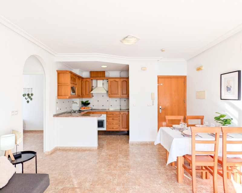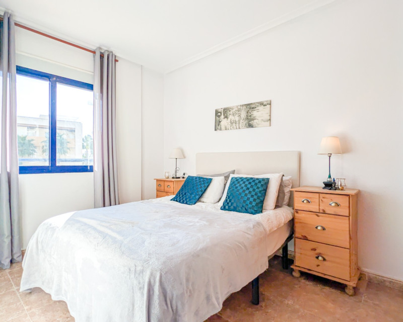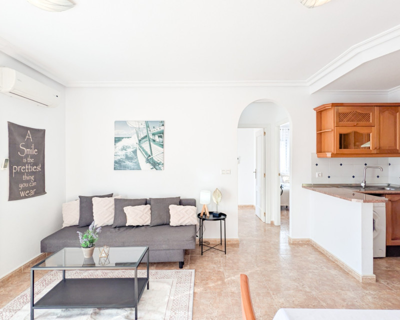 I et av Cabo Roigs mest ettertraktede områder, kun fem minutters gange fra stranden, ligger denne stilfulle og velplanlagte leiligheten i det populære komplekset Playa Marina 1. Her får du en sjelden kombinasjon av sentral beliggenhet, fullstendig ro og helårs feriefølelse, i et område med høy etterspørsel etter korttidsutleie. Leiligheten vender mot den rolige siden av bygget, med utsikt over det palmeomkransede bassengområdet – en grønn og harmonisk oase. Selv om restauranter, kafeer og servicetilbud ligger rett utenfor den ene inngangen, er atmosfæren i boligen stille og privat. Den romslige stuen har åpen planløsning mot kjøkkenet og et godt lysinnslipp. Her finnes aircondition, og fra stuen har du direkte utgang til den sydvendte balkongen, perfekt for lange frokoster og avslappende ettermiddager i solen. Kjøkkenet er funksjonelt integrert og utstyrt med blant annet vaskemaskin. Det store soverommet har aircondition og innebygd garderobe, som gir et behagelig inneklima. Det andre soverommet har utsikt mot bassengområdet og også garderobe, og passer utmerket som gjesterom eller hjemmekontor. Leiligheten inkluderer garasjeplass, noe som gir ekstra komfort. Playa Marina 1 er et veldrevet kompleks med to separate innganger – én med direkte adkomst til Cabo Roigs livlige restaurantområde, og én via bassengområdet for en roligere hverdag. Komplekset er spesielt tilrettelagt for turistleiligheter, noe som er en stor fordel i dagens marked hvor turistlisenser er blitt stadig vanskeligere å få. Dette gjør boligen svært attraktiv for kjøpere som ønsker å kombinere eget bruk med utleie, i et område med dokumentert sterk etterspørsel. En bolig som forener livsstil, trygghet og langsiktig fleksibilitet – rett ved Middelhavet.