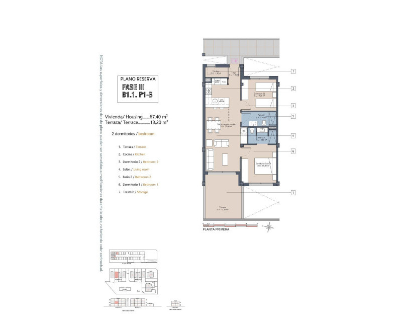 Nytt boligkompleks nær Serena Golf og Mar Menor i Los Alcazares Moderne kystliv på Costa Calida Oppdag dette attraktive nye boligkomplekset i Los Alcazares, en av de mest populære kystbyene på Costa Calida. Dette boligkomplekset ligger bare 500 meter fra strendene ved Mar Menor og i gangavstand fra sentrum, og tilbyr en utmerket kombinasjon av kystliv, golfomgivelser og hverdagsbekvemmeligheter. Los Alcazares er kjent for sin avslappede atmosfære, lange promenader, varme grunne farvann og et bredt utvalg av restauranter, butikker og tjenester som er åpne hele året. Moderne leiligheter designet for komfort Utbyggingen består av 29 moderne boliger med 2 eller 3 soverom, designet med rene arkitektoniske linjer og høykvalitets finish. Kjøpere kan velge mellom leiligheter i første etasje med privat hage og terrasse, leiligheter i midtre etasje med romslige terrasser eller penthouse-leiligheter med privat terrasse og solarium på taket med åpen utsikt. Mange av eiendommene har utsikt mot Serena Golf og Mar Menor, noe som skaper et rolig og behagelig bomiljø. Alle boligene er designet for å maksimere naturlig lys og funksjonalitet, noe som gjør dem ideelle som permanent bolig, feriebolig eller investeringseiendom. Høy kvalitet og fellesarealer Hver eiendom har en privat parkeringsplass og et bod. Spesifikasjonene er designet for å gi komfort og energieffektivitet, inkludert doble vinduer med termisk barriere, forhåndsinstallert luftkondisjonering, aerotermisk system for varmt vann, elektriske persienner i soverommene og et komplett belysningspakke for innendørs og utendørs bruk. Badene leveres fullt utstyrt med møbler, speil og dusjvegg. Beboerne kan nyte attraktive fellesarealer med anlagte hager og et felles svømmebasseng, perfekt for å slappe av og nyte middelhavsklimaet. Utvalgte blokker er utstyrt med heiser for ekstra bekvemmelighet. Førsteklasses beliggenhet mellom golf og sjø Dette boligkomplekset har en privilegert beliggenhet ved siden av Serena Golf, en av de mest kjente golfbanene i området, og bare en kort spasertur fra det rolige vannet i Mar Menor. Området er ideelt for svømming, seiling, paddleboarding og andre vannsportaktiviteter gjennom hele året. Viktige avstander inkluderer Mar Menor-strendene 0,5 km unna, Serena Golf rett ved siden av boligkomplekset, Los Alcazares sentrum 2 km unna, Cartagena 22 km unna og Murcia by 40 km unna. Murcia Corvera lufthavn ligger omtrent 30 km unna, og Alicante lufthavn ligger rundt 90 km unna. Et ideelt hjem eller en ideell investeringsmulighet Med sin utmerkede beliggenhet, moderne design og nærhet til både golf og sjøen, tilbyr dette nye boligkomplekset i Los Alcazares en enestående livsstilsmulighet på Costa Calida. Kontakt oss i dag for å få mer informasjon eller for å avtale en privat visning og sikre deg ditt nye hjem ved Mar Menor.
