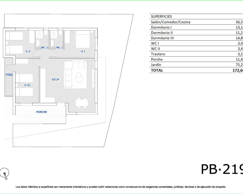 Moderne, nybygde bungalower i San Miguel de Salinas med 3 felles svømmebassenger Middelhavsstil i naturskjønne omgivelser Oppdag dette moderne boligprosjektet med nybygde bungalower i utkanten av San Miguel de Salinas, en by sør i provinsen Alicante, med gangavstand til alle fasiliteter. Denne sjarmerende byen kombinerer nærhet til havet med naturens ro, noe som gjør den til et ideelt sted både for fast bolig og ferie. Boligalternativer for alle livsstiler Anlegget tilbyr leiligheter i bungalowstil med 2 eller 3 soverom, tilgjengelig i to planløsninger: Første etasje med privat hage og bod Øverste etasje med privat solterrasse Hver bolig er designet med et moderne og funksjonelt tilnærming, og tilbyr komfort, naturlig lys og uteområder for å nyte det middelhavsklimaet hele året. Fellesarealer for familiehygge Dette boligkomplekset er fullt inngjerdet og kan skilte med utmerkede fellesfasiliteter: 3 store felles svømmebassenger for voksne og barn Over 3 400 m² anlagte grønne områder Disse fasilitetene gjør boligprosjektet til et ideelt sted for familier, par og pensjonister som søker høy livskvalitet i et trygt og avslappet miljø. Moderne funksjoner og energieffektivitet Boligene har materialer av høy kvalitet og nøye utført finish: Fullt utstyrt kjøkken Utvendige vinduer og dører med termisk isolasjon og doble vinduer Forsterket inngangsdør Baderomsmøbler inkludert Forberedelse for split-system klimaanlegg i stue og soverom Utmerket beliggenhet nær golf, strender og fasiliteter San Miguel de Salinas ligger strategisk plassert nær turist- og naturområder: Golfbaner som Vistabella, Las Colinas og Campoamor mindre enn 10 km unna Strendene ved Orihuela Costa 11 km unna Lagunene i Torrevieja og La Mata bare 8 km unna La Zenia Boulevard kjøpesenter 9 km unna Alicante-Elche lufthavn ligger 58 km unna (35 minutter med bil) Murcia internasjonale lufthavn ligger 63 km unna (1 time med bil) Ditt nye hjem på Costa Blanca Disse eiendommene representerer en utmerket mulighet for de som søker kvalitet, komfort og en førsteklasses beliggenhet. Kontakt oss nå for mer informasjon eller for å bestille visning, og ta det første skrittet mot ditt liv på Costa Blanca.