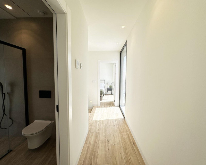 Eksklusive nybyggede villaer 300 m fra stranden i Torre de la Horadada Luksuriøst kystliv i en førsteklasses beliggenhet Oppdag dette eksklusive nybyggprosjektet i Torre de la Horadada, en av de mest ettertraktede kystbyene sør i Alicante. Disse villaene ligger bare 300 m fra Middelhavet og innen gangavstand fra butikker, restauranter og daglige tjenester, og tilbyr en enestående mulighet til å nyte Costa Blanca-livsstilen. Torre de la Horadada er kjent for sin avslappede atmosfære, vakre promenade og fine sandstrender, noe som gjør den ideell både for permanent opphold og ferie. Siste nøkkelklar villa fullt utstyrt Dette boutique-prosjektet består av bare fire uavhengige villaer, hvor den siste enheten er nøkkelklar og fullt møblert. Villaen leveres komplett med møbler, hvitevarer og sentral klimaanlegg, slik at du kan flytte inn umiddelbart og begynne å nyte ditt nye hjem ved sjøen. Villaen ligger på en privat tomt på ca. 207 m2 og har et bygget areal på ca. 130 m2 fordelt på første etasje, andre etasje og et privat solarium på taket. Moderne design med privat basseng og solarium Villaen har et moderne design med åpne og lyse rom. Innvendig finner du tre romslige soverom og tre bad, en stue/spisestue med åpen kjøkkenløsning og direkte tilgang til hagen og det private svømmebassenget. Solterrassen på taket er et ideelt sted å slappe av, sole seg eller nyte den åpne utsikten, og skaper et perfekt uteområde hele året. Høy kvalitet og komfort Eiendommen er bygget etter høye standarder og har en forsterket inngangsdør, motoriserte persienner i soverommene, et privat svømmebasseng og et grunnleggende hjemmestyresystem for elektronisk kontroll. Kanalisert klimaanlegg er fullt installert, noe som sikrer komfort i alle årstider. En privat parkeringsplass på tomten gir ekstra bekvemmelighet og sikkerhet. Torre de la Horadada og omegn Torre de la Horadada tilbyr et sjarmerende kystmiljø med en lang strandpromenade, marinaer og et bredt utvalg av restauranter, barer og lokale butikker. De nærliggende strendene Torre de la Horadada og Mil Palmeras er blant de beste i området, og er ideelle for svømming, vannsport, snorkling og dykking. Området har gode transportforbindelser og er omgitt av golfbaner, kjøpesentre og fritidstilbud. Avstander til viktige severdigheter Strand: 0,3 km Plaza Nueva shoppingområde: 0,2 km Lo Romero Golf: 7 km Marinaen i Torre de la Horadada: 1,5 km Murcia Corvera flyplass: 45 km Alicante flyplass: 50 km Ditt nye hjem ved Middelhavet venter Denne nøkkelferdige villaen i Torre de la Horadada er en unik mulighet til å eie et moderne hjem bare noen skritt fra stranden. Kontakt oss i dag for å avtale en visning og sikre deg denne eksepsjonelle nybygde villaen på Costa Blanca.