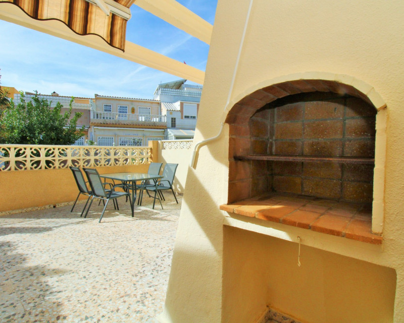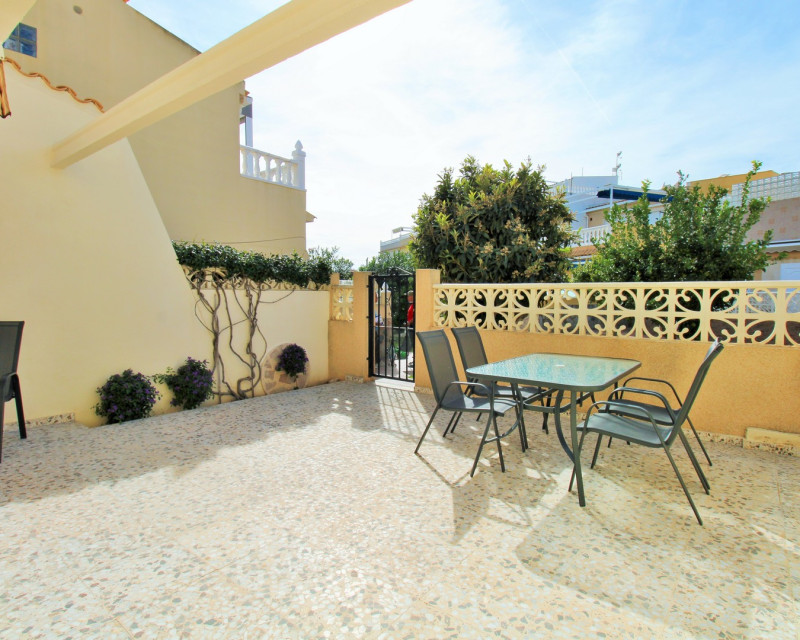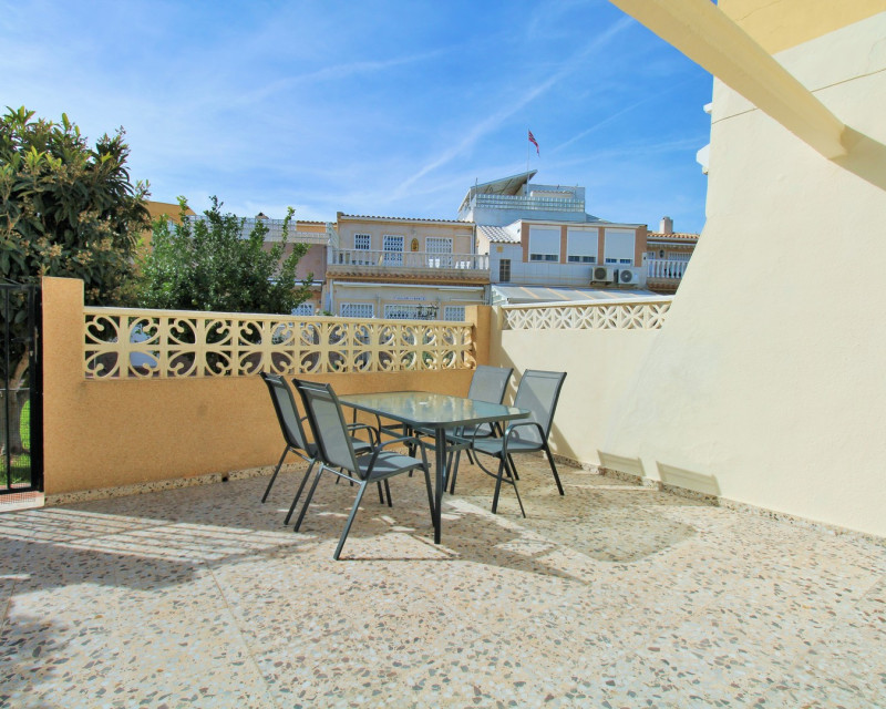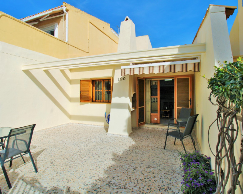Vistacasas presents this exceptional end-of-terrace bungalow offering superb value in the gated community of Manzana 7, La Chismosa (Playa Flamenca). Enjoying a desirable south-west orientation, the home benefits from sunshine throughout the day and features a generous front terrace complete with built-in BBQ and retractable awnings—perfect for relaxing or entertaining. Residents also have access to beautifully maintained communal green areas. All living accommodation is arranged on one level, comprising a bright living room with feature fireplace, an open fully fitted kitchen to the rear with access to an exterior utility area, and a small hallway leading to a light and airy double bedroom with fitted wardrobes and a bathroom with walk-in shower. The property is offered fully furnished and includes air-conditioning. Ideally situated within walking distance of local bars and restaurants in La Chismosa and La Florida, and just a short drive from the blue-flag beaches of the Orihuela Costa, Zenia Boulevard, and several top-class golf courses. A fantastic opportunity in a sought-after location—early viewings are highly recommended!