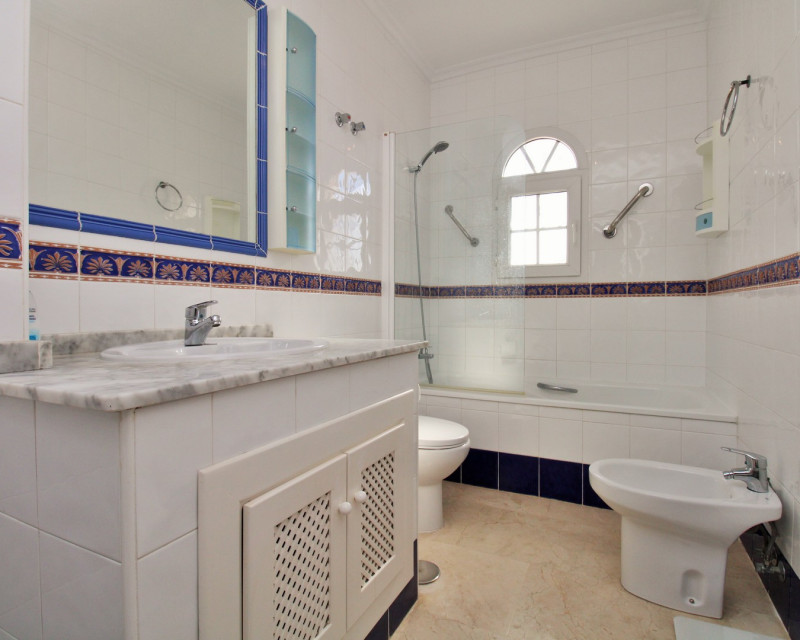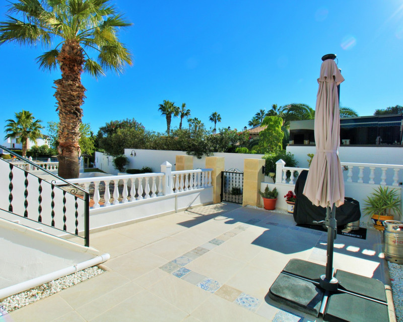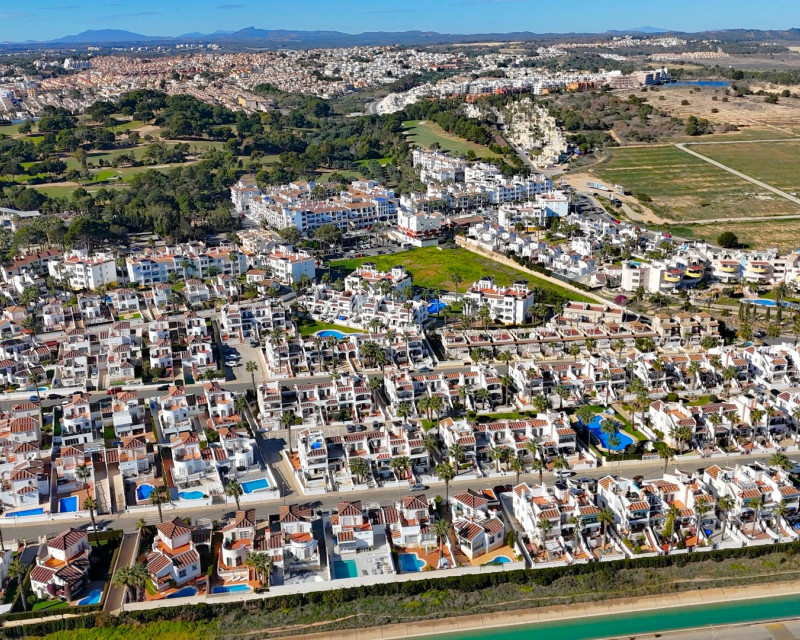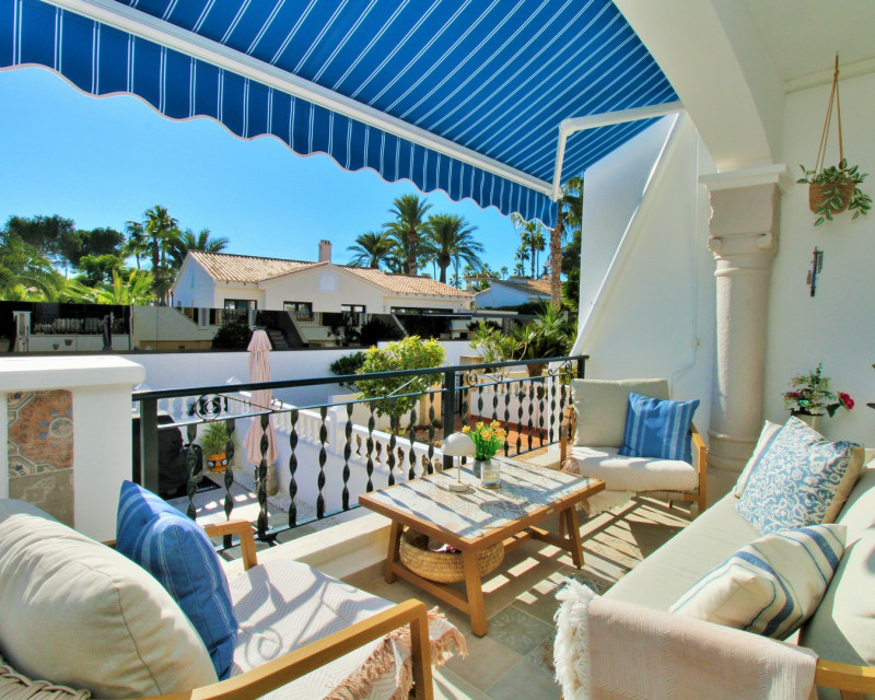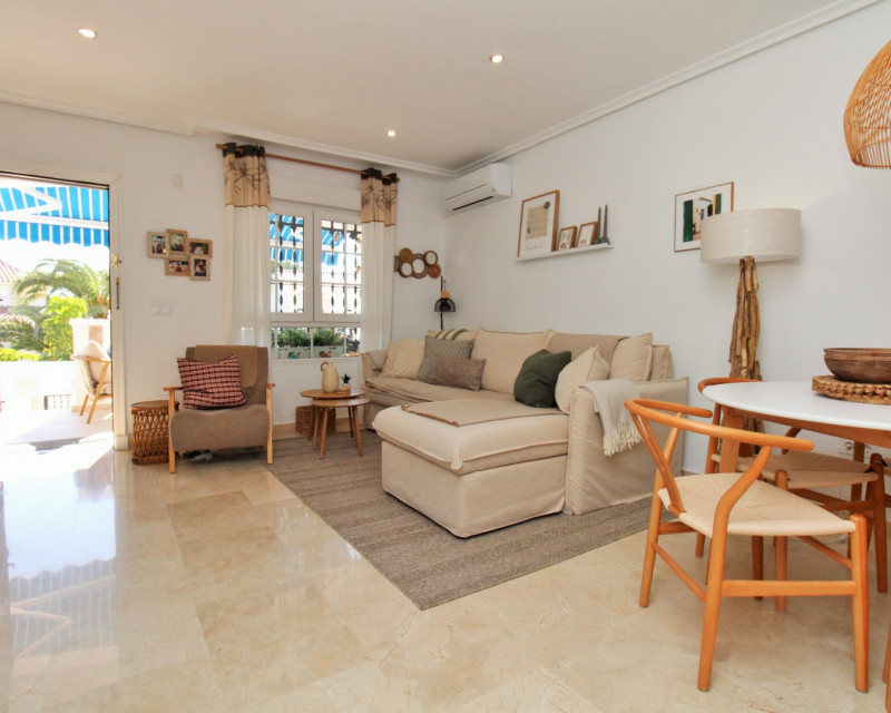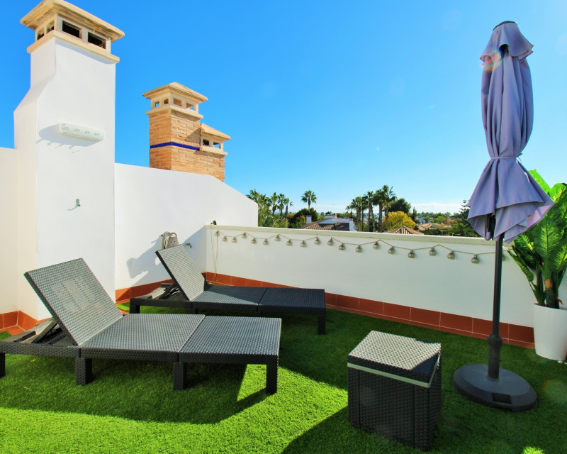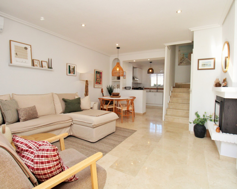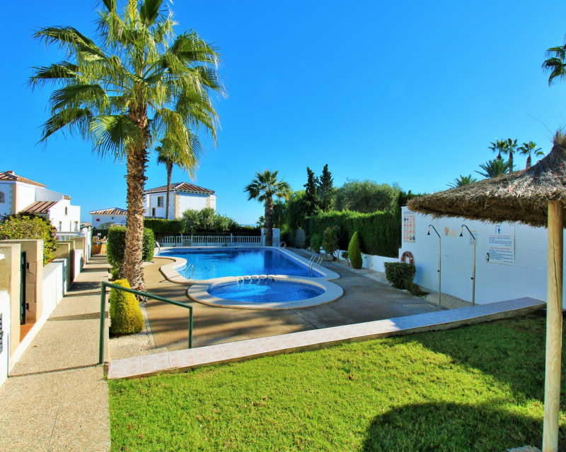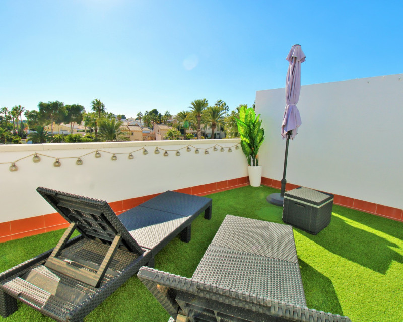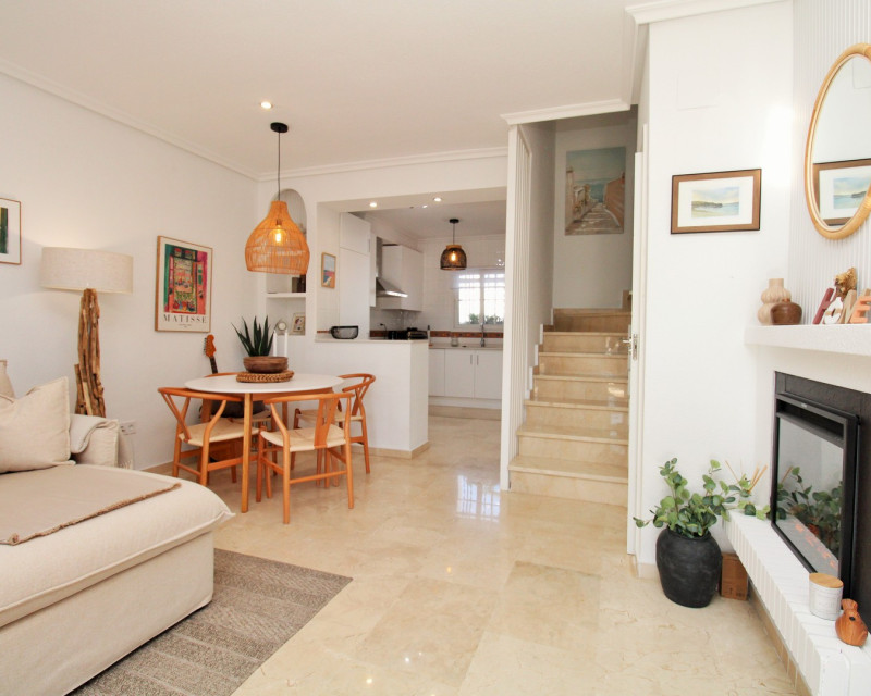 An exceptional South-facing Sofía-style townhouse with sea and pool views, perfectly positioned in the prestigious R1B gated community of Las Violetas, Villamartin. Over the past year the property has undergone extensive upgrades, including newly tiled gardens, refurbished terraces, a brand-new kitchen, retractable awnings, and high-quality furnishings and appliances. A superb opportunity in one of Villamartin’s most sought-after locations. Located just a five-minute walk from Villamartin Plaza and the golf course, this immaculate home offers the ideal blend of comfort, style, and convenience. The beautifully maintained community provides residents with a communal swimming pool and landscaped gardens. Inside, the ground floor features a bright and spacious lounge-dining area with a feature fireplace, a fully renovated modern kitchen with utility area, and a guest WC. Both the front and rear gardens have been newly retiled, and the elevated front terrace — complete with retractable sun awnings — overlooks the pool area. Upstairs are two double bedrooms with fitted wardrobes and a family bathroom. The main bedroom opens onto a private South-facing balcony with wonderful sea and pool views. Internal stairs lead up to a large private roof solarium offering panoramic Mediterranean views — perfect for relaxing or entertaining. The property is sold fully furnished, includes air-conditioning, and is presented in pristine condition throughout. Just a short stroll from a fantastic selection of restaurants, bars, shops, and the golf course, and only minutes by car to Zenia Boulevard and the Blue Flag beaches of the Orihuela Costa. Homes in Las Violetas are rarely available for long — early viewing recommended.