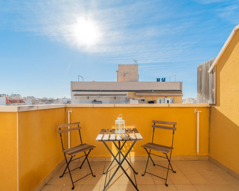 Discover this magnificent penthouse located in the heart of Torrevieja, on the well-known Calle La Paz, right next to the Town Hall. A unique property that stands out for its natural light and prime location. Just 620 meters from the sea, the beaches, and the promenade, it offers the perfect combination of urban life and seaside proximity.~~It features two large terraces facing two different streets, providing dual orientation and beautiful open city views, making every room warm and full of light. Additionally, it includes a private-use rooftop solarium, perfect for sunbathing, hosting gatherings, or relaxing outdoors.~~The layout is designed for everyday comfort: 105 m2 built area, three double bedrooms, two well-equipped bathrooms, and a pleasant living area. The property is fully furnished with appliances included, ready to move in without any additional investment.~~The location is unbeatable: surrounded by services, playgrounds, shopping centers, schools, bus stops, and nearby hospitals, making it ideal both for year-round living and as a property investment in one of Torrevieja’s most sought-after areas.~~A perfect opportunity for those looking for a charming penthouse with open views, outdoor spaces, and within walking distance of the sea and promenade. Come and see it!