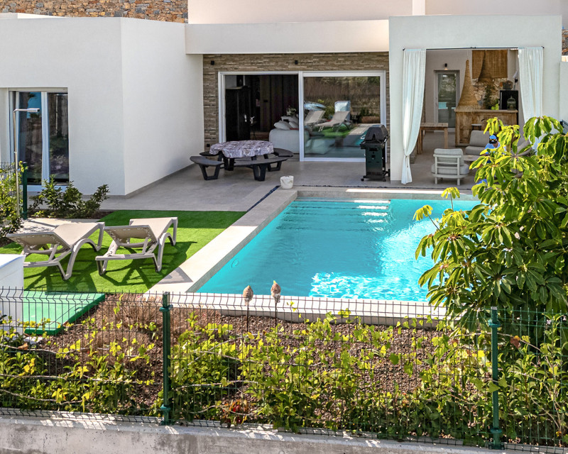 We are pleased to present this stunning luxury villa with panoramic views due to it´s elevated position at the 5 star La Finca Golf course. This impressive modern home is a perfect example of a resale of a new build without the wait and packed with luxury extras. The home offers a vast living/dining space, typically not seen in such homes, and offers the perfect area for leisure and entertainment, there is still ample space for a formal dining area or you can sit at the large island leading to the high end kitchen, which features floor to ceiling integrated cabinetry, ample work top space and top of the range white goods, plus leading out to a utility area and to the side patio terrace. The home offers 3 bedrooms, the master suite comprises a spacious double bedroom with patio doors to the garden and sun terrace, large walk in dressing room, with ample storage and floor to ceiling mirror, plus luxury shower room with his and hers sinks. The further 2 guest bedrooms both feature integrated wardrobes with ample storage space and share a further modern shower room. The whole home inside presents like a show room and has been made unique by the owners eye for detail and shows clearly their passion for interior design. Each piece and all decor has been lovingly chosen to integrate sympathetically with the wood and stone design, yet brings a touch of class to each room. The villa is set on a low maintenance plot of over 400m2 with sun terrace to the front offering some shade from the Spanish sun and is the perfect space for al fresco dining, likewise a sunny corner along with an summer kitchen/bar area offers the ideal spot for entertaining. The villa of course offers private swimming pool to cool off in the height of summer and the remainder of the plot is low maintenance with high quality tiles, gravel and artificial grass, a easy to access driveway offers secure gated parking, although there is ample quiet street parking outside the villa. Boasting stunning unobstructed mountain and country side views due to it´s elevated position this home offers everything a discerning buyer could wish for. This stunning villa will be sold part furnished although inventory can be discussed dependent on offers and is sold with many extras including integrated white goods, air conditioning, remote controlled blinds and gates, plus much more. Located a mere 200m to the La Finca Golf hotel Spa and club house , ideal for golf lovers for those extended holidays or ideal for permanent living as under 3km to both the traditional village of Algorfa which offers Spanish charm,local restaurants, bars, local shops and the traditional village square and the commercial area at La Finca also noted for some quality restaurants, cocktail bars and much more. Around 17km to the beaches of Guardmar del Segura , La Mata and Torrevieja, meaning you are never far from the coast. This home must be seen to be appreciated and is even more stunning in real life. Contact us today for your viewing