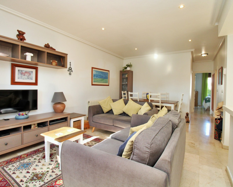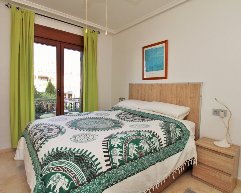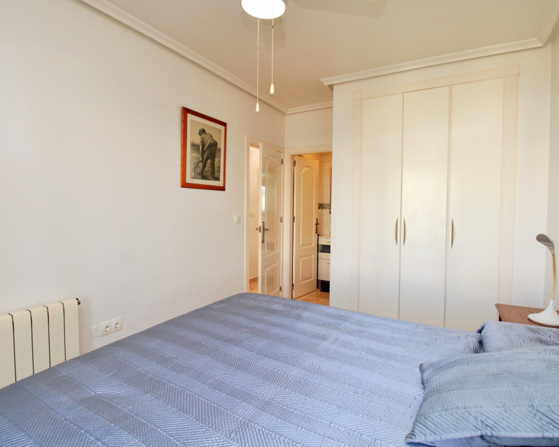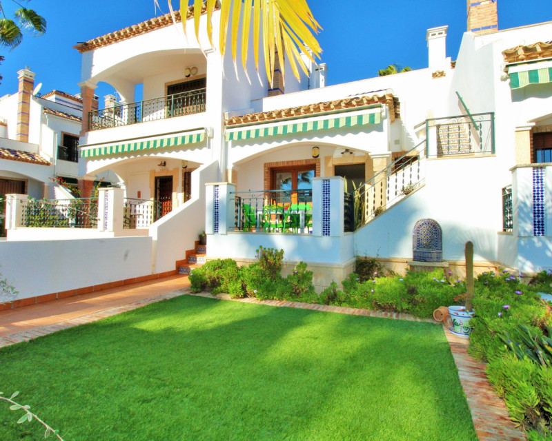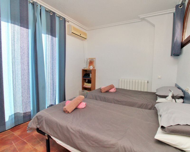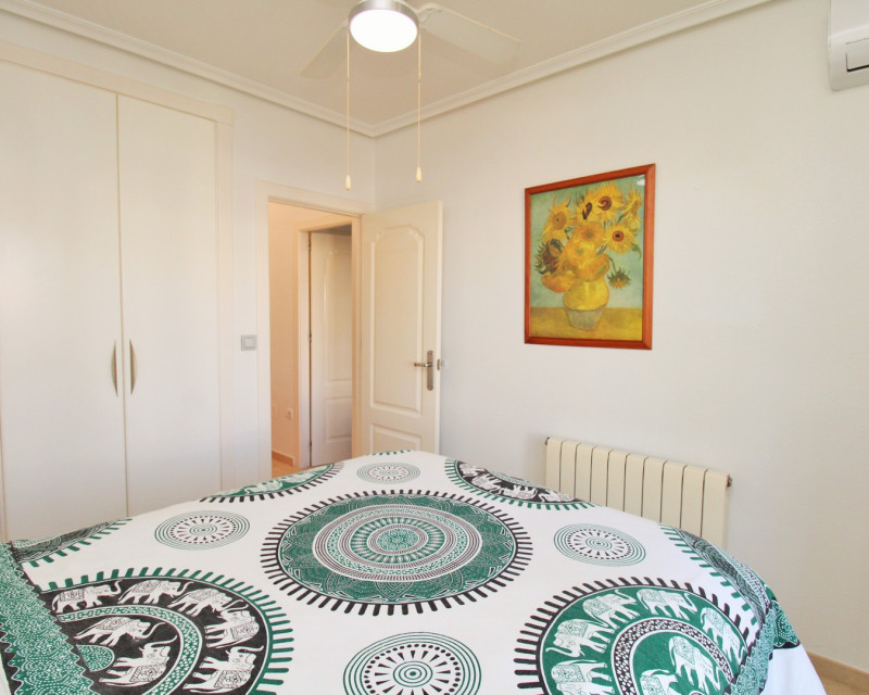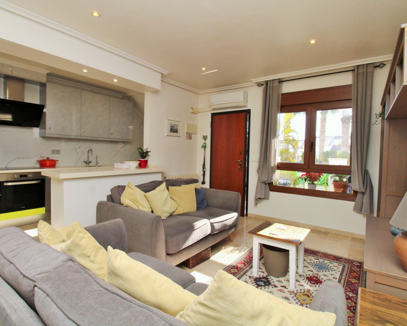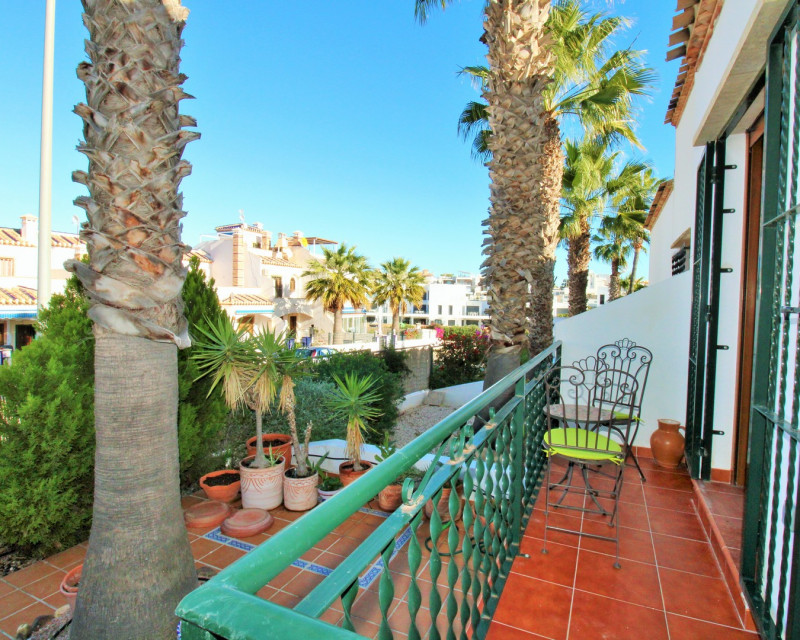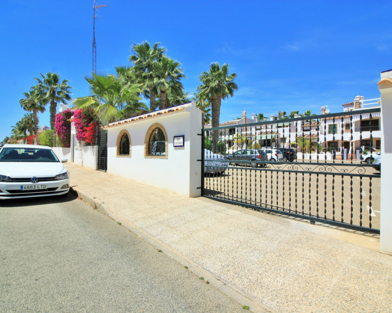 Lola-style bungalow for sale in the highly sought-after gated community of R9 in Pau 8, Villamartin. Lovingly maintained by the same owner since new, this charming home enjoys an unbeatable location just a 10-minute walk to the Villamartin Plaza and Villamartin Golf Course, surrounded by a fantastic choice of bars, restaurants and local services. The community is well cared for, offering a communal pool, communal off-road parking, and a full exterior repaint scheduled for completion before the end of Q2 2026. The property features front and rear private gardens, plus a raised front terrace overlooking the communal green areas. Inside, there is a bright and comfortable lounge-dining area, a renovated modern kitchen with adjoining utility space, and two double bedrooms with fitted wardrobes. The master bedroom includes an en-suite bathroom with walk-in shower and direct access to the rear garden. The second bedroom has had its original window replaced with patio doors, opening onto a small Juliet-style terrace with direct access to the rear garden. Beneath this area is a useful built-in storage space at ground level — a great practical bonus. External stairs from the front terrace lead to the private roof solarium, offering an excellent space for relaxing or entertaining. On the solarium, a fantastic guest annex has been added, providing an extra bedroom with en-suite bathroom — ideal for visitors or extended family. The home is sold furnished, including white goods, air-conditioning, central heating on mains gas, and benefits from modernised bathrooms. A fantastic opportunity in one of the most popular areas of Villamartin — early viewing is highly recommended.