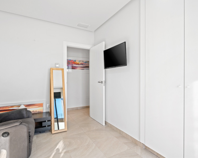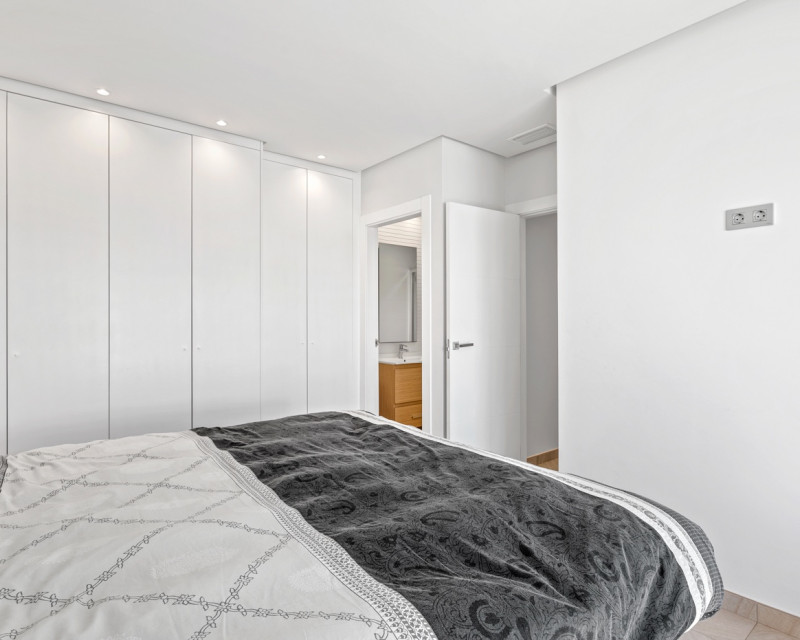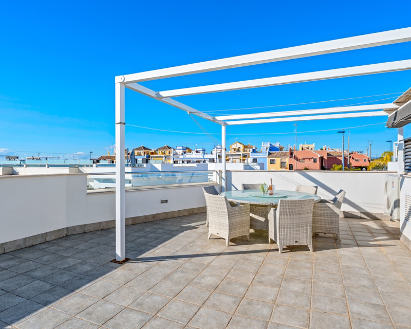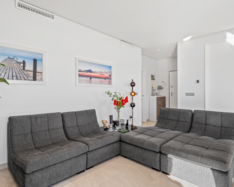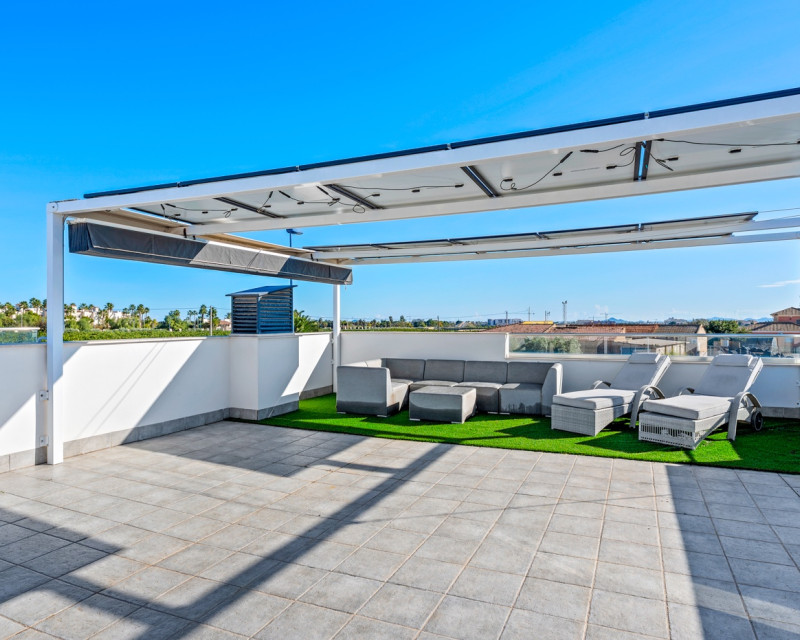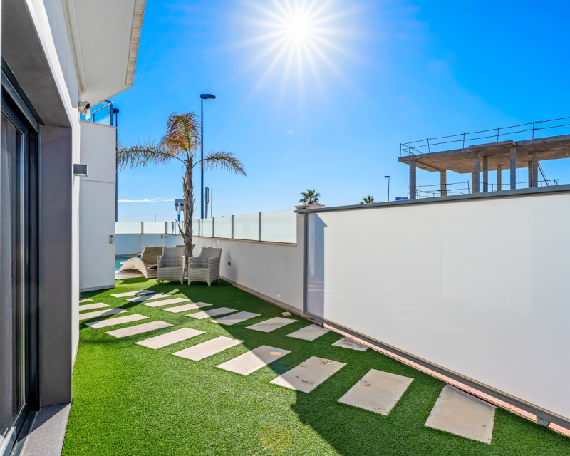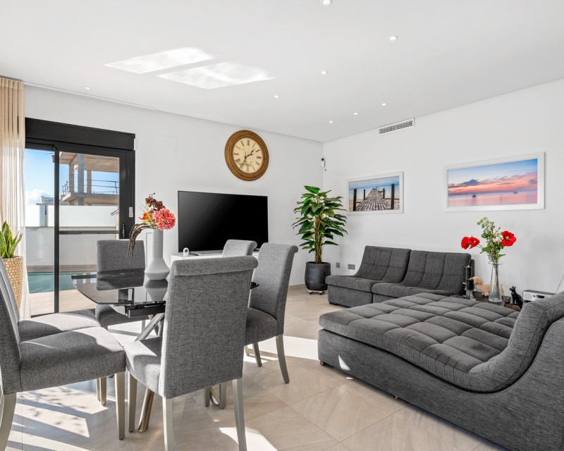 Are you looking for a fully detached property offering peace and privacy, yet located close to all amenities? Then this home is definitely worth a visit. This fully detached villa features three spacious bedrooms and two bathrooms. The property is sold fully equipped, including kitchenware and decorative items, allowing you to move in or start renting immediately. It is fitted with all modern comforts. Entering the plot through the gate, you are led to the front door. Inside, you are welcomed into a bright open-plan living area with a modern open kitchen. Large windows provide an abundance of natural light. Should you wish to limit the sunlight, the property is equipped with electric shutters on all windows. Or simply open the sun awning. Via the hallway, you access the three bedrooms and the guest bathroom. The master bedroom benefits from an en-suite bathroom, offering additional comfort and privacy. The current owners have recently renewed the air conditioning system and installed solar panels on the pergola of the solarium. Additionally, the property boasts a spacious heated swimming pool and private off-road parking. The villa is located on the edge of the charming village of Roda, close to Roda Golf. The beaches of the Mar Menor are just 3 kilometres away. Within walking distance, you will find various restaurants, a supermarket, a hairdresser and other amenities. The lively strip of Los Alcázares, with its numerous bars and restaurants, is only 2 kilometres away. Los Alcázares is a vibrant town throughout the year. Thanks to the nearby AP-7 motorway, the popular Orihuela Costa and La Zenia Boulevard shopping centre can be reached in just 15 minutes. Interested in this property? Contact us today before this unique opportunity is gone.