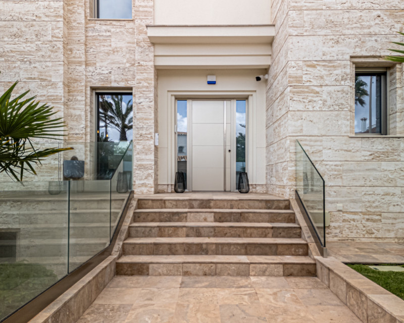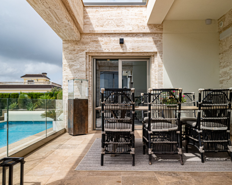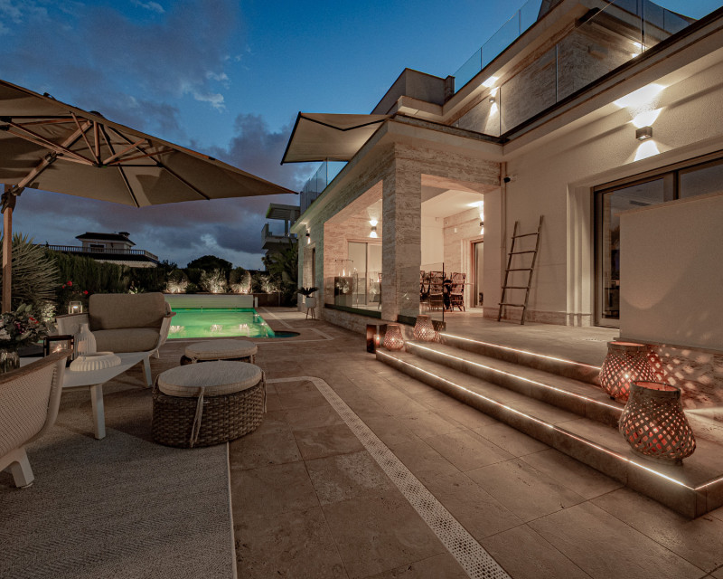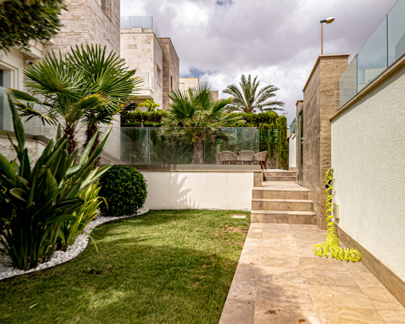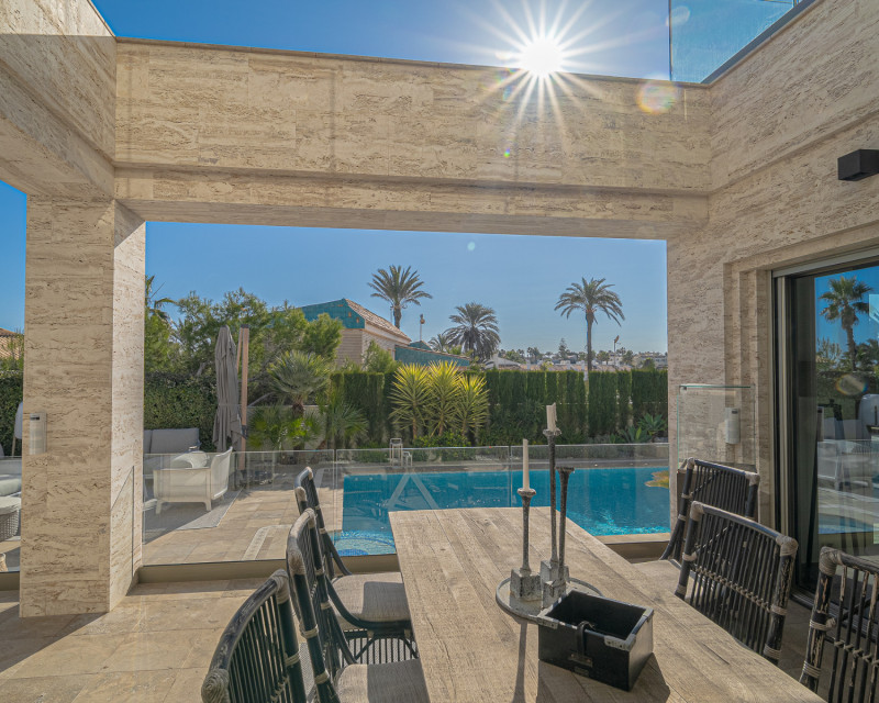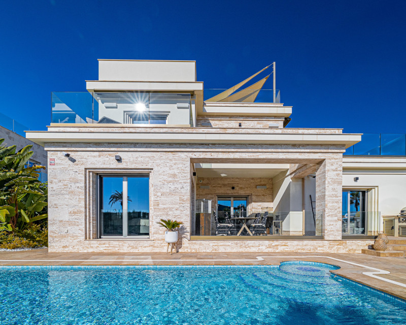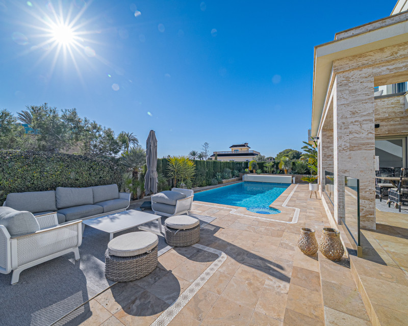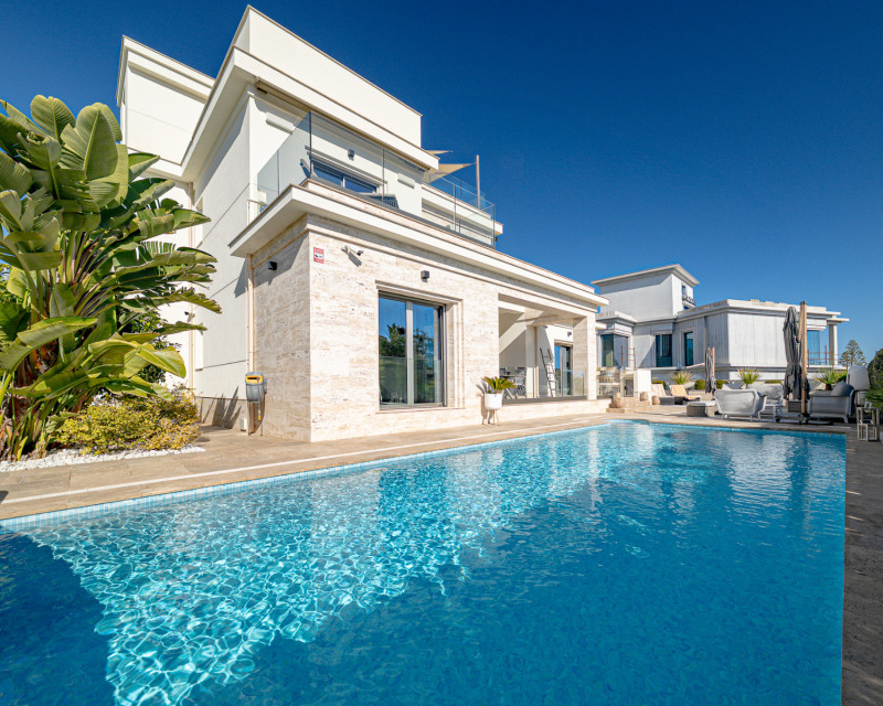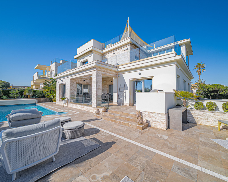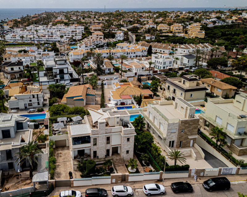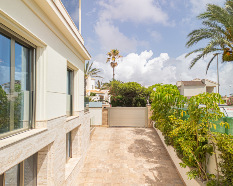 This contemporary beachside villa, built in 2022, offers luxury coastal living just steps from the sea. Set on a 665.66 m² gated plot, the home boasts 442 m² of living space across multiple levels—including a 186.60 m² underbuild featuring a spacious private gym, a large guest bedroom, and direct access to the private garage with room for up to two cars and generous storage space. The layout includes an open-plan living and dining area with expansive floor-to-ceiling windows, a statement fireplace, and a sleek modern kitchen, complemented by a fully equipped utility/laundry room. The home offers six spacious bedrooms and four designer bathrooms—each fitted with Arital design elements and premium Wolf appliances. Enjoy the Mediterranean breeze in over 426 m² of private garden and outdoor living space, surrounded by tropical landscaping, mature palm trees, and premium finishes. The 40 m² climate-controlled swimming pool includes a double-engine-powered stream—perfect for both fitness and relaxation. The 78.80 m² rooftop solarium offers panoramic sea views and features an outdoor kitchen and BBQ area—ideal for entertaining. Located just a few hundred metres from La Zenia Beach, with shops, restaurants, and La Zenia Boulevard all within walking distance. Excellent connectivity via the nearby N-332 coastal road. The property is thoughtfully designed, and the current owner has imported many extras from Sweden, including a 150,000 euro luxury kitchen with high-end appliances, solar panels (9 kW), Tripiu designer doors, Travertine natural stone tiles at the facade, and reinforced bulletproof, anti-vandal windows and doors. A sophisticated fancoil cooling system ensures silent, energy-efficient climate control throughout the home, delivering optimal comfort and air quality year-round. The villa is fully furnished with curated, high-end pieces and showcases designer lighting throughout. It also features a state-of-the-art multi-zone audio system from Mezzanine Audio, with high-end speakers integrated throughout both the interior and exterior. The garden includes an outdoor sound system by Sonance, while each terrace features built-in speakers. Inside, the living room, kitchen, master bedroom, gym, and a guest bedroom are equipped with "invisible" ceiling speakers—seamlessly blended into the architecture. All zones are centrally managed via a Sonos intelligent control system, allowing intuitive operation through app-based domotic technology. This villa must be seen to be fully appreciated—offering a rare combination of architectural elegance, intelligent living, and premium luxury finishes in one of the Costa Blanca's most exclusive coastal settings.