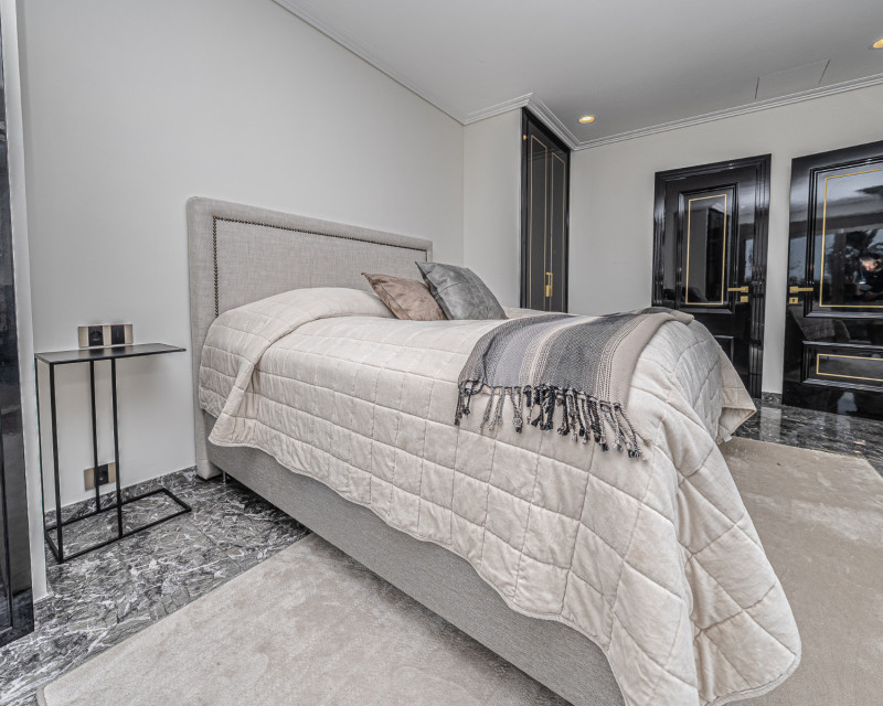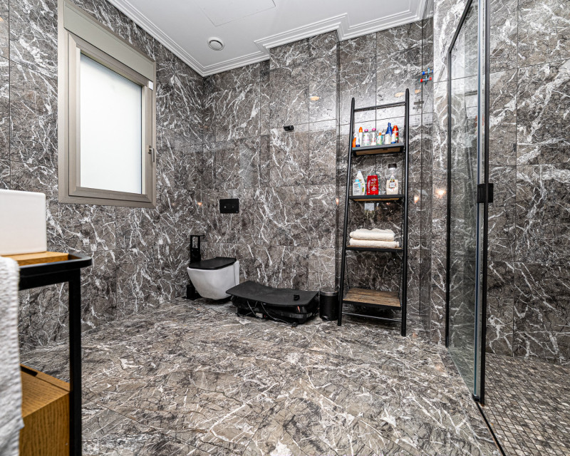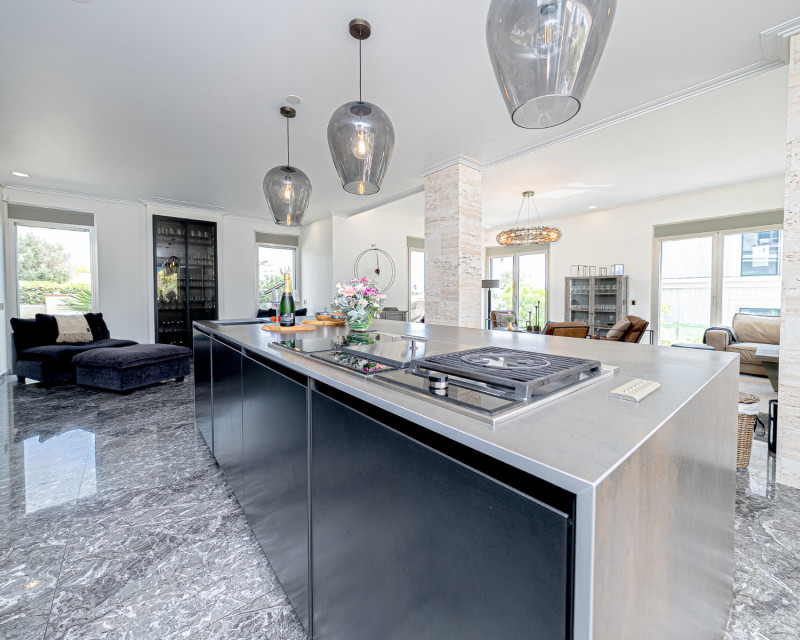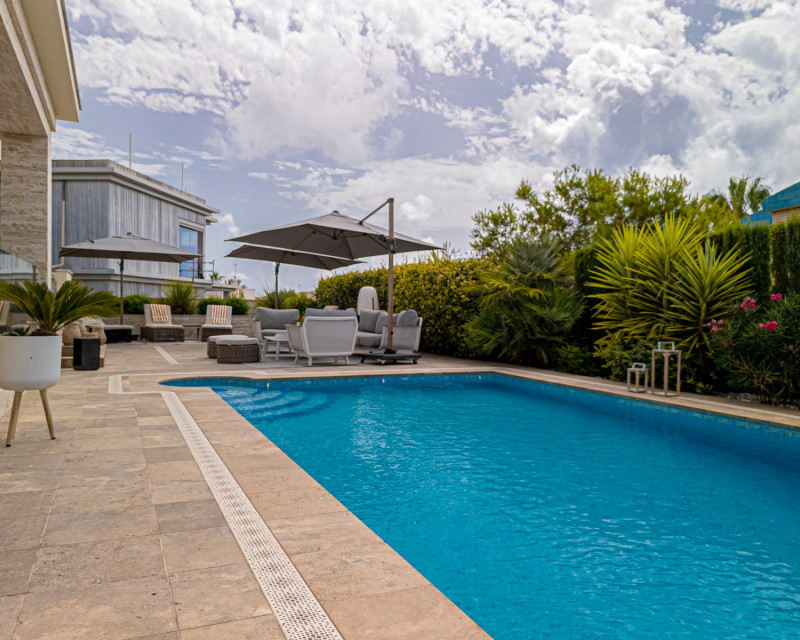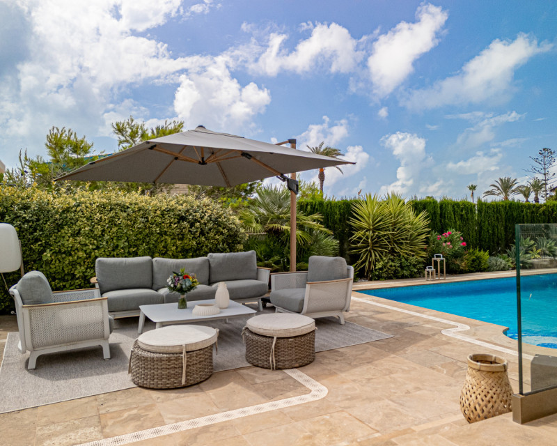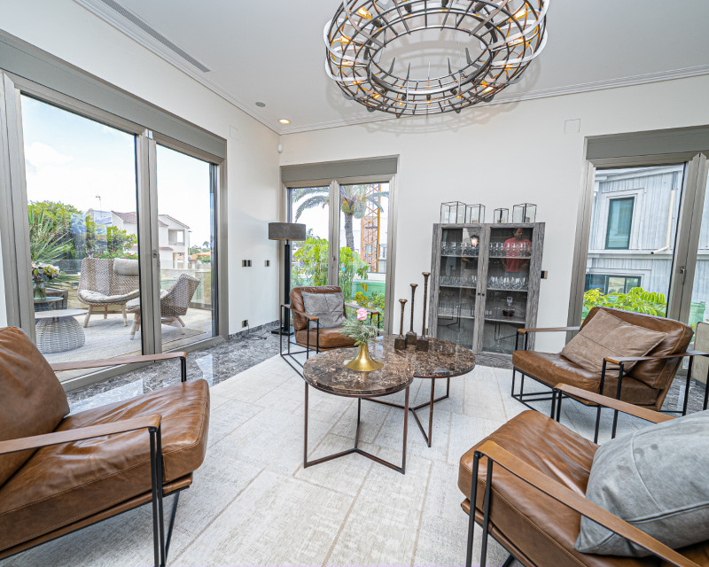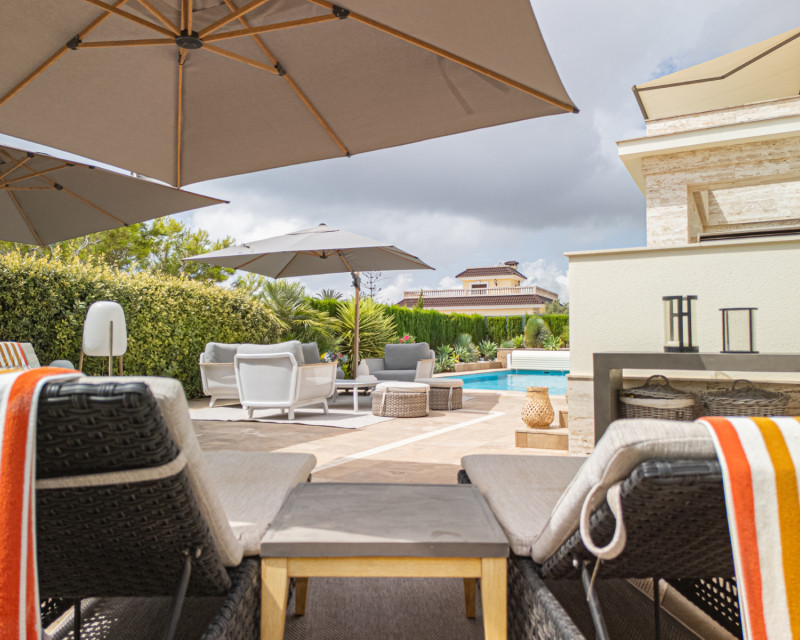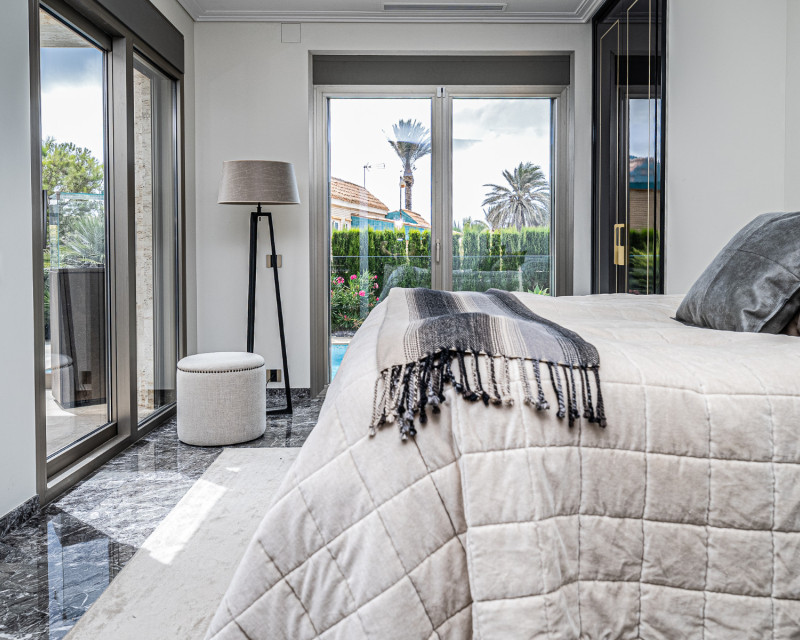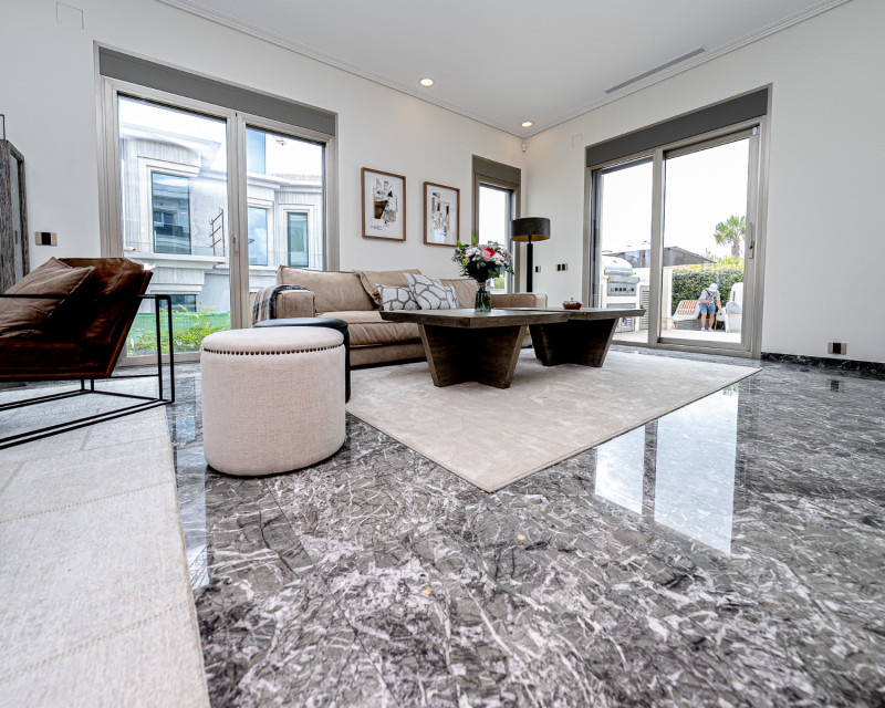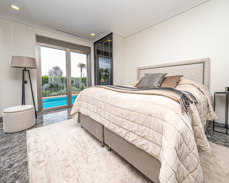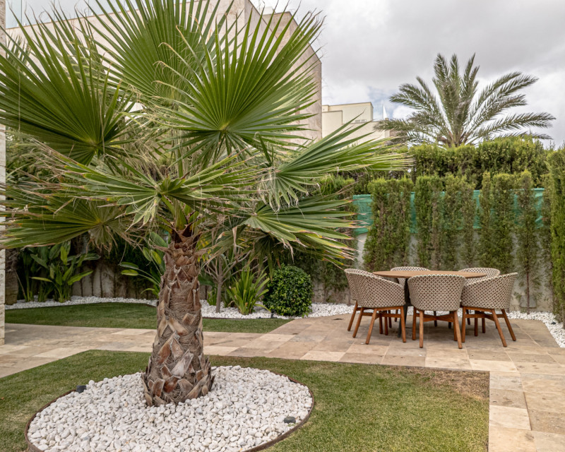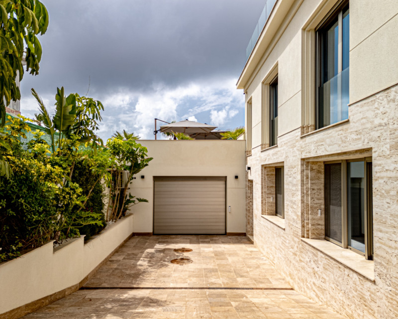 This contemporary beachside villa, built in 2022, offers luxury coastal living just steps from the sea. Set on a 665.66 m² gated plot, the home boasts 442 m² of living space across multiple levels—including a 186.60 m² underbuild featuring a spacious private gym, a large guest bedroom, and direct access to the private garage with room for up to two cars and generous storage space. The layout includes an open-plan living and dining area with expansive floor-to-ceiling windows, a statement fireplace, and a sleek modern kitchen, complemented by a fully equipped utility/laundry room. The home offers six spacious bedrooms and four designer bathrooms—each fitted with Arital design elements and premium Wolf appliances. Enjoy the Mediterranean breeze in over 426 m² of private garden and outdoor living space, surrounded by tropical landscaping, mature palm trees, and premium finishes. The 40 m² climate-controlled swimming pool includes a double-engine-powered stream—perfect for both fitness and relaxation. The 78.80 m² rooftop solarium offers panoramic sea views and features an outdoor kitchen and BBQ area—ideal for entertaining. Located just a few hundred metres from La Zenia Beach, with shops, restaurants, and La Zenia Boulevard all within walking distance. Excellent connectivity via the nearby N-332 coastal road. The property is thoughtfully designed, and the current owner has imported many extras from Sweden, including a 150,000 euro luxury kitchen with high-end appliances, solar panels (9 kW), Tripiu designer doors, Travertine natural stone tiles at the facade, and reinforced bulletproof, anti-vandal windows and doors. A sophisticated fancoil cooling system ensures silent, energy-efficient climate control throughout the home, delivering optimal comfort and air quality year-round. The villa is fully furnished with curated, high-end pieces and showcases designer lighting throughout. It also features a state-of-the-art multi-zone audio system from Mezzanine Audio, with high-end speakers integrated throughout both the interior and exterior. The garden includes an outdoor sound system by Sonance, while each terrace features built-in speakers. Inside, the living room, kitchen, master bedroom, gym, and a guest bedroom are equipped with "invisible" ceiling speakers—seamlessly blended into the architecture. All zones are centrally managed via a Sonos intelligent control system, allowing intuitive operation through app-based domotic technology. This villa must be seen to be fully appreciated—offering a rare combination of architectural elegance, intelligent living, and premium luxury finishes in one of the Costa Blanca's most exclusive coastal settings.