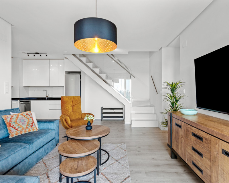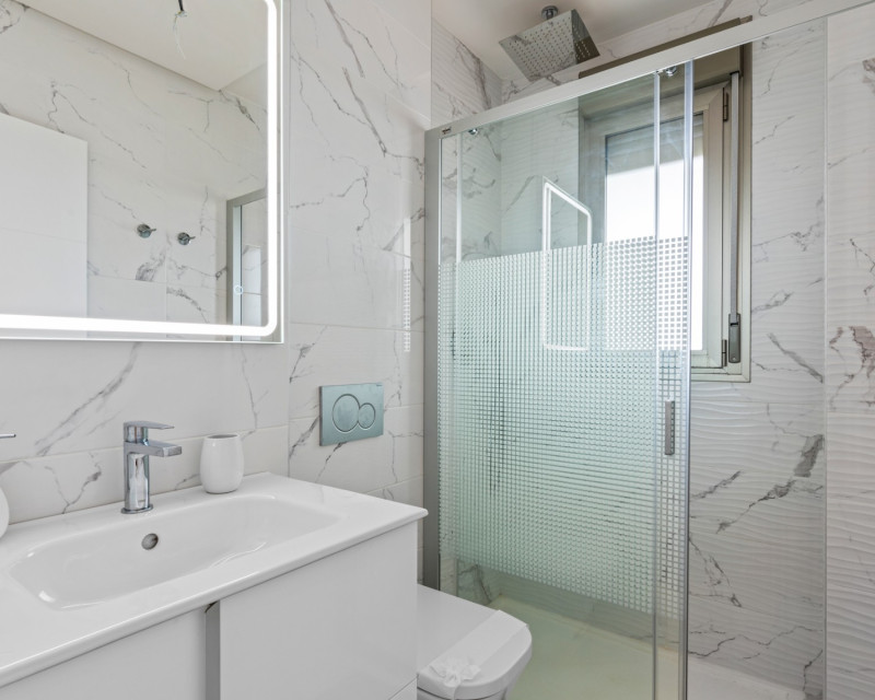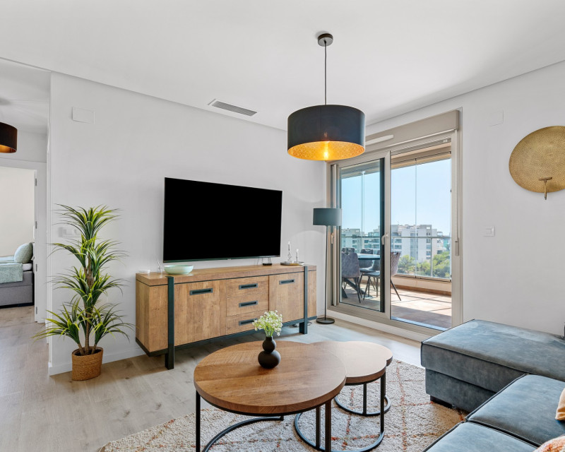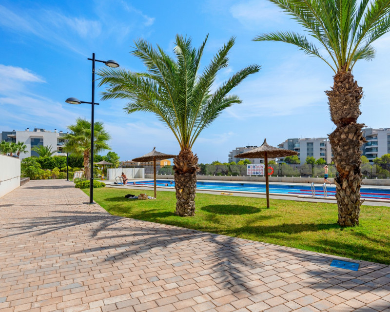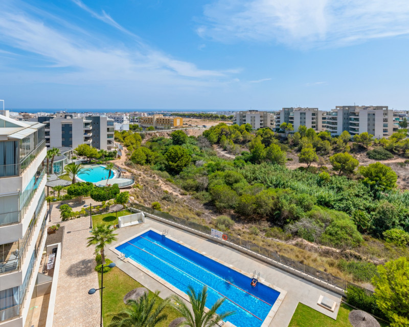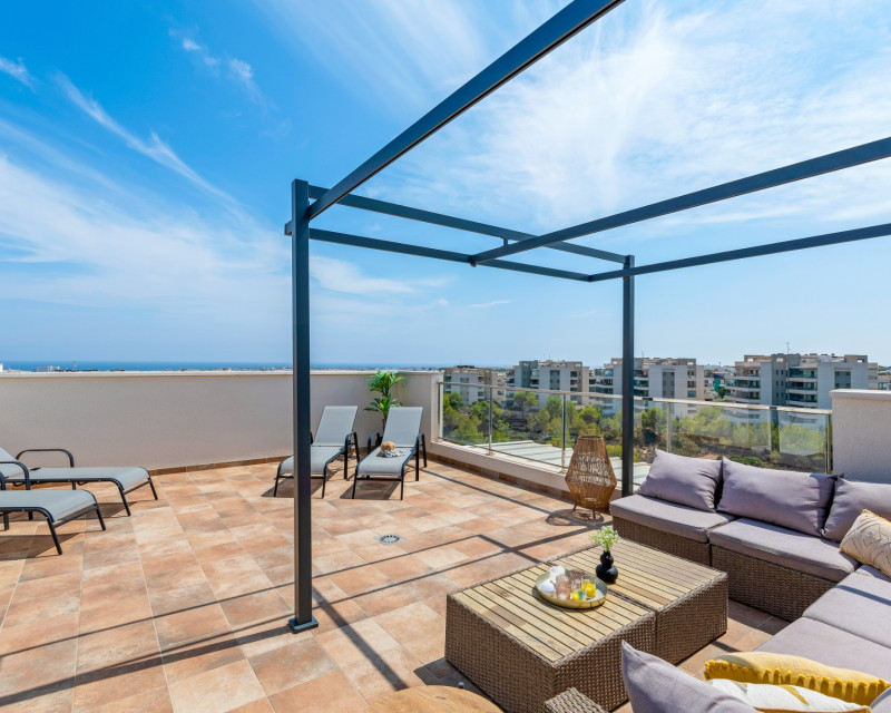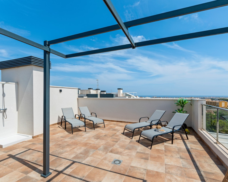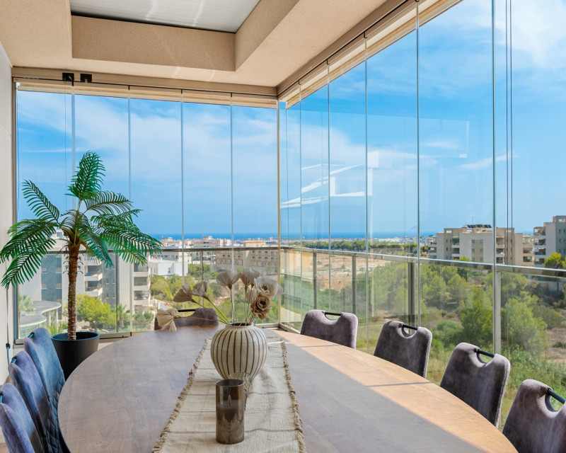 Beautiful penthouse apartment with 3 bedrooms - Roof terrace with fantastic views - Parking! We are proud to present this apartment in the sought after "Green Hills", located just above La Zenia. Here we have perhaps the most beautiful apartment in the complex, a south-west facing penthouse apartment with 3 bedrooms, 2 delicate bathrooms with underfloor heating, a large glazed terrace outside the living room, as well as a private roof terrace with a pergola and shower - here you can enjoy a panoramic view of greenery and the Mediterranean sea. The apartment is sold with high-end furniture, white goods, air conditioning, electric blinds to the glazed terrace etc. There is private parking and a storage room in the underground garage. Green Hills is an extremely popular complex and stands out from the crowd, with several outdoor pools, gorgeous green areas, an indoor gym with changing rooms, and an indoor heated swimming pool. Central and nice location is a stone's throw away from the nearest restaurants and grocery store, about 20 minutes to walk to the large shopping center "Zenia Boulevard", and a short bike ride from the beaches. Contact us for a viewing of this very special apartment!
