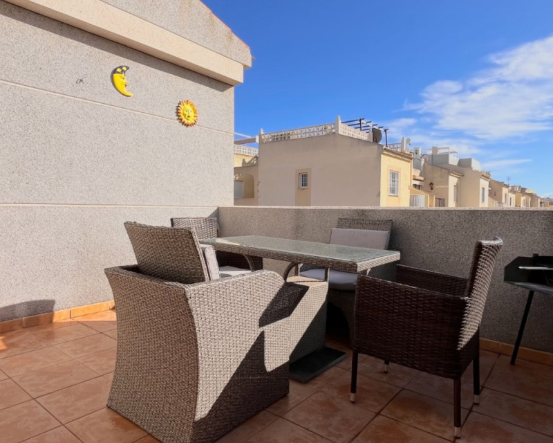 Welcome to this charming and fully ready-to-live semi-detached house located on Calle Rodrigo, 36, in the desirable La Siesta - El Salado - Torreta neighbourhood of Torrevieja. This thoughtfully updated home offers comfort, outdoor living, and flexible use — ideal as a permanent residence, holiday retreat, or rental investment. Key Features:• Spacious interior spread over two levels with a functional layout. • Three bedrooms with built-in wardrobes and two bathrooms, including one on the ground floor beside the laundry area. • Bright, open-plan living area offering flexible space for relaxing and entertaining. • A fully equipped kitchen with both electric and gas cooktops and prepared plumbing for a dishwasher. • Air conditioning throughout for year-round comfort. Outdoor Living:• Private entrance terrace complete with outdoor furniture, storage shed, and an outdoor shower — perfect after a day at the beach or exploring the nearby nature. • On the upper level, enjoy a large balcony with a built-in barbecue area, covered dining space, park views, and a retractable awning for shade on warm days. Location Highlights:• Just a minute’s walk from Parque Natural de La Mata — ideal for walking, cycling, and enjoying wildlife. • Around 10 minutes on foot to sports facilities, restaurants, pharmacy and everyday services. • A short drive to beaches, shopping centres, and supermarkets, offering a great blend of peaceful surroundings and convenient access. This property stands out for its move-in readiness, outdoor lifestyle spaces, and practical layout — a rare find in a quiet yet well-connected part of Torrevieja.