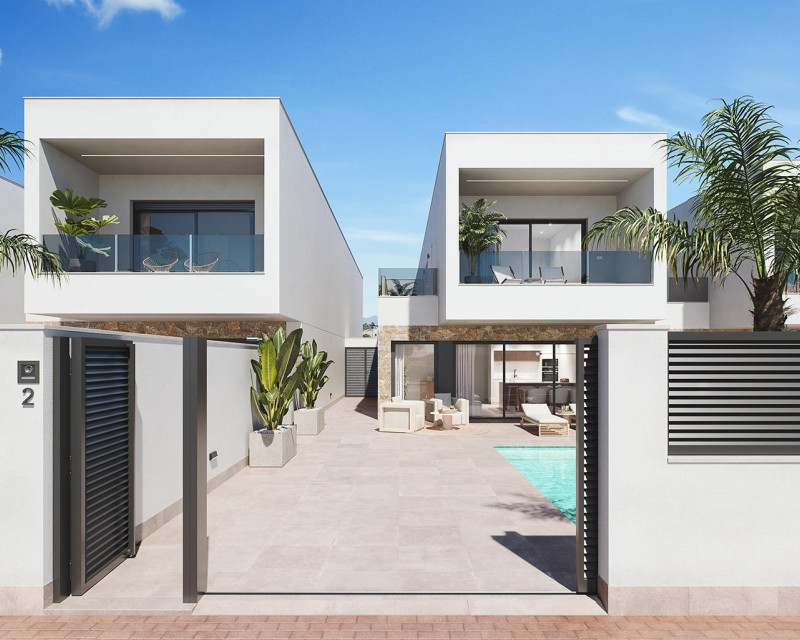 Modern New Build Villas with Private Pool in San Pedro del Pinatar Contemporary Design and Premium Quality Living Discover the third phase of this exclusive residential project in San Pedro del Pinatar, where modern architecture meets comfort and functionality. These 14 semi detached villas are designed with a minimalist style and high quality finishes, offering an elegant and sophisticated living experience on the Costa Calida. Each villa features 3-4 spacious bedrooms, 3 bathrooms, private swimming pool, terraces and a private garden, creating the perfect environment for privacy, relaxation and Mediterranean outdoor living. San Pedro del Pinatar is one of the most sought after towns in the Mar Menor area, known for its natural salt lakes, calm beaches and year round pleasant climate, making it ideal for both permanent living and holiday use. Open Plan Layout Designed for Modern Life The villas are carefully distributed with an open plan kitchen connected to a bright living and dining area. Large windows in the living room with motorized blinds provide direct access to the pool area and allow natural light to flood the interior spaces. Key features of each property include: 3 bedrooms with built in wardrobes 3 fully equipped bathrooms with vanity units, mirrors and shower screens Furnished kitchen with Balay appliances included Private pool and garden area Interior and exterior LED lighting Terraces on the first floor and optional rooftop solarium On plot parking space Aerothermal system for hot water Photovoltaic solar panels for improved energy efficiency Pre installation of ducted air conditioning These homes are designed to combine sustainability, comfort and modern style in every detail. Prime Location Near Beaches and Services Located between the Mar Menor and the Mediterranean Sea, San Pedro del Pinatar is a paradise for beach lovers and water sports enthusiasts. The town offers a lively marina, natural mud baths, shops, restaurants, sports facilities and excellent services all year round. Beaches of the Mar Menor 3 km Mediterranean beaches 5 km Dos Mares Shopping Center 5 km Lo Romero Golf 10 km Roda Golf 15 km Murcia Corvera Airport 30 km Alicante Airport 80 km San Pedro Marina 4 km An Ideal Home for Lifestyle and Investment Thanks to their location, design and energy efficient features, these villas represent an excellent opportunity as a permanent residence, holiday home or rental investment in one of the most attractive areas of the Costa Calida. Contact us today for more information or to arrange a viewing and secure your new villa in San Pedro del Pinatar.