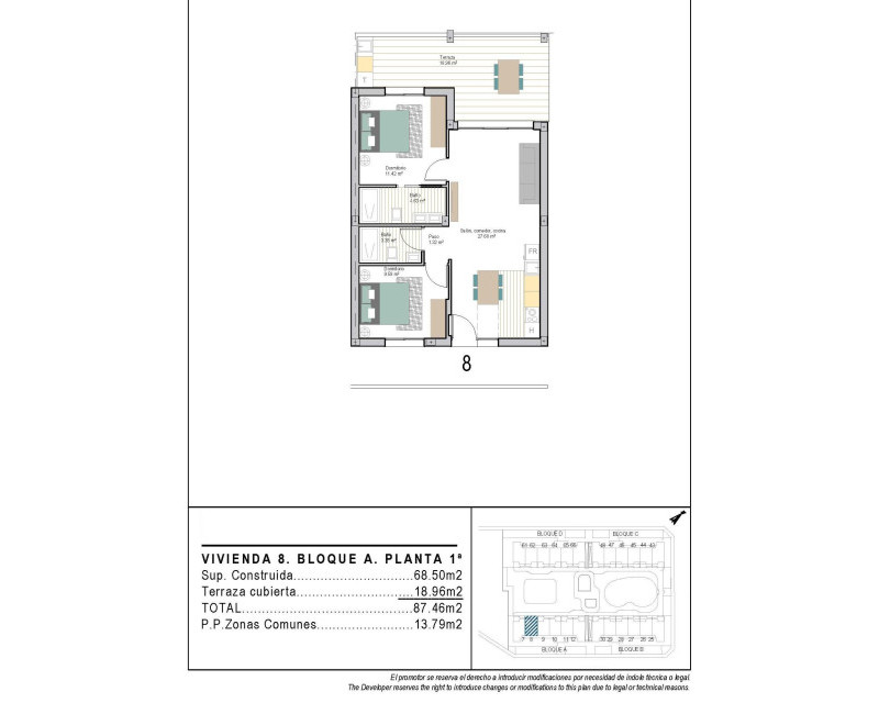 Modern New Build Apartments in San Cayetano, Torrepacheco, Murcia Contemporary Living in a Peaceful Mediterranean Setting This exclusive new residential complex is located in San Cayetano, Murcia, part of the municipality of Torre Pacheco, just 9 km from the sea and surrounded by several renowned golf courses. The project combines tranquility, comfort and contemporary design, offering an ideal environment for permanent living, holiday use or investment on the Costa Calida. The development consists of 72 apartments with 2 and 3 bedrooms and 2 bathrooms, one of them ensuite, distributed across four modern buildings. A second phase with bungalows and villas is also planned, adding further value and appeal to the area. Designed Communal Areas for Relaxation and Wellbeing Residents will enjoy carefully landscaped communal spaces that include two swimming pools, beautiful gardens and a fully equipped gym. These areas create a pleasant and social environment where neighbors can relax, exercise and enjoy the Mediterranean lifestyle. The residential complex also features 40 kW of photovoltaic solar panels that help support the community electricity costs, contributing to a more sustainable and energy efficient living environment. Apartments with Private Outdoor Spaces and Solarium Each apartment is designed to make the most of outdoor living. Ground floor properties include private gardens, first floor apartments offer spacious terraces, and top floor homes benefit from both a terrace and a private rooftop solarium. All properties include a summer kitchen on the terrace or solarium, perfect for enjoying the sun all year round. All homes come with an outdoor parking space and a private storage room in the basement, adding extra convenience and practicality. Quality Features and Energy Efficient Installations These new build apartments are delivered with quality finishes and modern installations to ensure comfort and functionality, including: Fully fitted kitchen with appliances Fully equipped bathrooms with furniture, mirror, lighting and shower screens Preinstallation for ducted air conditioning Aerothermal system for hot water The combination of modern materials and energy efficient systems makes these homes ideal for year round use. Excellent Location Close to Golf, Beaches and Services San Cayetano is a quiet and well connected village with local amenities, shops and services. Its strategic location allows easy access to beaches, golf courses and major transport links. Key distances to points of interest include: Mar Menor beaches 9 km Roda Golf 6 km La Serena Golf 14 km Los Alcazares 10 km Cartagena 30 km Murcia Corvera Airport 25 km Alicante Airport 90 km Secure Your Property in San Cayetano Today This modern residential complex offers an excellent opportunity to enjoy Mediterranean living in a peaceful yet well connected area. Contact us today for more information and reserve your new build apartment in San Cayetano.