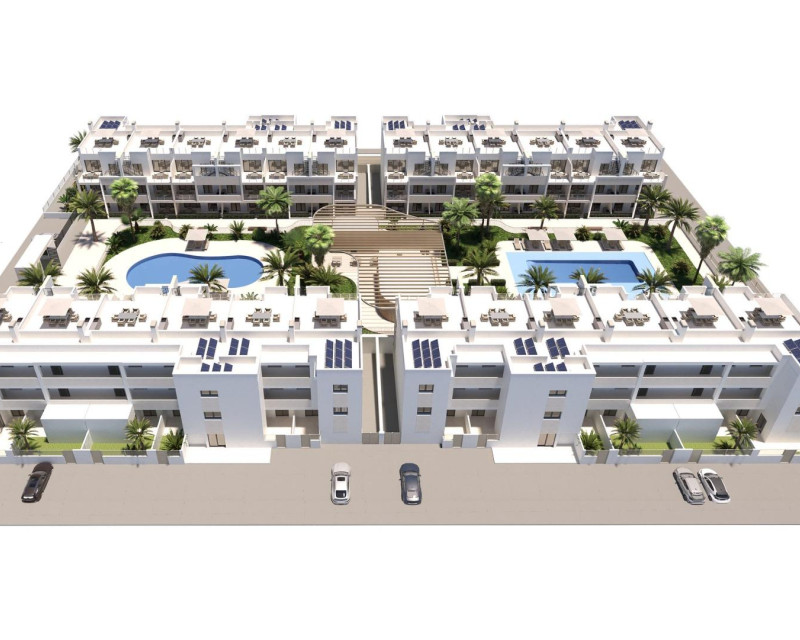 Modern New Build Apartments in San Cayetano, Torrepacheco, Murcia Contemporary Living in a Peaceful Mediterranean Setting This exclusive new residential complex is located in San Cayetano, Murcia, part of the municipality of Torre Pacheco, just 9 km from the sea and surrounded by several renowned golf courses. The project combines tranquility, comfort and contemporary design, offering an ideal environment for permanent living, holiday use or investment on the Costa Calida. The development consists of 72 apartments with 2 and 3 bedrooms and 2 bathrooms, one of them ensuite, distributed across four modern buildings. A second phase with bungalows and villas is also planned, adding further value and appeal to the area. Designed Communal Areas for Relaxation and Wellbeing Residents will enjoy carefully landscaped communal spaces that include two swimming pools, beautiful gardens and a fully equipped gym. These areas create a pleasant and social environment where neighbors can relax, exercise and enjoy the Mediterranean lifestyle. The residential complex also features 40 kW of photovoltaic solar panels that help support the community electricity costs, contributing to a more sustainable and energy efficient living environment. Apartments with Private Outdoor Spaces and Solarium Each apartment is designed to make the most of outdoor living. Ground floor properties include private gardens, first floor apartments offer spacious terraces, and top floor homes benefit from both a terrace and a private rooftop solarium. All properties include a summer kitchen on the terrace or solarium, perfect for enjoying the sun all year round. All homes come with an outdoor parking space and a private storage room in the basement, adding extra convenience and practicality. Quality Features and Energy Efficient Installations These new build apartments are delivered with quality finishes and modern installations to ensure comfort and functionality, including: Fully fitted kitchen with appliances Fully equipped bathrooms with furniture, mirror, lighting and shower screens Preinstallation for ducted air conditioning Aerothermal system for hot water The combination of modern materials and energy efficient systems makes these homes ideal for year round use. Excellent Location Close to Golf, Beaches and Services San Cayetano is a quiet and well connected village with local amenities, shops and services. Its strategic location allows easy access to beaches, golf courses and major transport links. Key distances to points of interest include: Mar Menor beaches 9 km Roda Golf 6 km La Serena Golf 14 km Los Alcazares 10 km Cartagena 30 km Murcia Corvera Airport 25 km Alicante Airport 90 km Secure Your Property in San Cayetano Today This modern residential complex offers an excellent opportunity to enjoy Mediterranean living in a peaceful yet well connected area. Contact us today for more information and reserve your new build apartment in San Cayetano.