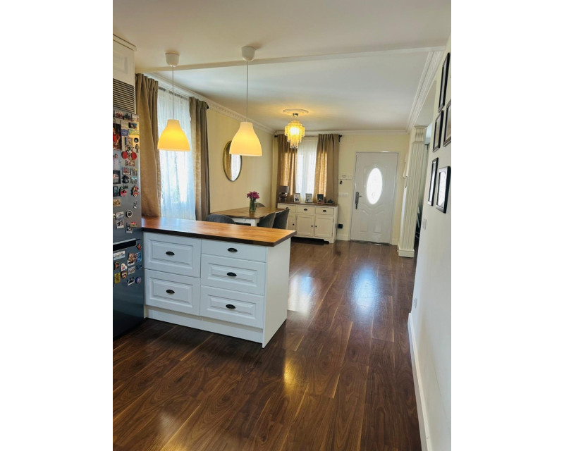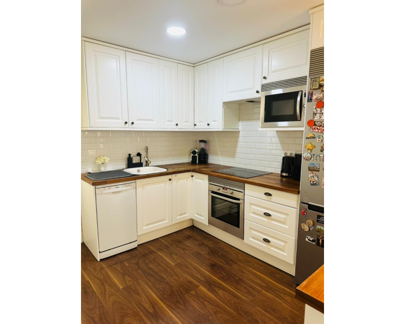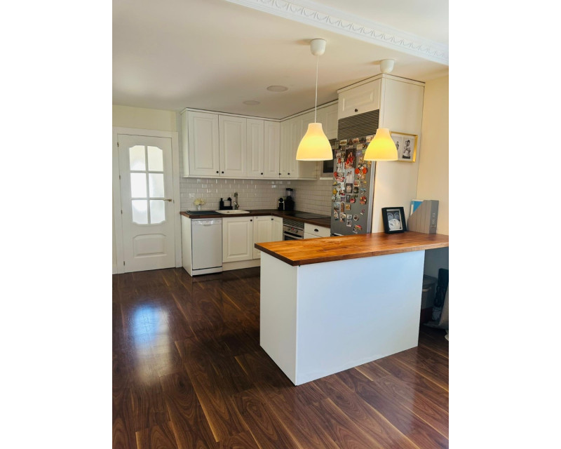 Bright and spacious living-dining area with an open-plan kitchen, creating a functional and social space. This level also includes one bedroom with built-in wardrobe and one bathroom. From the kitchen, an internal staircase leads to the upper floor.