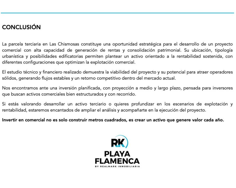ENGLISH (British English)~Tertiary Plot in Las Chismosas – Commercial Project with 7.49% Annual Gross Yield~~We present a strategic investment opportunity in urban tertiary land located on Calle Gorrión, Las Chismosas (Orihuela Costa), a well-established residential area with a high density of both permanent and international residents, ideal for commercial development.~~The plot measures 1,206.96 sqm, with a buildable area of up to 587 sqm, intended for the development of three commercial units with the option of a basement level, suitable for office use, academy, restaurant or other uses compatible with tertiary zoning.~~Key Project Features~~Urban classification: Urban land – Tertiary~Buildability: 587 sqm~Planned development: 3 commercial units~~Unit A: 80 sqm~Unit B: 170 sqm~Unit C: 250 sqm~~Preliminary design, technical layout studies and 3D visualisation included in the feasibility analysis.~~Financial Study and Profitability~~Estimated total investment: €1,090,000*~~Plot: €250,000~Construction cost: €770,800~Technical project: €45,000~Licences: €28,000~~Estimated rental income:~€6,800/month~€81,600/year~~Estimated gross annual yield: 7.49%~Estimated payback period: between 13 and 14 years~~(*Taxes not included)~~Strategic Approach~~This project is conceived not merely as a development, but as the creation of a commercial investment asset designed to generate recurring cash flow, with medium- and long-term capital appreciation potential.~~Its location within a consolidated residential area, close to main access routes and services, supports the attraction of stable operators and medium- to long-term lease agreements, reducing volatility and strengthening the asset’s structure.~~Investment Opportunity~~This is a structured investment, supported by prior urban planning, technical and financial analysis, aimed at investors seeking:~~Well-dimensioned commercial assets~Returns above traditional investment products~Recurring income generation~Asset consolidation on the Costa Blanca~~If you are considering developing a tertiary asset in Orihuela Costa or would like further information regarding financial scenarios, tax optimisation or operational strategy, we would be pleased to assist you throughout the entire process.~~Investing in commercial property is not simply about building square metres, but about designing an asset that generates value year after year.~~Price: €250,000. Taxes and purchase costs not included (in accordance with applicable regulations). Agency fees for the buyer are included in the asking price. A detailed breakdown of additional costs will be provided prior to reservation.