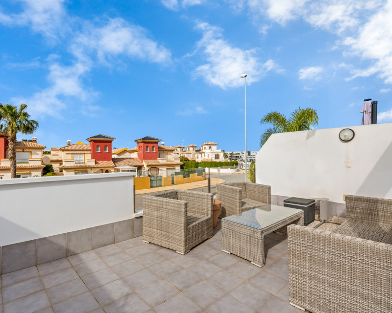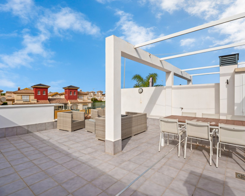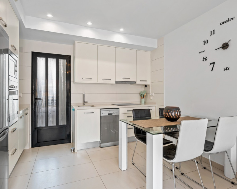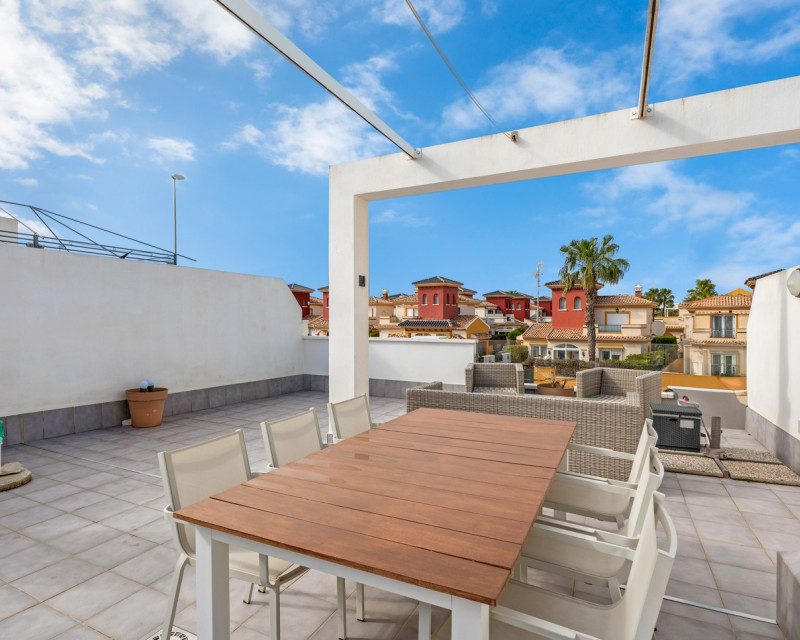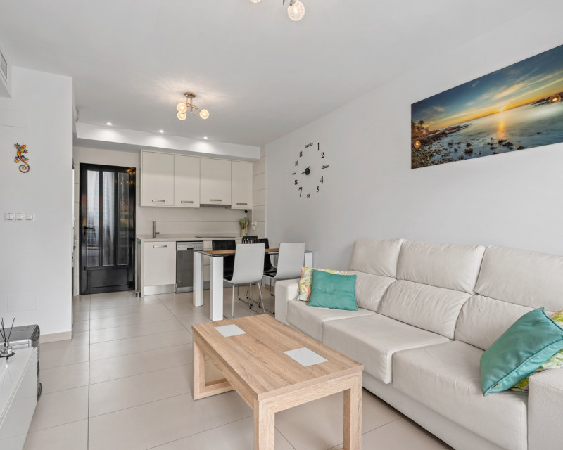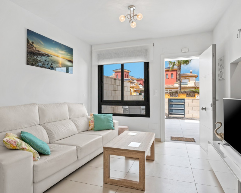 Located in one of the most sought after areas of the Costa Blanca, this well maintained bungalow in Orihuela Costa is situated within a gated and well kept residential complex with a communal swimming pool. Built in 2016, the property combines comfort, outdoor space and an excellent location close to all amenities and the coast. The bungalow offers two bedrooms and two bathrooms and features a practical layout with an open living area and kitchen that creates a pleasant sense of space and comfort. From the living area you have access to the terrace and the garden at the front of the property, a lovely place to relax and enjoy the Mediterranean climate. The property also features a spacious private solarium, ideal for sunbathing, enjoying the surroundings or spending time with family and friends. The bungalow is sold fully furnished, including household items, which makes it ready to move into immediately. In addition, a car is included in the price, a Renault Megane Scenic from 2016 with approximately 50000 kilometres. Within the gated complex there is a communal swimming pool where residents can enjoy relaxation in a pleasant and well maintained environment. The property also benefits from a private parking space. Thanks to its location in Orihuela Costa, beaches, restaurants, shops, golf courses and other amenities are all within a short distance, making this property ideal as a holiday home, rental investment or comfortable permanent residence. A property that combines comfort, outdoor living and an excellent location.