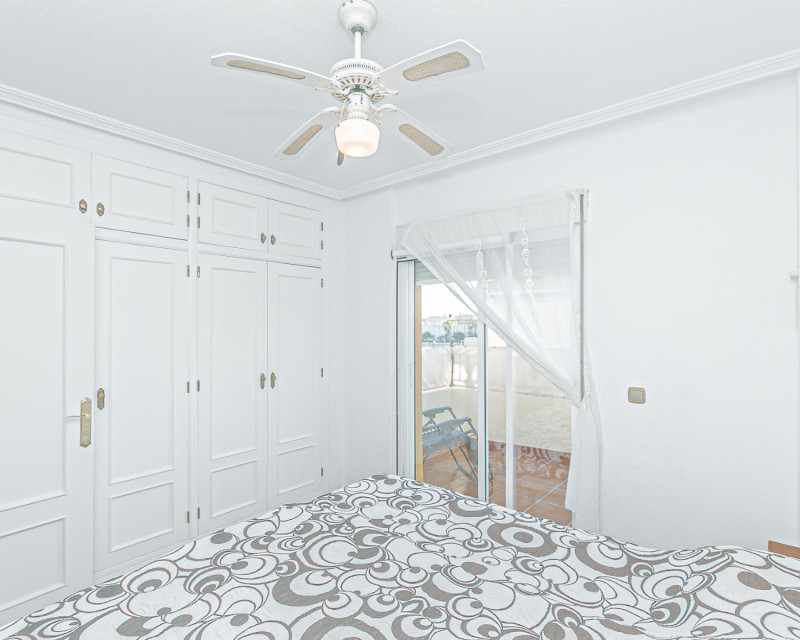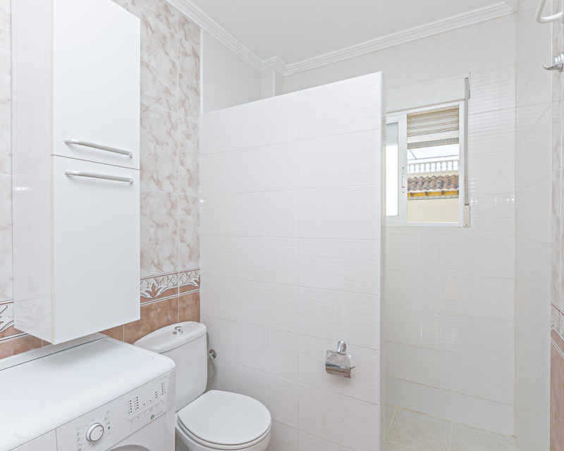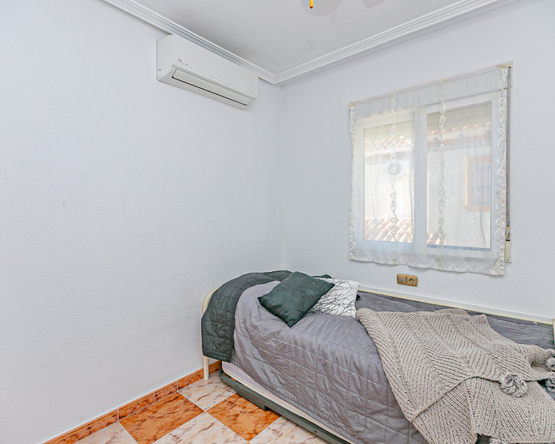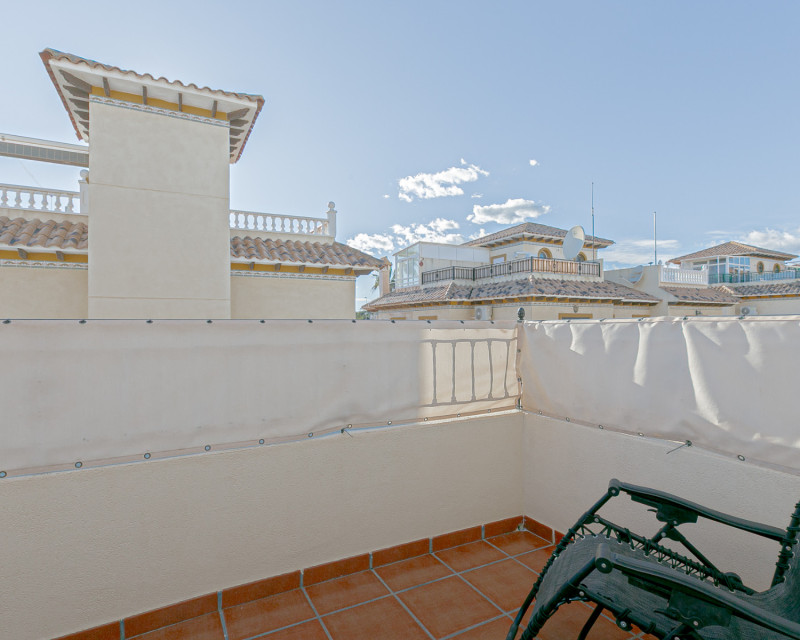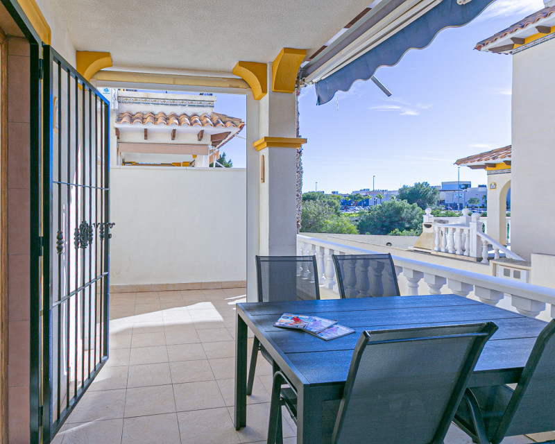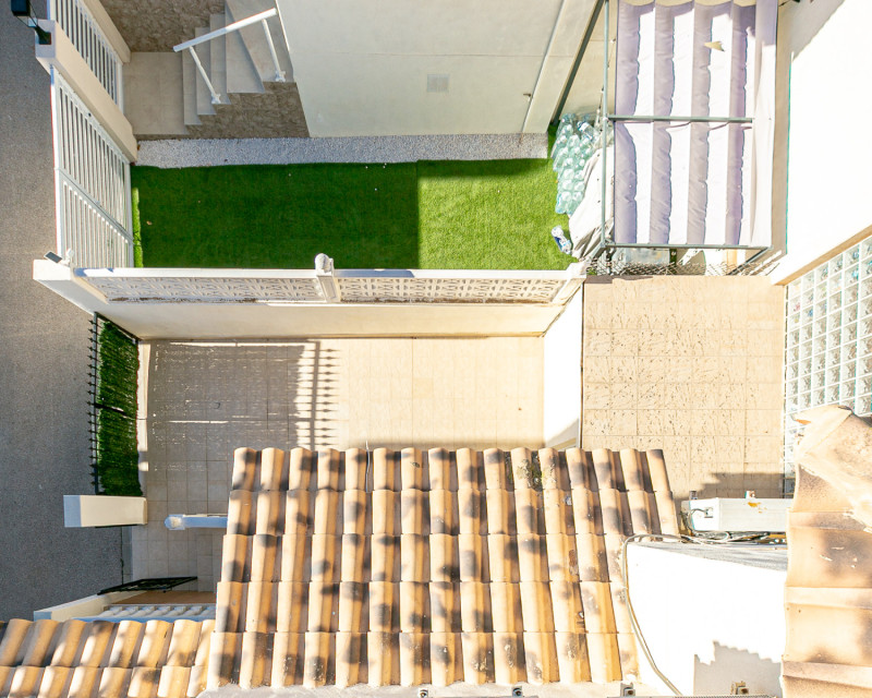 We are pleased to present this charming south-facing quad villa, located in one of the most sought-after areas of the Costa Blanca, between La Zenia and Playa Flamenca, within a gated residential complex with a communal swimming pool, ideal for enjoying a peaceful and comfortable lifestyle all year round. The property features an independent entrance and offers the convenience of private on-plot parking, as well as a practical storage room, perfect for bicycles, beach equipment, or additional storage needs. Accessed via a staircase, we arrive at a welcoming terrace equipped with awnings, an ideal space to relax and enjoy the Mediterranean climate, even during the warmer summer months. Inside, the home opens into a bright living room, seamlessly connected to a fully refurbished modern kitchen with an elegant breakfast bar. On the ground floor, there is a first bedroom and a guest toilet, adding comfort and functionality. The first floor comprises two spacious bedrooms with fitted wardrobes; the master bedroom benefits from direct access to a private terrace. A modern family bathroom with walk-in shower completes this level. At the top of the property, a private rooftop solarium offers open views and distant sea views, providing the perfect setting for sunbathing, entertaining, or simply unwinding. All rooms are equipped with air conditioning, and the property is sold fully furnished and with appliances, ready to move into immediately. The excellent location places you within easy reach of all amenities: close to the weekly Playa Flamenca market, just minutes from La Zenia Boulevard shopping centre, and a short drive from the beautiful beaches of La Zenia and Playa Flamenca. A home that perfectly combines location, comfort, and lifestyle, ideal as a permanent residence, holiday home, or investment opportunity. Contact us today to arrange your viewing and experience this wonderful property for yourself.