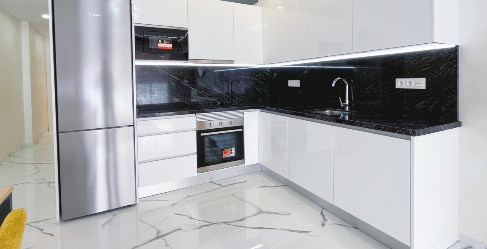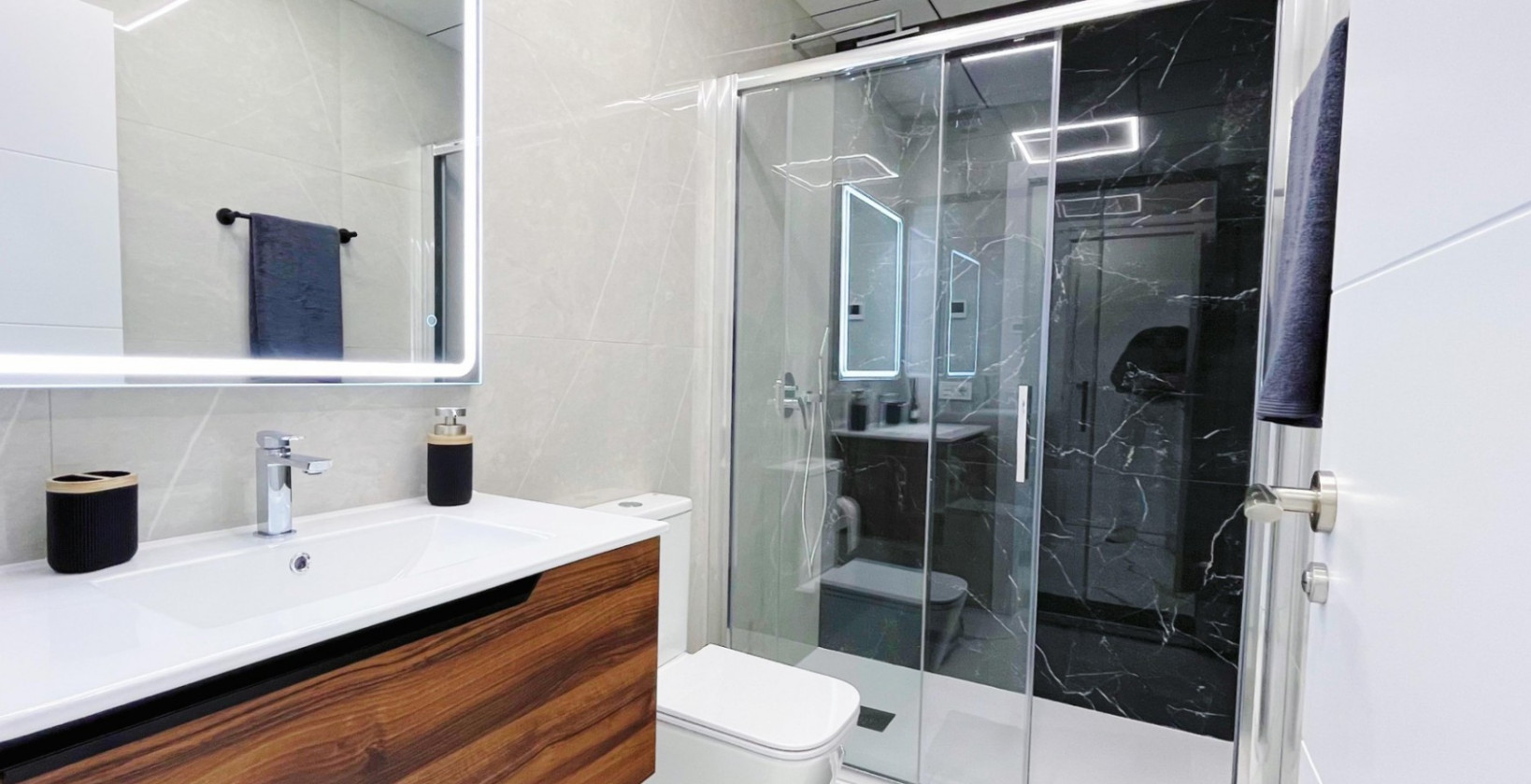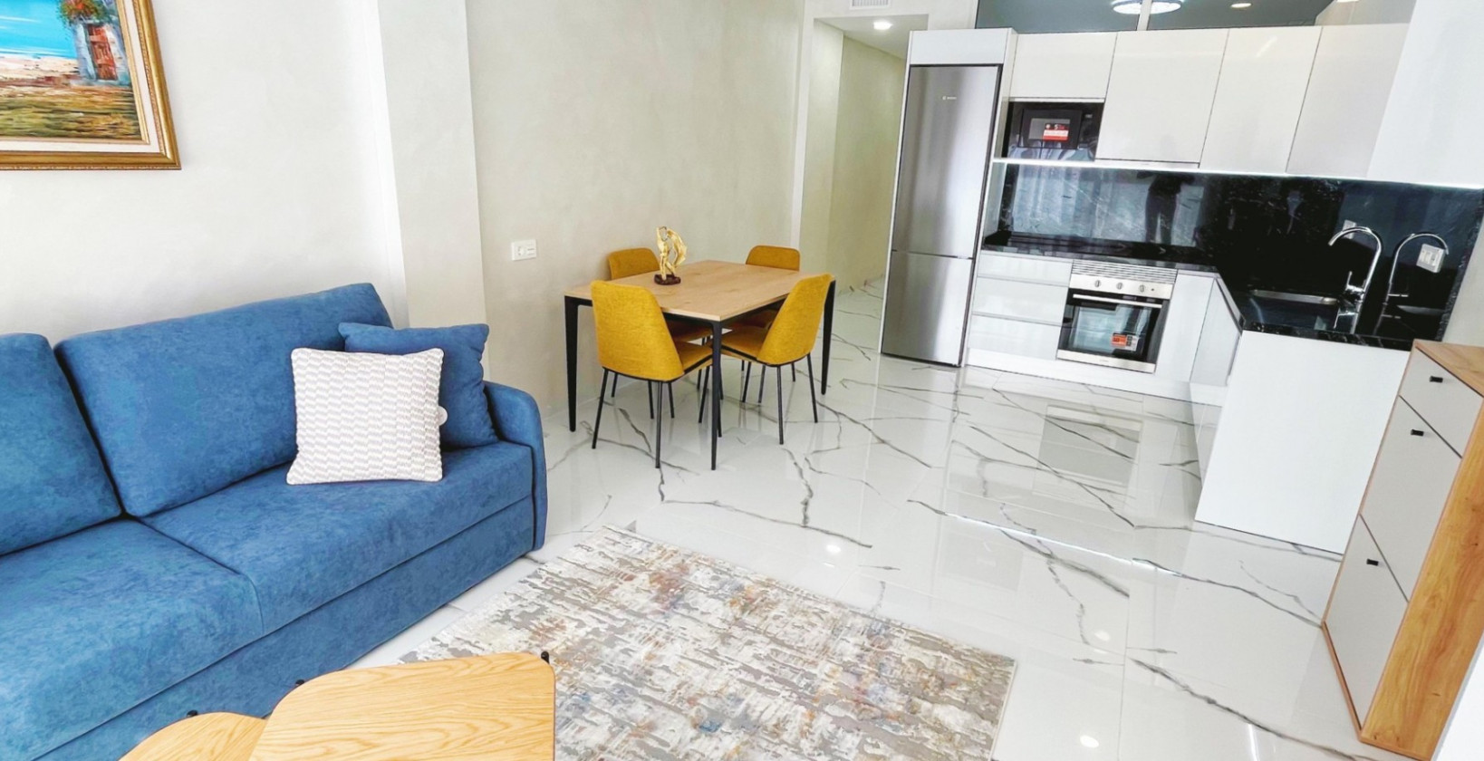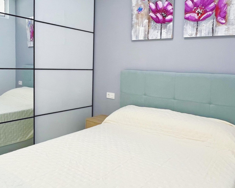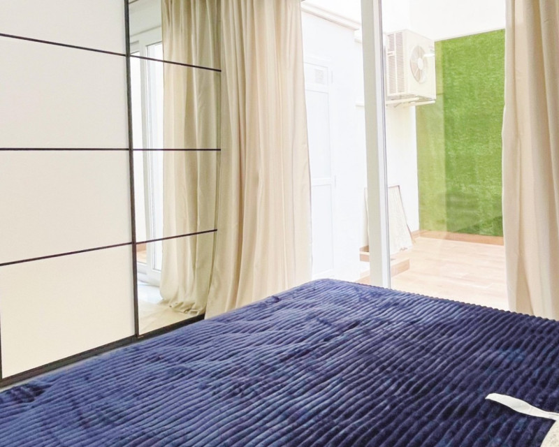 Located in the prime beachfront area of Avenida de la Purísima, just steps from Playa del Cura, this stylish ground floor apartment offers the perfect balance of coastal lifestyle and modern elegance. With 90 m² of built space, the home features 2 spacious bedrooms, 2 luxurious bathrooms, and a beautifully designed private patio—making it ideal as a permanent residence, a premium holiday home, or an attractive rental investment. Inside, the apartment boasts a bright open-plan living and dining area, floor-to-ceiling windows, and sleek interior finishes. The contemporary kitchen is fitted with top-quality appliances, matte black countertops, and elegant cabinetry. Both bedrooms are tastefully furnished with designer wardrobes and plush bedding, while the master suite opens directly to a private patio featuring an outdoor shower, artificial grass wall, and wood accents—a peaceful space to unwind after a day at the beach. The two bathrooms are finished with high-end ceramic and marble-look tiles, LED-lit mirrors, and walk-in glass showers for a touch of hotel-style comfort. Key Features: 2 bedrooms and 2 bathrooms Private internal patio with outdoor shower Fully furnished and move-in ready BOSCH kitchen appliances Elegant white marble-effect floors LED mirrors and designer finishes Fitted wardrobes and extra storage East-facing with natural light throughout Heating and air conditioning Accessible entrance for reduced mobility Surrounded by shops, restaurants, and 24h pharmacy Just 100 meters from the sea This is a rare opportunity to own a fully renovated, turnkey apartment in one of Torrevieja’s most sought-after locations, combining modern comfort, unbeatable convenience, and timeless style. Book your private viewing now!