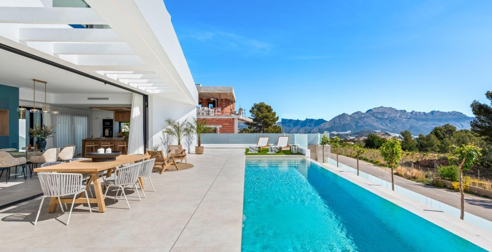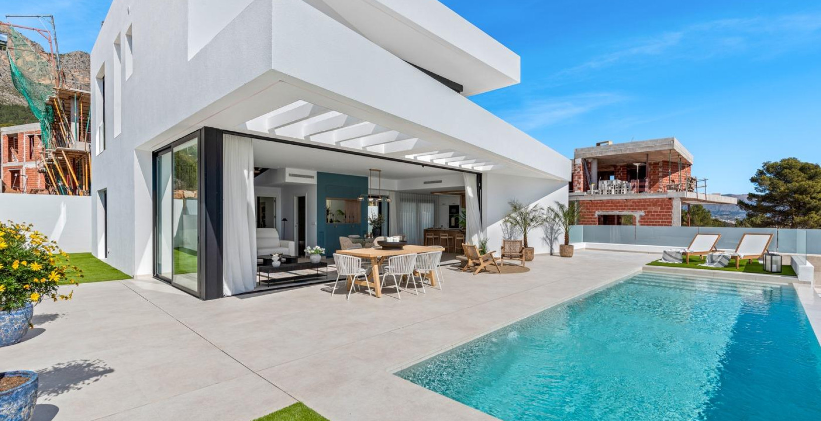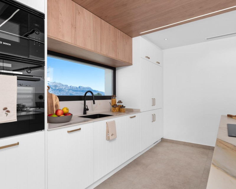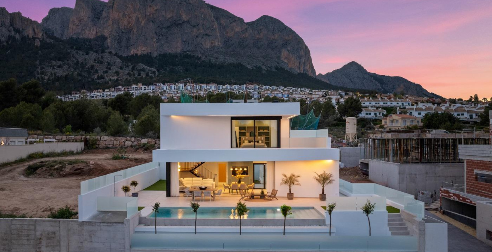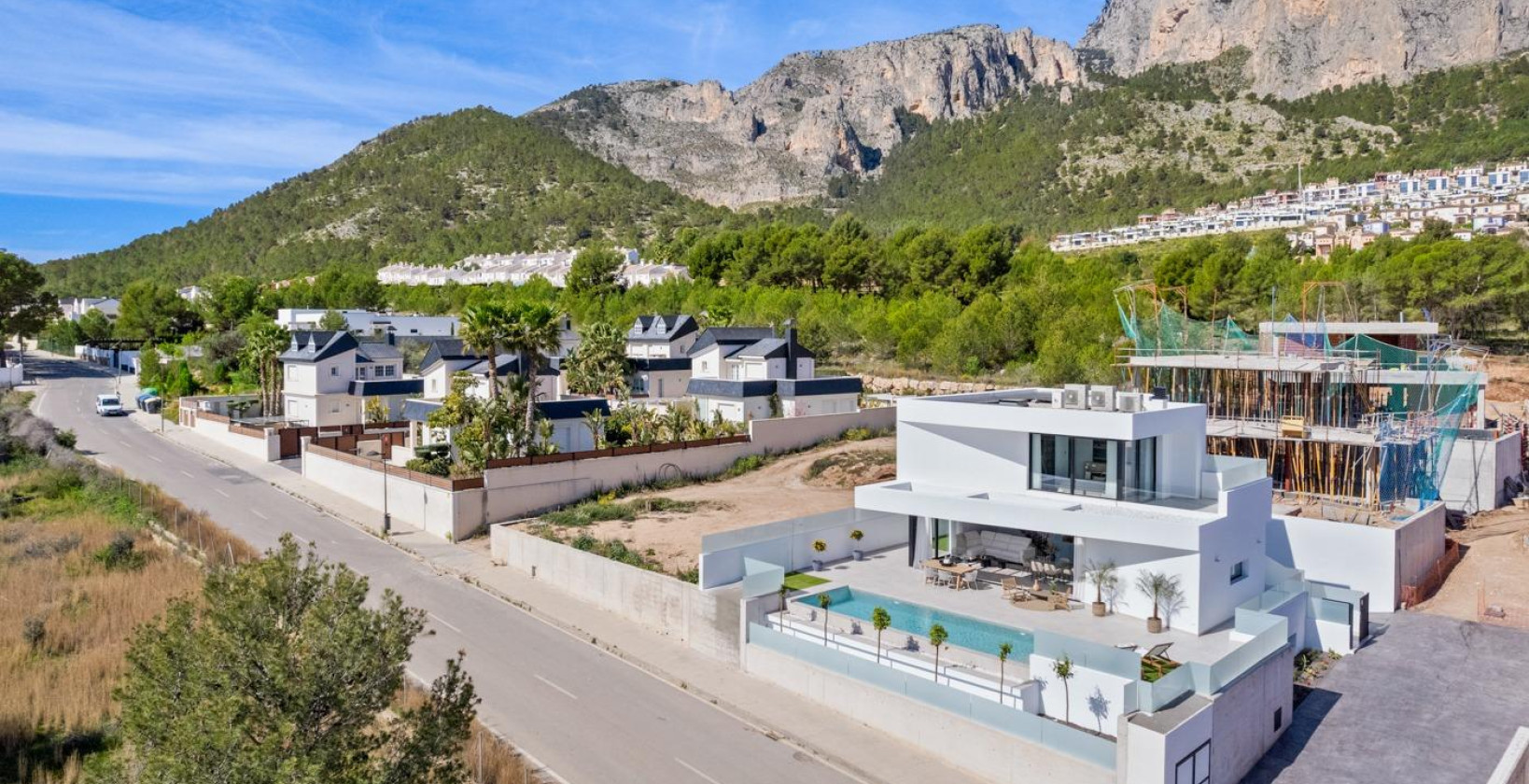 NEW BUILD VILLAS IN POLOP New Build residential of 46 villas in Polop. Modern villas build over 3 floors, has 3 bedrooms, 3 bathrooms, guest toilet, open plan modern kitchen with large living/dining room has direct access to the terrace with the pool, fitted wardrobes, basement with garage and storeroom, air conditioning, white goods. The city of Polop offers an amazing range of options for lovers of the great outdoors surrounded by nature and unparalleled peace. The municipality enjoys a Mediterranean climate with cooler temperatures and cleaner air, located less than 10 kilometres from Benidorm, Altea and their beaches. It stretches from the rivers Guadalest and Algar to the town of Villajoyosa, including the beaches of Albir and Benidorm; inland it borders Callosa and Guadalest.