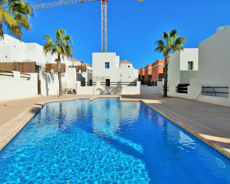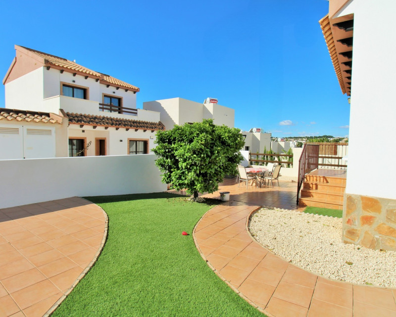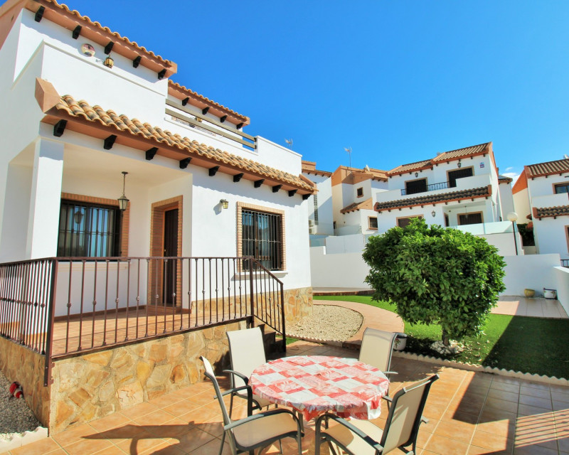 Set on the largest private plot in the entire urbanisation (240m2), this beautifully maintained Mediterranean-style detached 3 bedroom villa is located in the sought-after Res. El Palmeral/Illios development in Pau 8, Villamartin. The property enjoys a prime position within the community, just a short stroll from the attractive communal pool. The ground floor offers a bright and open-plan lounge-dining area, a separate fully fitted kitchen, a generously sized double bedroom with fitted wardrobes, and a bathroom complete with a walk-in shower. Upstairs, you'll find two further double bedrooms, both with fitted wardrobes and direct access to a spacious South-facing balcony boasting sea views. One of the upstairs bedrooms also benefits from an additional private balcony. A well-appointed family bathroom completes the upper floor. Outside, the villa features an abundance of outdoor space, including a raised terrace, ideal for enjoying the Mediterranean climate. The home is sold fully furnished, including white goods and air-conditioning, plus solar water heating, offering a move-in ready opportunity. Conveniently located within walking distance of the vibrant Villamartin Plaza and golf course, the property is close to a wide range of amenities including shops, bars, and restaurants. The beautiful Blue Flag beaches of the Orihuela Costa and the renowned Zenia Boulevard shopping centre are just a 10-minute drive away. This is a rare opportunity to acquire a detached villa in a superb location – perfect for permanent living or as a holiday home.