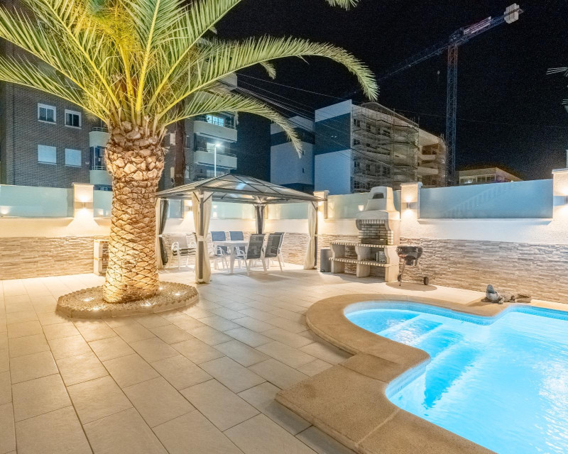 I present this interesting, fully renovated townhouse. "Two in one," it consists of two connected but independent houses, ideal for a large family. It is located in Punta Prima, Orihuela Costa, just 400 meters from the sea.~~The property has a spacious 260 m2 built area, offering a spacious layout. It features two spacious renovated living rooms and two fully equipped kitchens with furniture and appliances. It has four bedrooms and three bathrooms, all with large windows and a south-east orientation, both in the bedrooms and throughout the house, allowing natural light to enter each room. It also has a bright terrace with incredible views of the garden and pool.~~Outside, you'll find a magnificent private heated pool with sun loungers perfect for sunny summers, a barbecue area, and a parking space. The entire garden and terrace are equipped with night lighting, providing a magical atmosphere on starry nights.~~What makes this home unique are its solar panels and fireplaces: both conventional and electric.~~It's perfect for a large family! Don't miss this opportunity!~~Contact us to arrange a viewing! I invite you to come and see it!