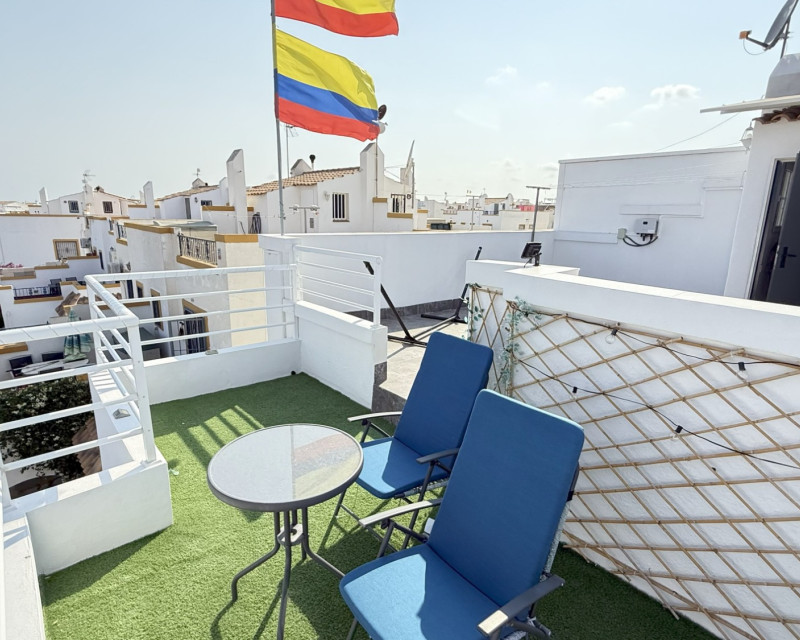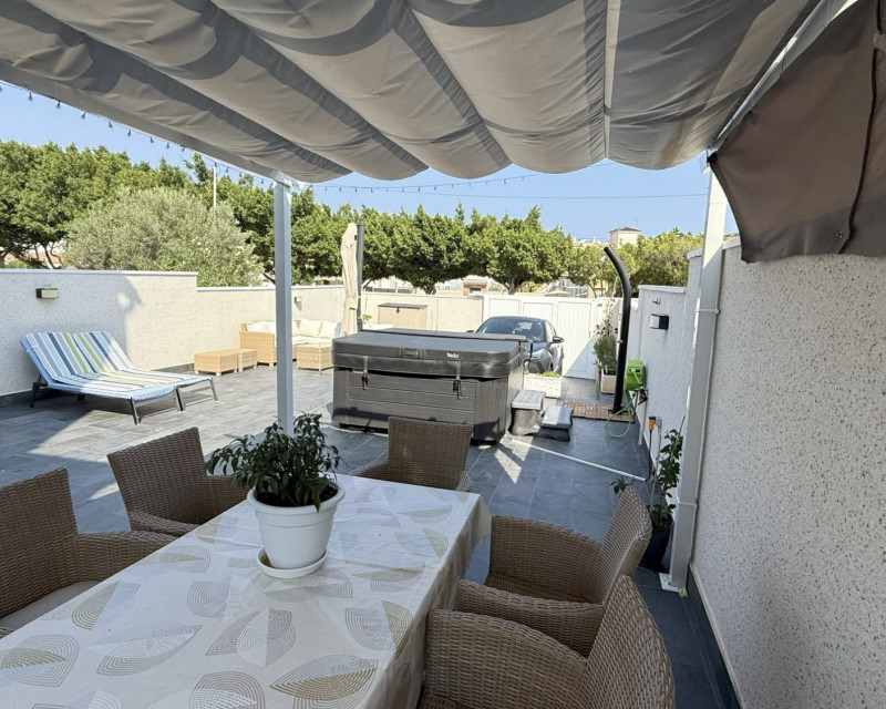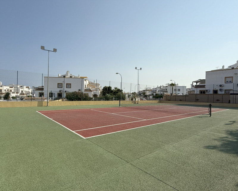 Just a few minutes’ walk from La Zenia Boulevard shopping centre and the coast, this stunning quad house, completely renovated in 2024, combines comfort and style in an unbeatable location. The ground floor features a spacious and inviting living room, a brand-new kitchen fitted with all appliances and ample storage space, as well as a guest bathroom with toilet. On the first floor, there is one bedroom with fitted wardrobes and a large master bedroom with adjoining dressing room and office space. The main bathroom includes a double sink, toilet and modern walk-in shower. The solarium offers beautiful sea views and is equipped with solar panels. Outdoors, you will find a private parking space within the gated plot (not on the street), a generous terrace with built-in barbecue and a storage room. The urbanisation is very well maintained and offers residents a large communal swimming pool and a tennis court, making it a perfect setting for both living and holidays.