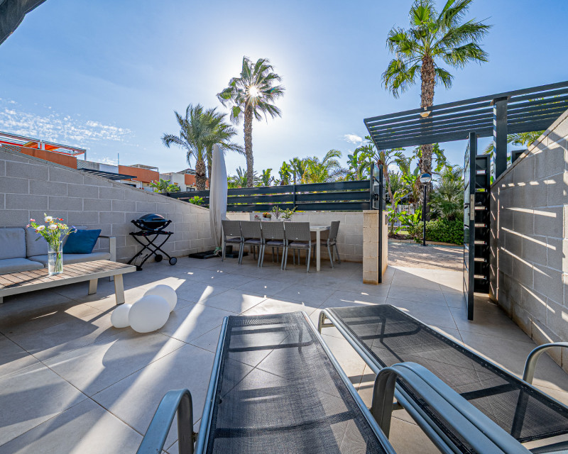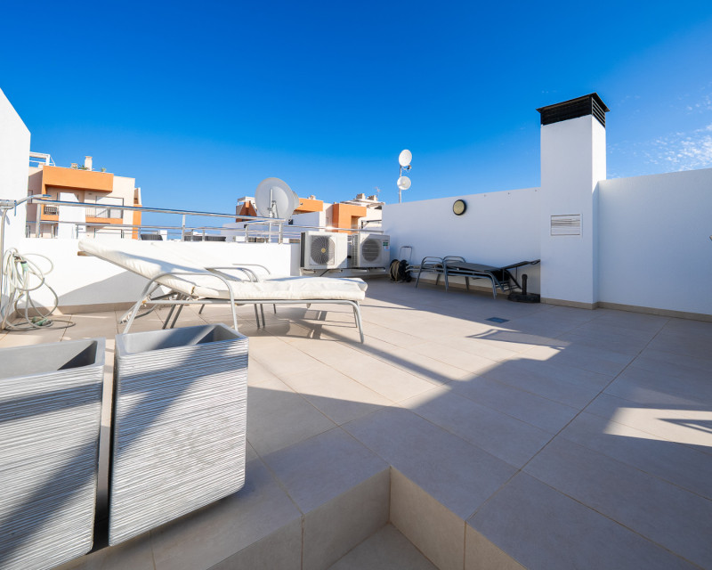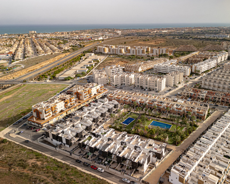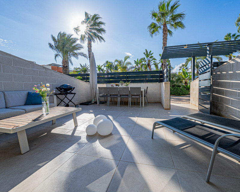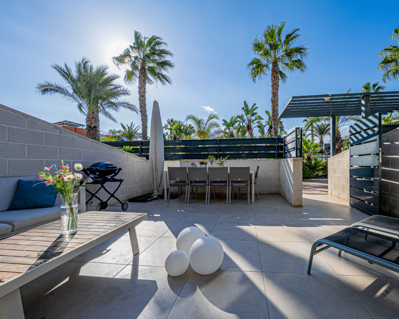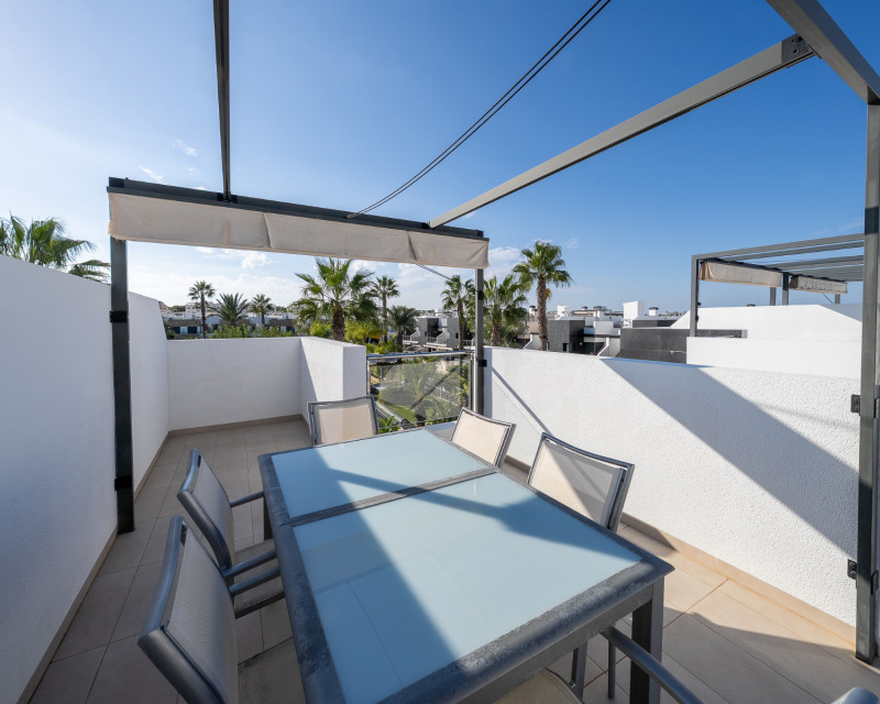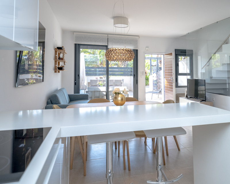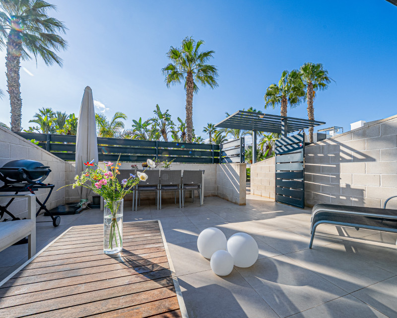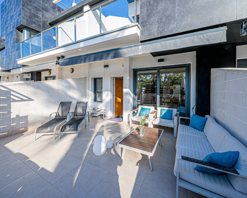 Located in the desirable area of Los Dolses, this well-presented townhouse is set across three levels and combines modern design with practical living. The main floor offers a bright open-plan living and dining area with a contemporary kitchen, an adjoining utility room with a fitted roof, and direct access from the living room to a terrace with an electric awning. The home comprises three double bedrooms and three bathrooms. The spacious underbuild, with heating cables, extra air conditioning, and direct access to the garage, is currently used as an additional living room and bedroom, adding valuable versatility. Steel railings have been fitted along the stairs for added safety. Outdoor living is equally inviting, with a private solarium, terraces overlooking the communal pool, and landscaped green areas within the community. The property is conveniently located within walking distance of local supermarkets, cafés, and restaurants. La Zenia Boulevard shopping centre is only a short bike ride away, while the Blue Flag beaches of the Orihuela Costa can be reached in just a few minutes by car or a pleasant walk. About the Area – Playa Flamenca & Surroundings Playa Flamenca is one of Orihuela Costa’s most established and popular coastal resorts. Known for its beautiful Blue Flag beaches, relaxed Mediterranean lifestyle, and excellent amenities, the area offers something for everyone. Residents enjoy easy access to international restaurants, tapas bars, and a lively weekly street market. For outdoor enthusiasts, there are scenic coastal paths, cycling routes, and several renowned golf courses within a short distance. Playa Flamenca also benefits from excellent transport connections, with Alicante and Murcia airports both reachable in under an hour. A well-maintained property in a prime location—contact us at Inmo Investments today to arrange your viewing.