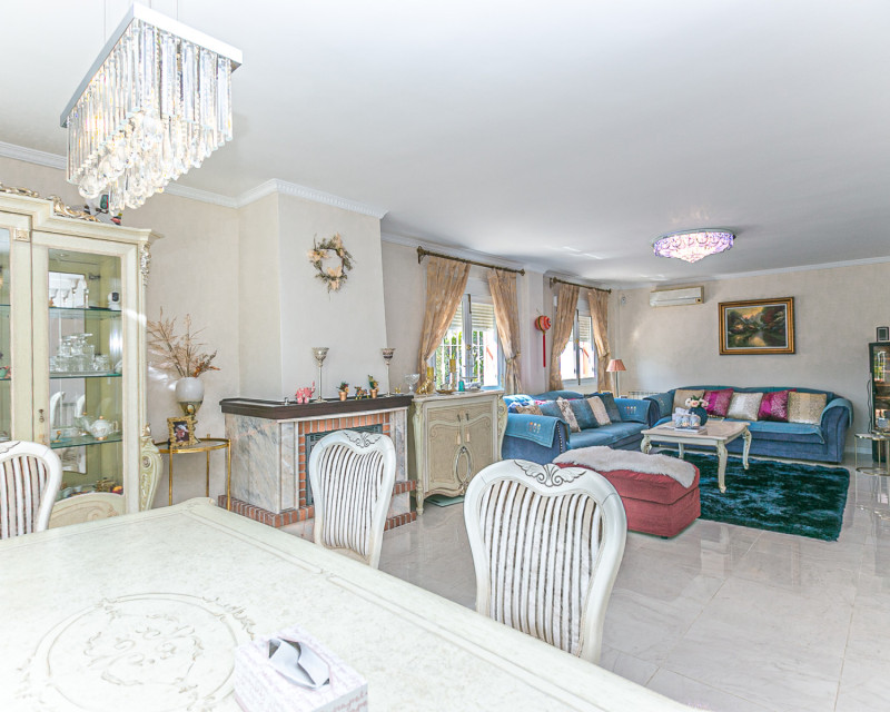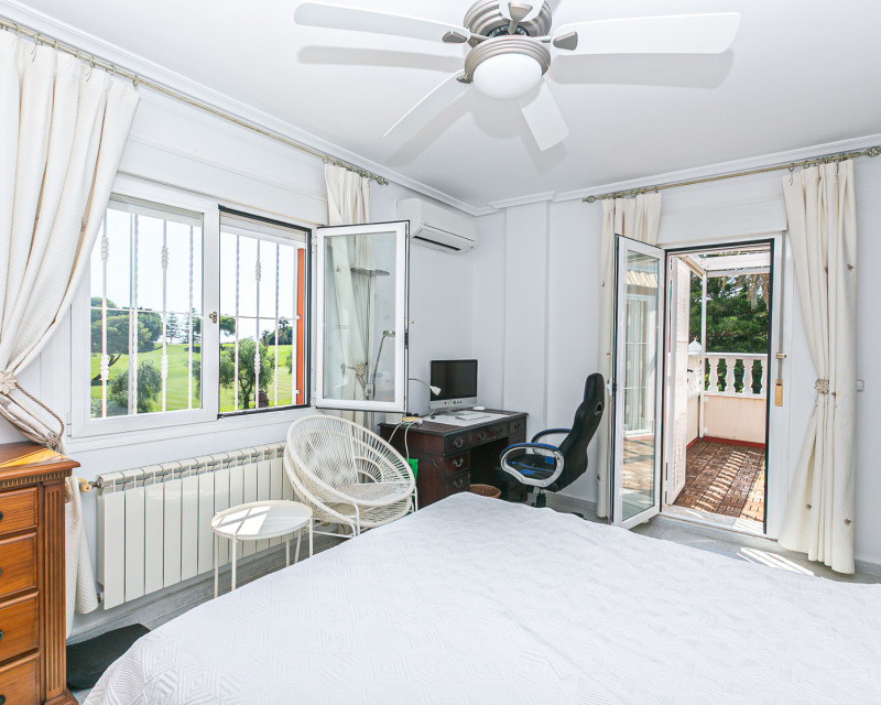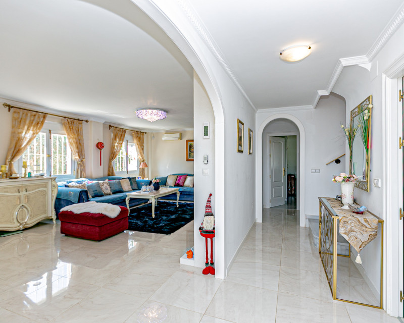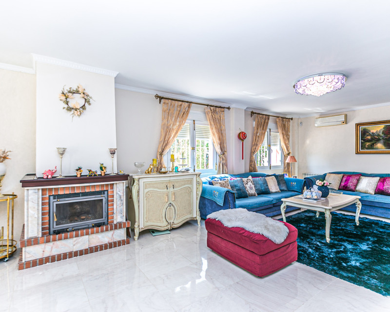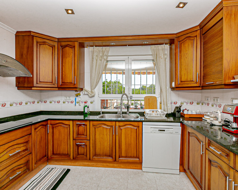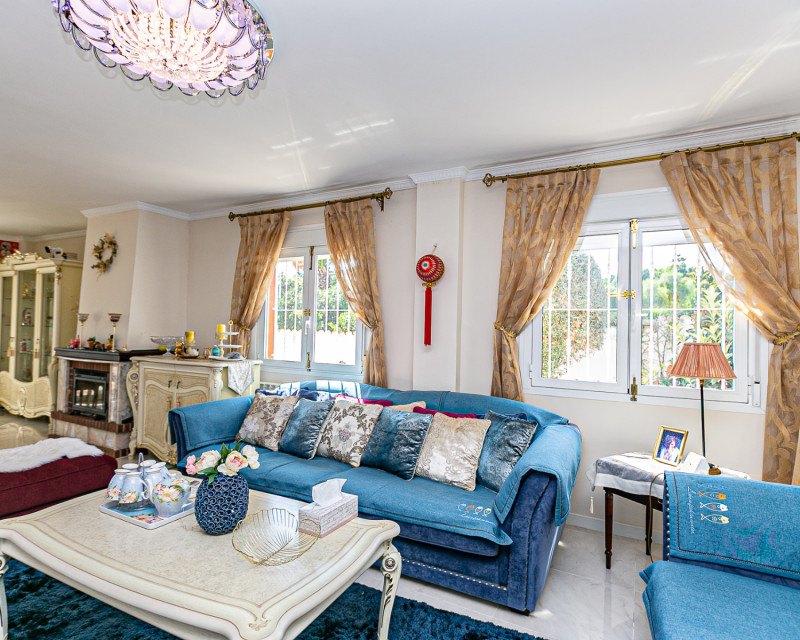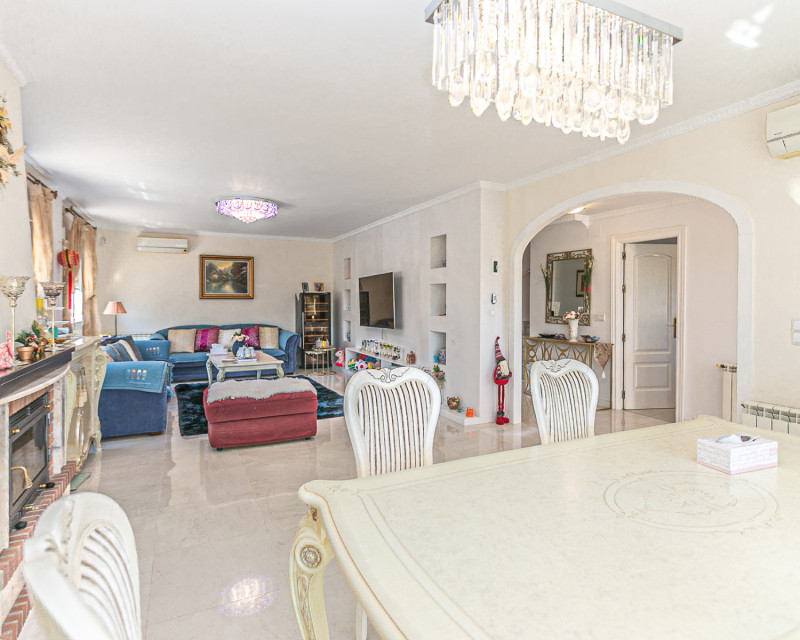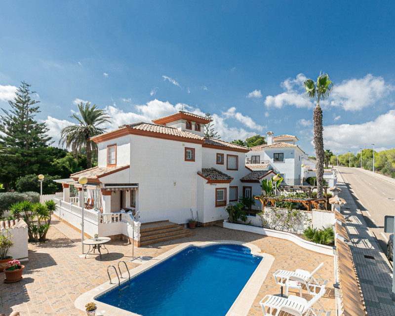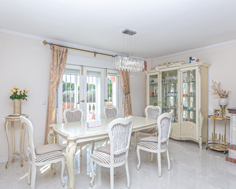 We are delighted to present this magnificent 4-bedroom, 2.5-bathroom villa, located on the frontline of the prestigious Campoamor Golf Course. This unique property, originally with 5 bedrooms, has been carefully modified: one bedroom was sacrificed to enlarge the living-dining area, creating a brighter, more spacious, and welcoming environment. The villa sits on a 604 m² corner plot, offering privacy and unbeatable views of the golf course. It is within walking distance of the clubhouse and the popular La Fuente commercial centre, which offers a wide variety of restaurants, bars, cafés, supermarkets, and services. On the ground floor, there is a spacious and elegant entrance hall from the covered front terrace, a fully fitted independent kitchen with high-quality appliances (including some by Miele), laundry room and pantry. The recently renovated living-dining room features a wood-burning fireplace, a partially marble-clad wall, and large windows that flood the space with light. This floor also includes a modernised guest toilet and a double bedroom currently used as a traditional tea room. The first floor offers three double bedrooms with fitted wardrobes. The master bedroom features double wardrobes, en-suite bathroom with shower and jacuzzi bath, and direct access to a shared terrace overlooking the golf course. Another double bedroom also opens onto this terrace, while a third double bedroom enjoys its own private terrace. There is also a family bathroom with shower. Outside, the property boasts a tiled low-maintenance garden, a beautiful fruit tree at the entrance, a private 9 x 4.8 m swimming pool with sunbathing area, shaded off-road parking, private garage, and several terraces with open views of the natural surroundings. Additional features include: Hot and cold air conditioning throughout Central gas heating Newly tiled ground floor Fully furnished and equipped The property is part of the exclusive Campoamor Golf community, offering exceptional added value: private security, discounts at the restaurant, golf course, and hotel. In addition, the community fee includes irrigation water from the golf course for garden maintenance. A truly unique villa, ideal both as a permanent residence and as a high-level holiday rental, in a privileged location on the Costa Blanca.