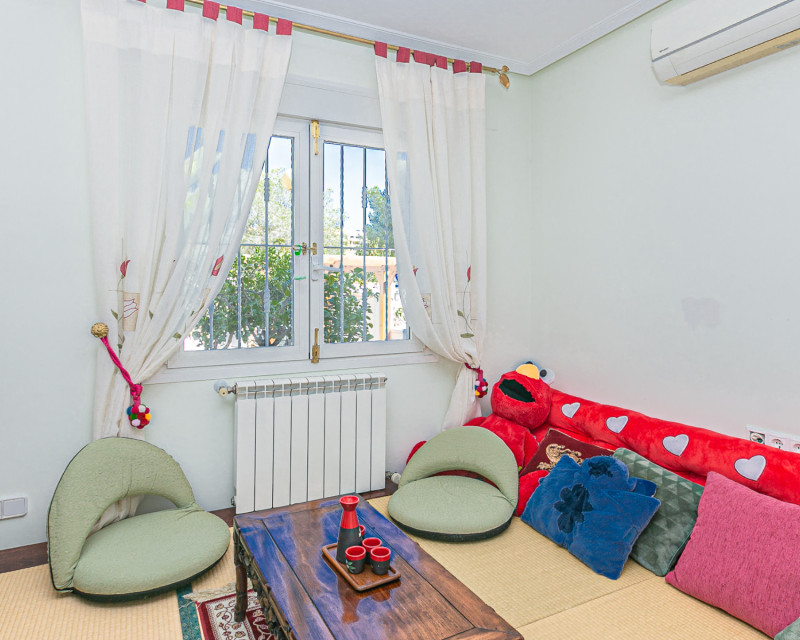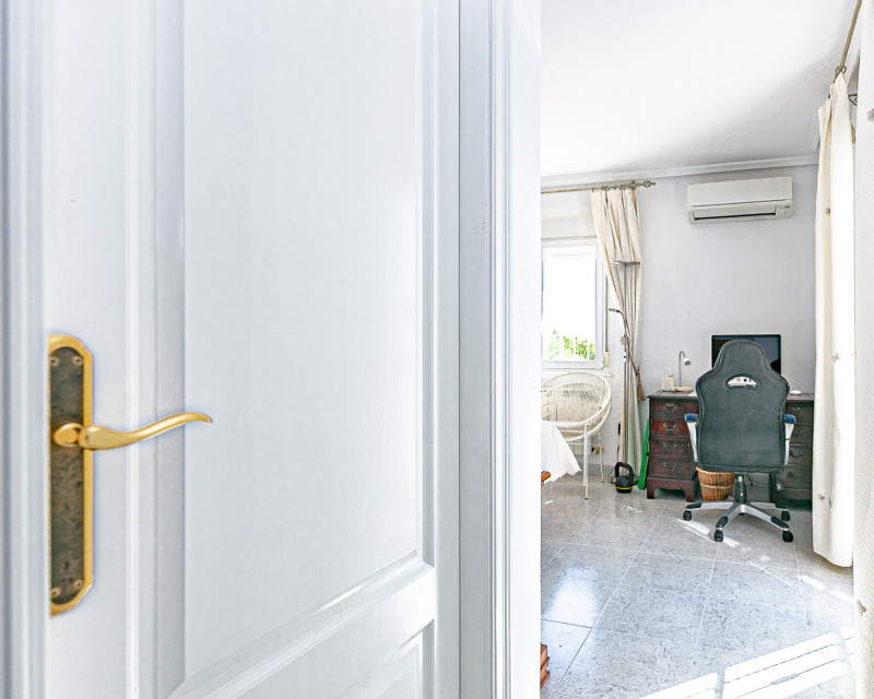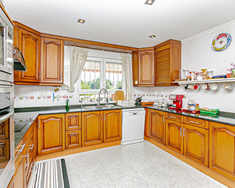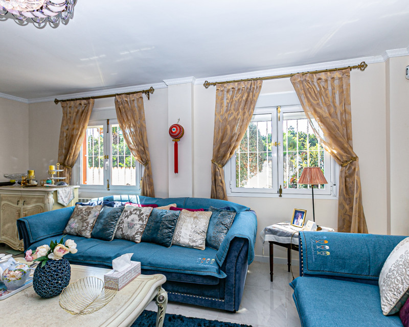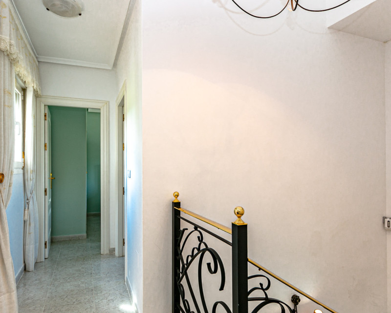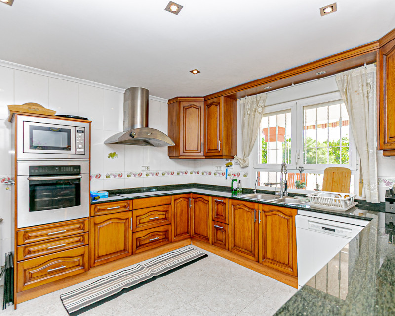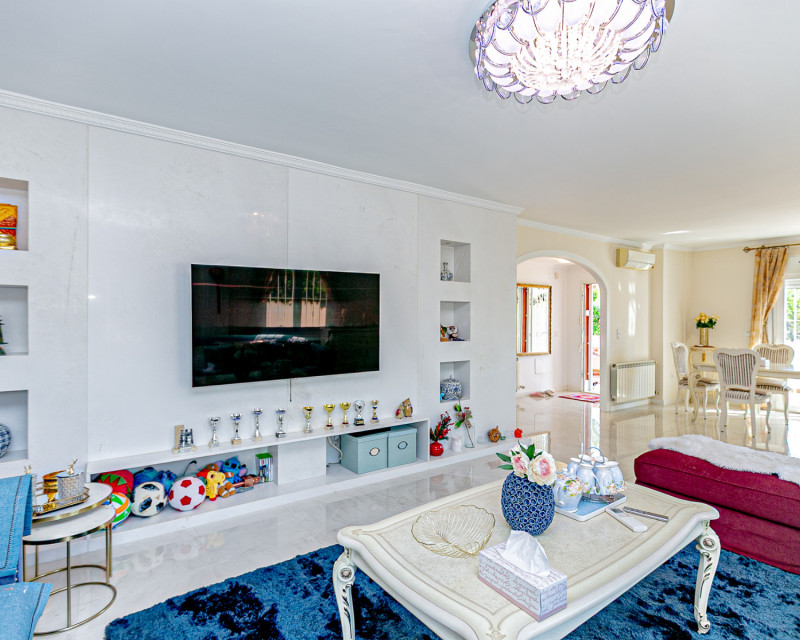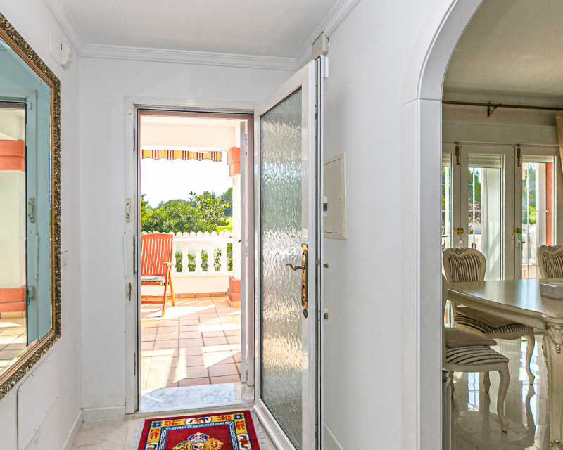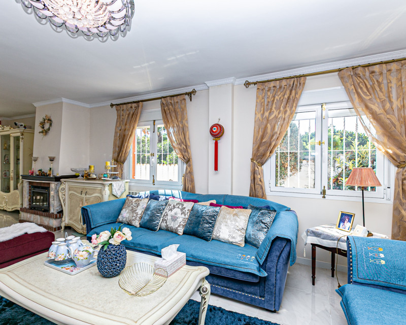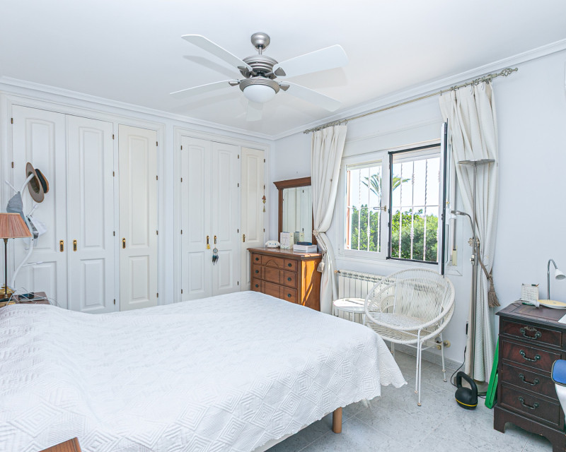 We are delighted to present this magnificent 4-bedroom, 2.5-bathroom villa, located on the frontline of the prestigious Campoamor Golf Course. This unique property, originally with 5 bedrooms, has been carefully modified: one bedroom was sacrificed to enlarge the living-dining area, creating a brighter, more spacious, and welcoming environment. The villa sits on a 604 m² corner plot, offering privacy and unbeatable views of the golf course. It is within walking distance of the clubhouse and the popular La Fuente commercial centre, which offers a wide variety of restaurants, bars, cafés, supermarkets, and services. On the ground floor, there is a spacious and elegant entrance hall from the covered front terrace, a fully fitted independent kitchen with high-quality appliances (including some by Miele), laundry room and pantry. The recently renovated living-dining room features a wood-burning fireplace, a partially marble-clad wall, and large windows that flood the space with light. This floor also includes a modernised guest toilet and a double bedroom currently used as a traditional tea room. The first floor offers three double bedrooms with fitted wardrobes. The master bedroom features double wardrobes, en-suite bathroom with shower and jacuzzi bath, and direct access to a shared terrace overlooking the golf course. Another double bedroom also opens onto this terrace, while a third double bedroom enjoys its own private terrace. There is also a family bathroom with shower. Outside, the property boasts a tiled low-maintenance garden, a beautiful fruit tree at the entrance, a private 9 x 4.8 m swimming pool with sunbathing area, shaded off-road parking, private garage, and several terraces with open views of the natural surroundings. Additional features include: Hot and cold air conditioning throughout Central gas heating Newly tiled ground floor Fully furnished and equipped The property is part of the exclusive Campoamor Golf community, offering exceptional added value: private security, discounts at the restaurant, golf course, and hotel. In addition, the community fee includes irrigation water from the golf course for garden maintenance. A truly unique villa, ideal both as a permanent residence and as a high-level holiday rental, in a privileged location on the Costa Blanca.