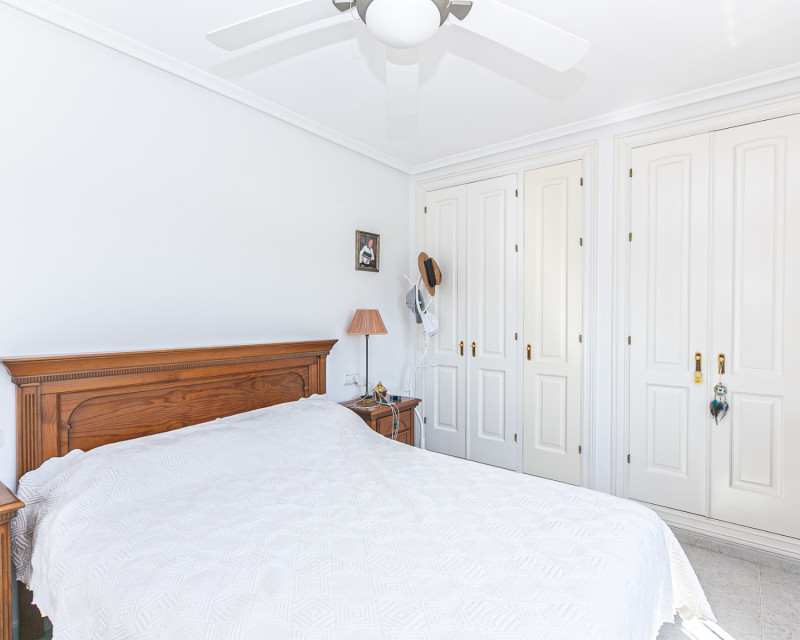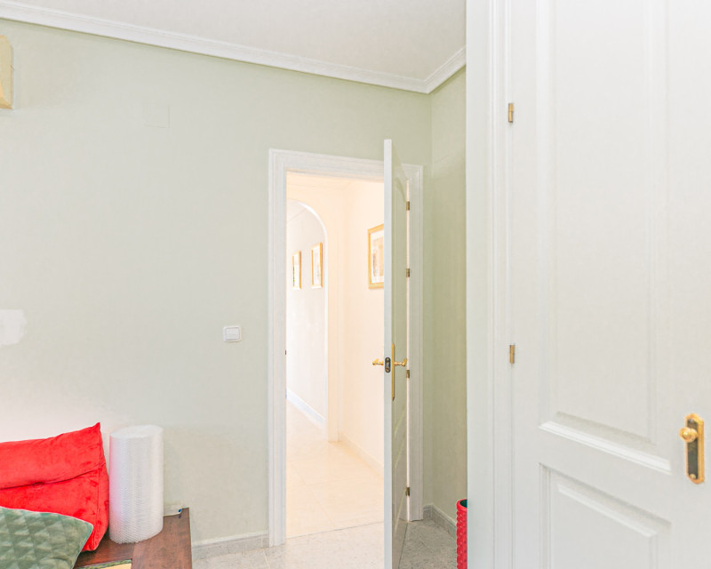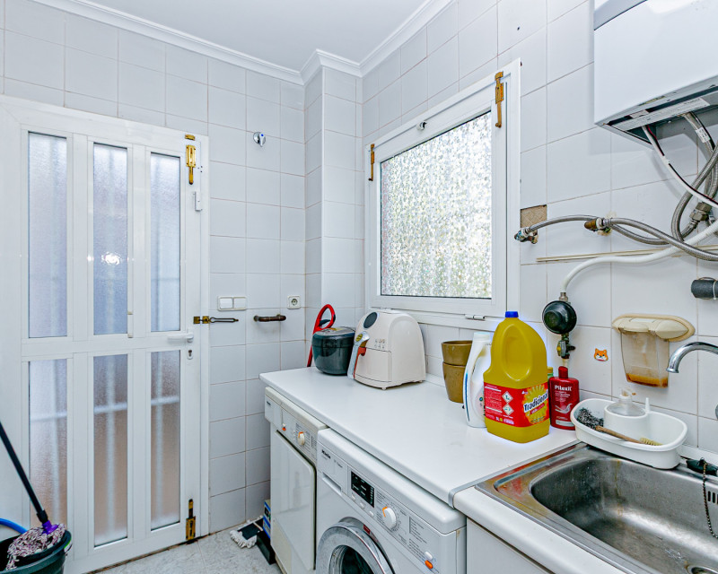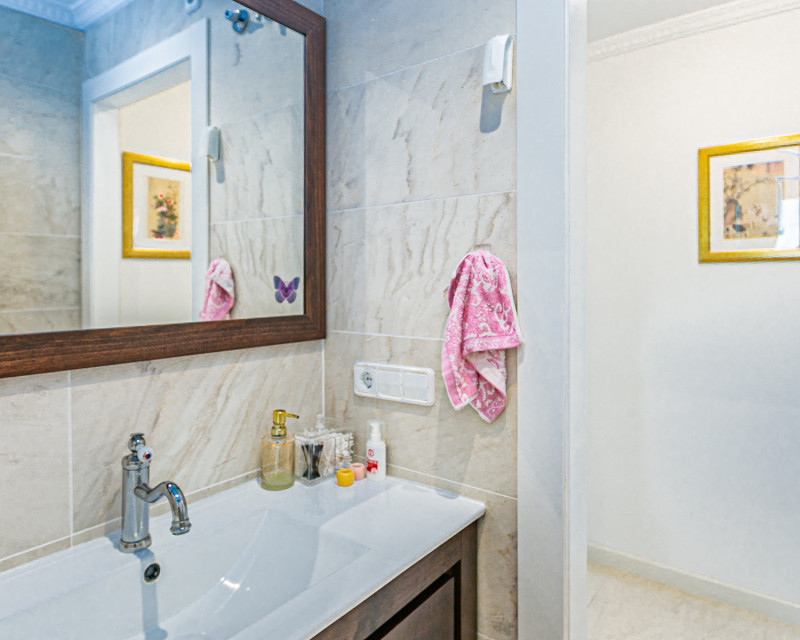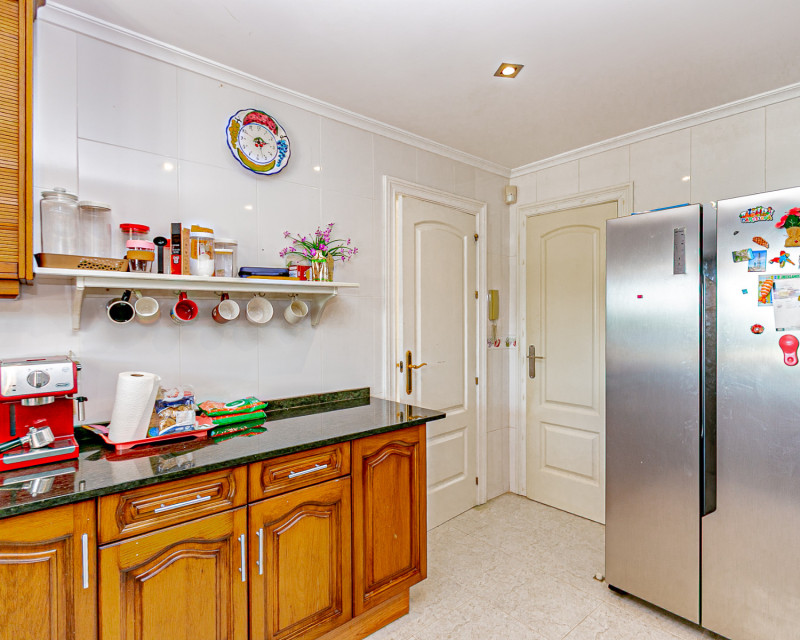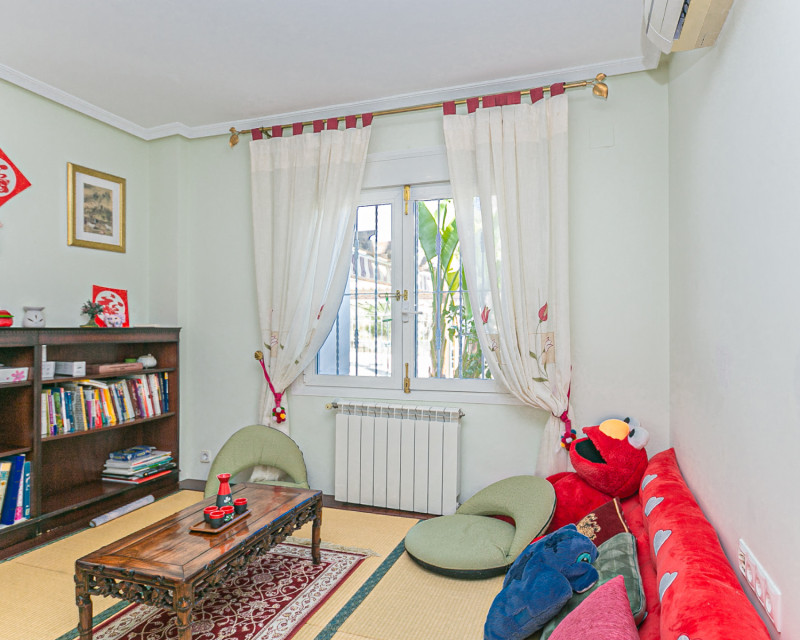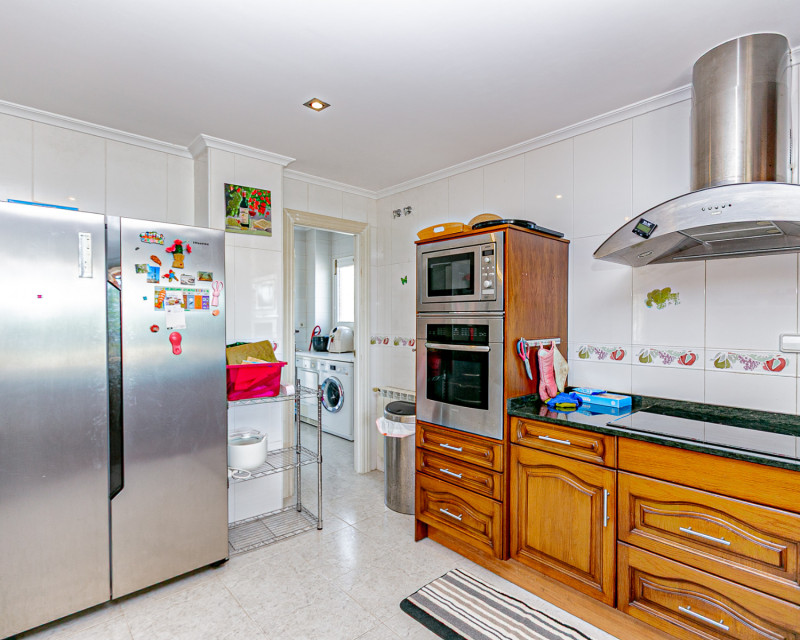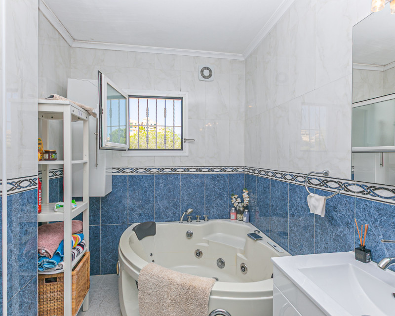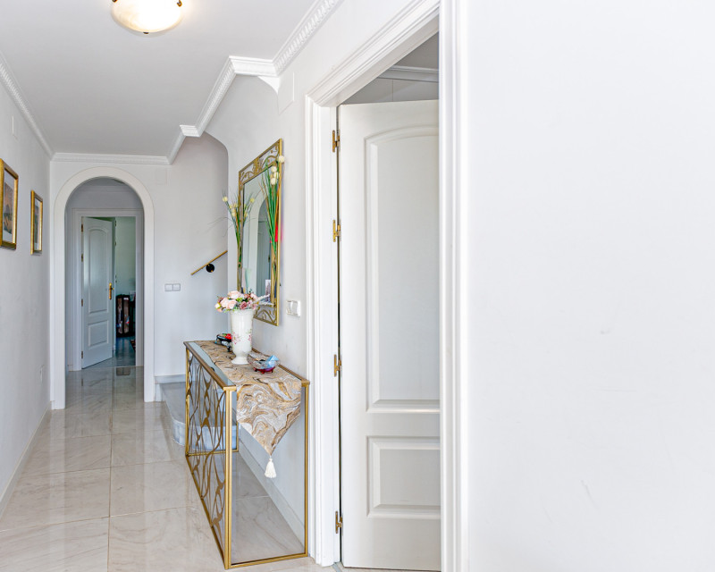 We are delighted to present this magnificent 4-bedroom, 2.5-bathroom villa, located on the frontline of the prestigious Campoamor Golf Course. This unique property, originally with 5 bedrooms, has been carefully modified: one bedroom was sacrificed to enlarge the living-dining area, creating a brighter, more spacious, and welcoming environment. The villa sits on a 604 m² corner plot, offering privacy and unbeatable views of the golf course. It is within walking distance of the clubhouse and the popular La Fuente commercial centre, which offers a wide variety of restaurants, bars, cafés, supermarkets, and services. On the ground floor, there is a spacious and elegant entrance hall from the covered front terrace, a fully fitted independent kitchen with high-quality appliances (including some by Miele), laundry room and pantry. The recently renovated living-dining room features a wood-burning fireplace, a partially marble-clad wall, and large windows that flood the space with light. This floor also includes a modernised guest toilet and a double bedroom currently used as a traditional tea room. The first floor offers three double bedrooms with fitted wardrobes. The master bedroom features double wardrobes, en-suite bathroom with shower and jacuzzi bath, and direct access to a shared terrace overlooking the golf course. Another double bedroom also opens onto this terrace, while a third double bedroom enjoys its own private terrace. There is also a family bathroom with shower. Outside, the property boasts a tiled low-maintenance garden, a beautiful fruit tree at the entrance, a private 9 x 4.8 m swimming pool with sunbathing area, shaded off-road parking, private garage, and several terraces with open views of the natural surroundings. Additional features include: Hot and cold air conditioning throughout Central gas heating Newly tiled ground floor Fully furnished and equipped The property is part of the exclusive Campoamor Golf community, offering exceptional added value: private security, discounts at the restaurant, golf course, and hotel. In addition, the community fee includes irrigation water from the golf course for garden maintenance. A truly unique villa, ideal both as a permanent residence and as a high-level holiday rental, in a privileged location on the Costa Blanca.