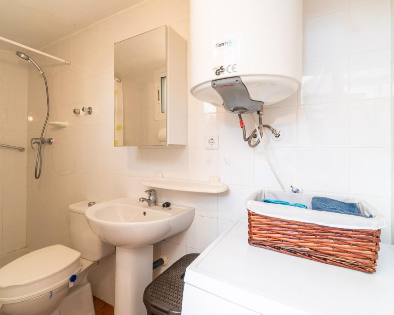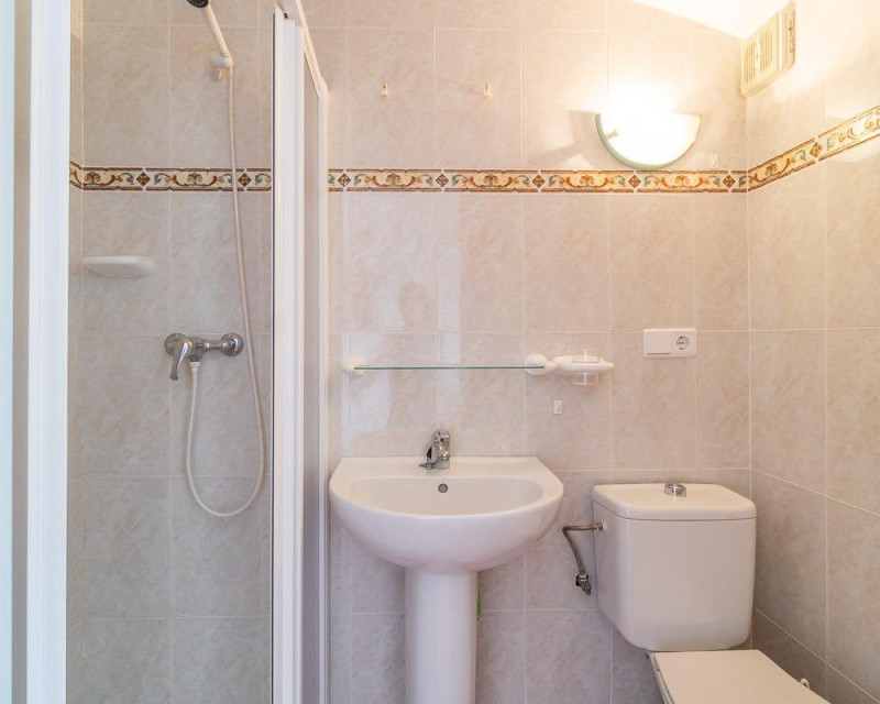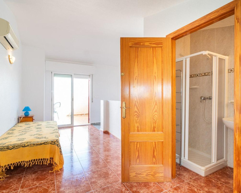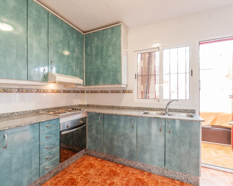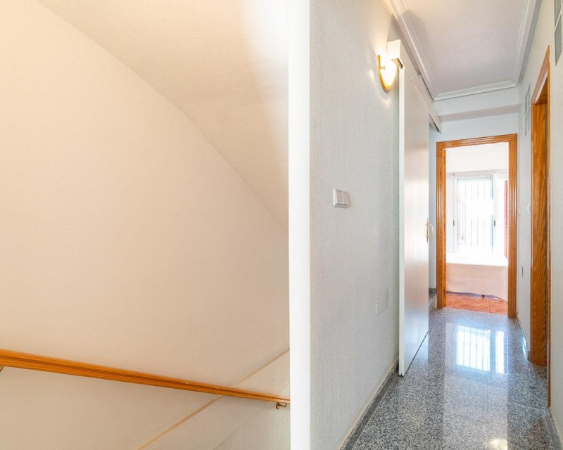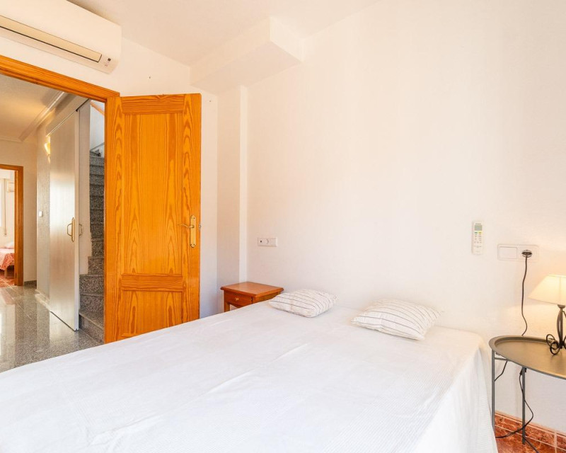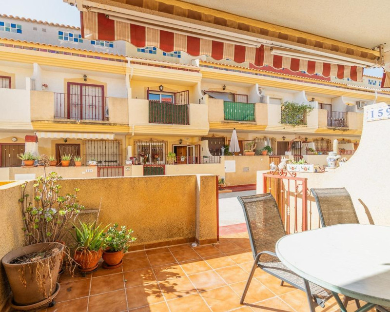 ~1.997 / 5.000~In the heart of Playa Flamenca, just a short walk from the Zenia Boulevard shopping center, beaches, sports facilities, leisure areas, and schools, you'll find this beautiful and bright south-facing semi-detached triplex.~~The property is located within a gated community with automatic gates, ample parking on the access streets, and a central communal pool area, offering privacy and peace from noise and traffic. Its south-facing orientation ensures sunshine practically all day long, and it also features a solarium at the rear, providing shade during the summer months when the front of the house is too hot. A terrace at the front entrance offers year-round sun enjoyment. The house features a living-dining room with a fireplace, a separate kitchen allowing for cooking with the door closed and preventing cooking smells and grease from spreading to the rest of the house, and direct access from the kitchen to a covered patio with an aluminum and glass roof. This patio can be used as a second living room, a laundry room, or even a bedroom for those who cannot access the upper floors, as it includes a bathroom with a shower. The first floor, accessed via an internal staircase, comprises two bedrooms with built-in wardrobes, one of which has a balcony, and a full bathroom with a walk-in shower. The third and top floor offers a third attic bedroom with an en-suite bathroom and shower, perfect for children or teenagers, as it features a solarium-terrace accessible only from this level. The house is furnished, includes all kitchen appliances, and is in perfect working order, ready for immediate occupancy. Whether as a holiday home or for year-round living, it's worth a visit to discover its many advantages and uses.