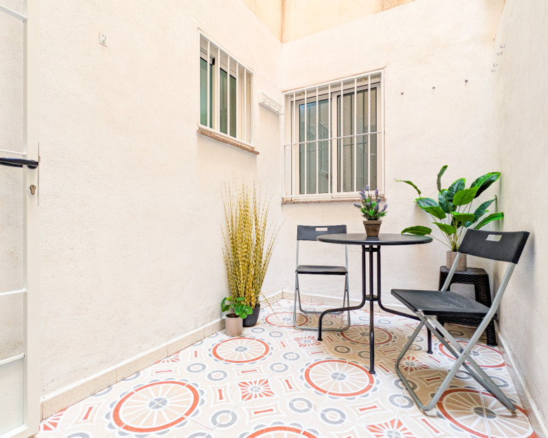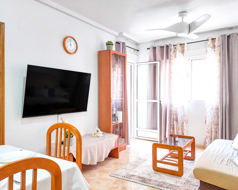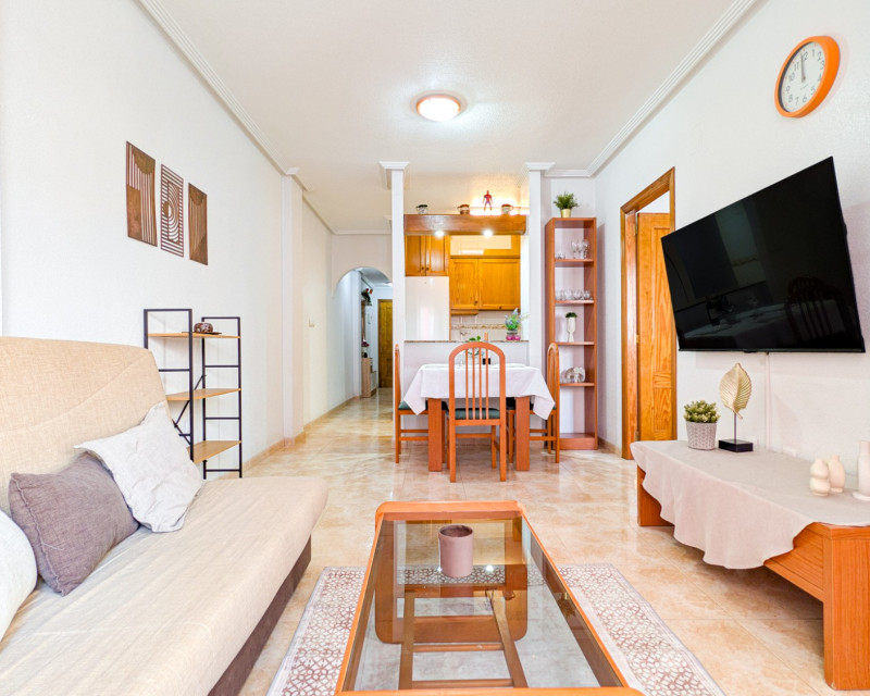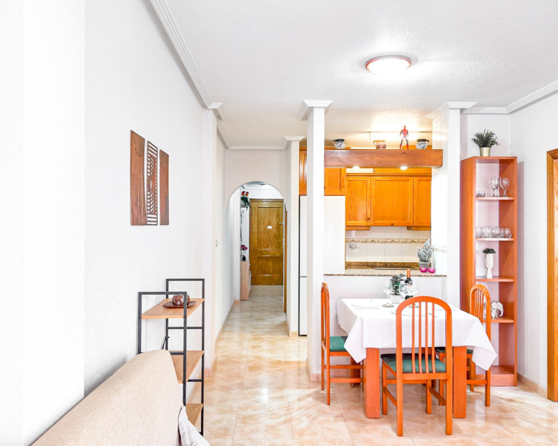 Discover a highly attractive holiday apartment featuring 2 bedrooms, 1 bathroom, and a sunny balcony – perfectly located within walking distance of both the beach and the marina in Torrevieja. In addition to the balcony, the property offers a private patio, ideal for outdoor dining, relaxing or as convenient storage for bicycles or golf equipment. A valuable feature whether you are looking for a holiday home or a comfortable year-round residence. Layout and Features The apartment is situated on the first floor of a building equipped with a lift. The community offers a communal swimming pool with seating areas, perfect for relaxing days in the sun. You are welcomed by a spacious entrance hall with storage for coats and shoes. To the left is the master bedroom with a large built-in wardrobe. The bathroom is bright and spacious, with a bathtub and window, providing natural light and ventilation. The kitchen has excellent storage space and direct access to both the laundry area and the private patio. A breakfast bar opens up to the living room, creating a social layout. The second bedroom and the balcony are accessed from the living room. Views, Park Areas and Communal Spaces The building also offers a communal rooftop terrace, where you can enjoy sunshine and lovely views throughout the day. The property is located next to the popular Parque de las Naciones, a beautifully designed park with playgrounds, ponds and walking paths. Colourful birds move freely in the area – and it is not unusual to spot a rooster just outside the entrance. During the summer months, the park hosts concerts and various events, all visible from the rooftop terrace. Prime Location Near the Beach, Marina and Town Centre With walking distance to the beach (approx. 900 m), the marina and the vibrant centre of Torrevieja, the apartment enjoys an exceptional location close to restaurants, bars, shops, services and cultural activities. Property Details Built area: approx. 70 m² Usable area: approx. 58 m² Orientation: East Community fee: approx. 36 €/month IBI/property tax: approx. 231 €/year Sold partly furnished About Torrevieja Torrevieja is one of Costa Blanca’s most popular coastal towns, known for its mild climate, beautiful beaches and vibrant atmosphere all year round. The city offers a wide selection of restaurants, cafés, shops and cultural events, as well as a picturesque promenade enjoyed by both locals and visitors. Surrounded by two unique salt lakes, Torrevieja benefits from a microclimate considered one of the healthiest in Europe. It is a perfect place to live, holiday or invest in.